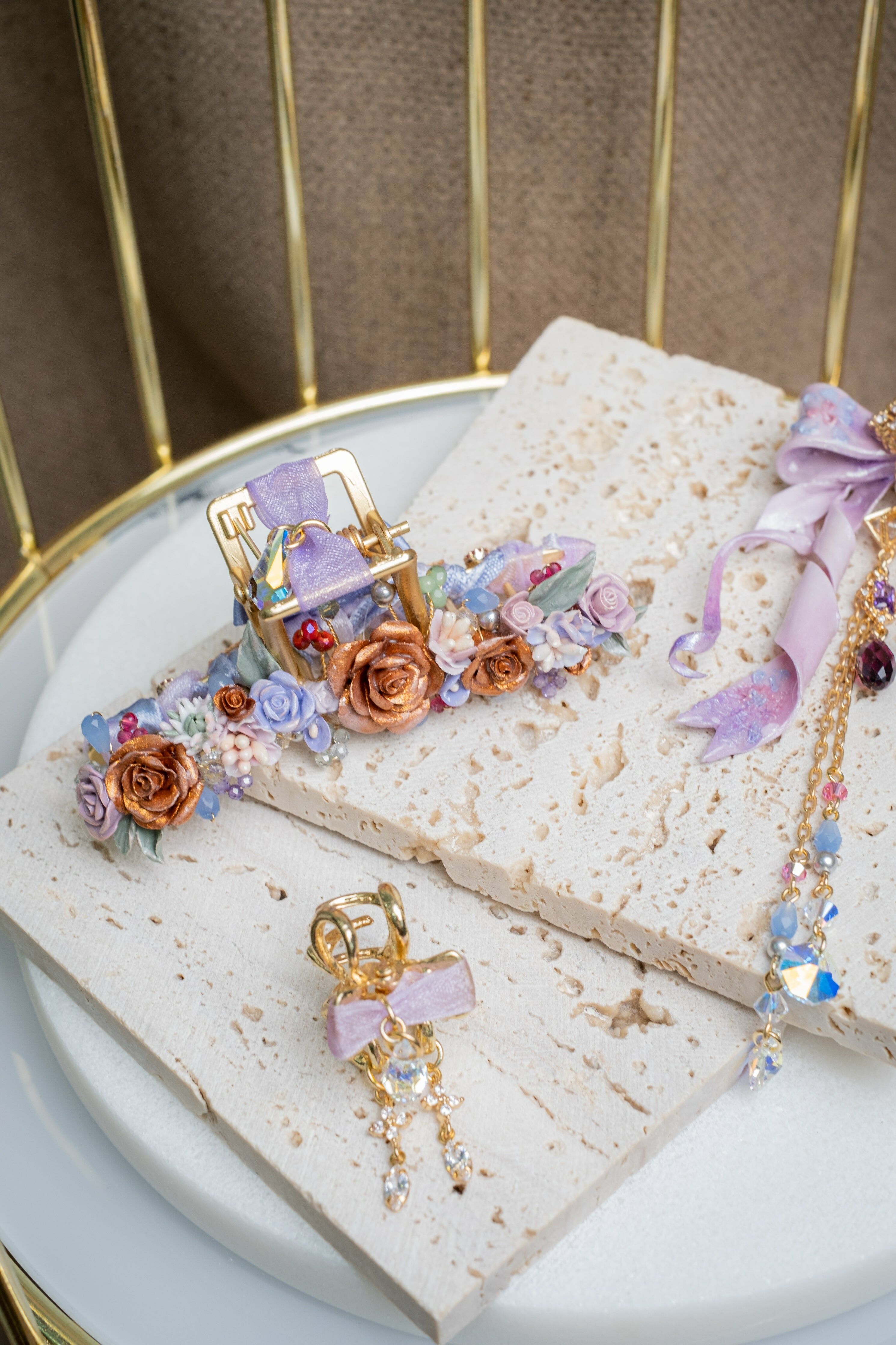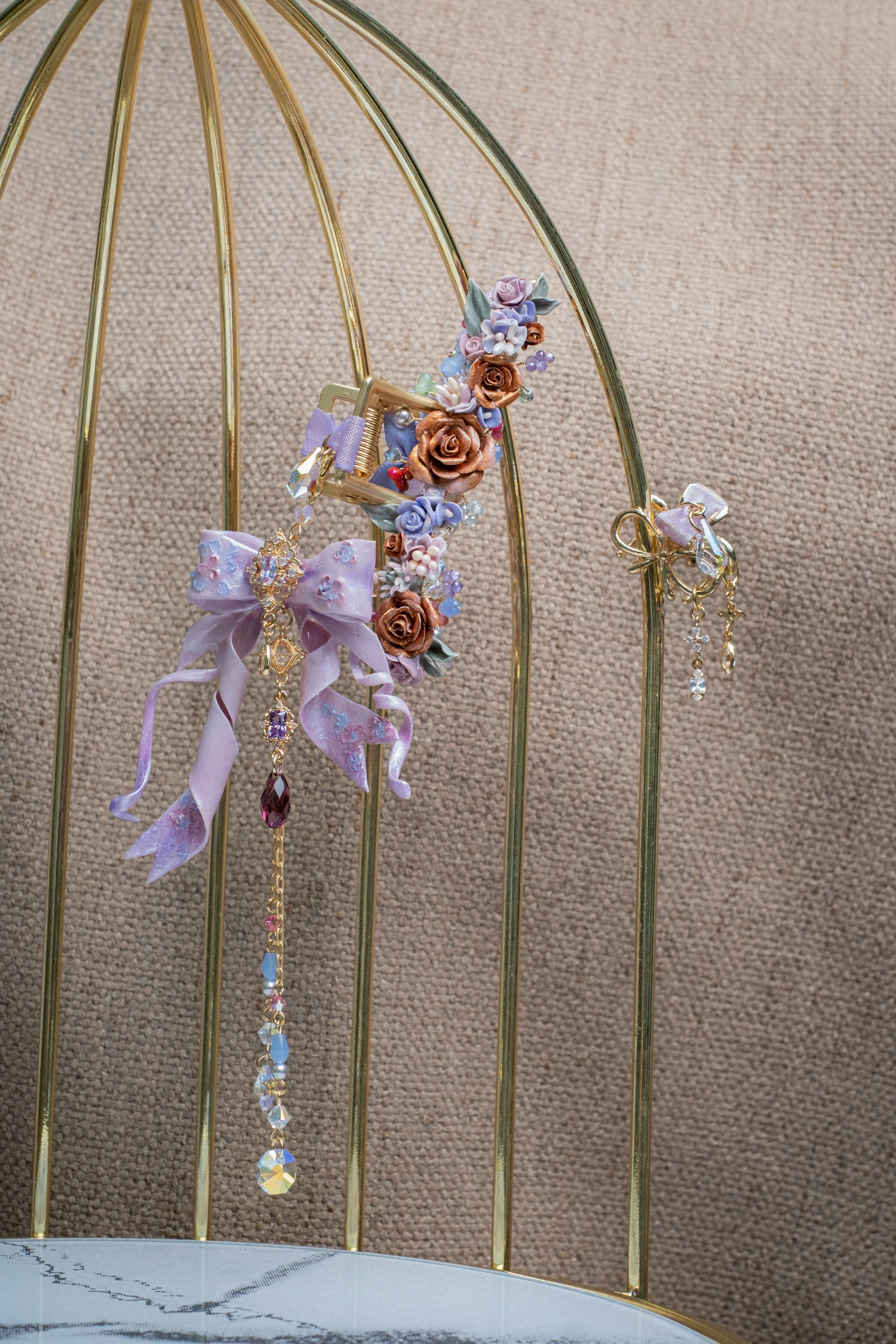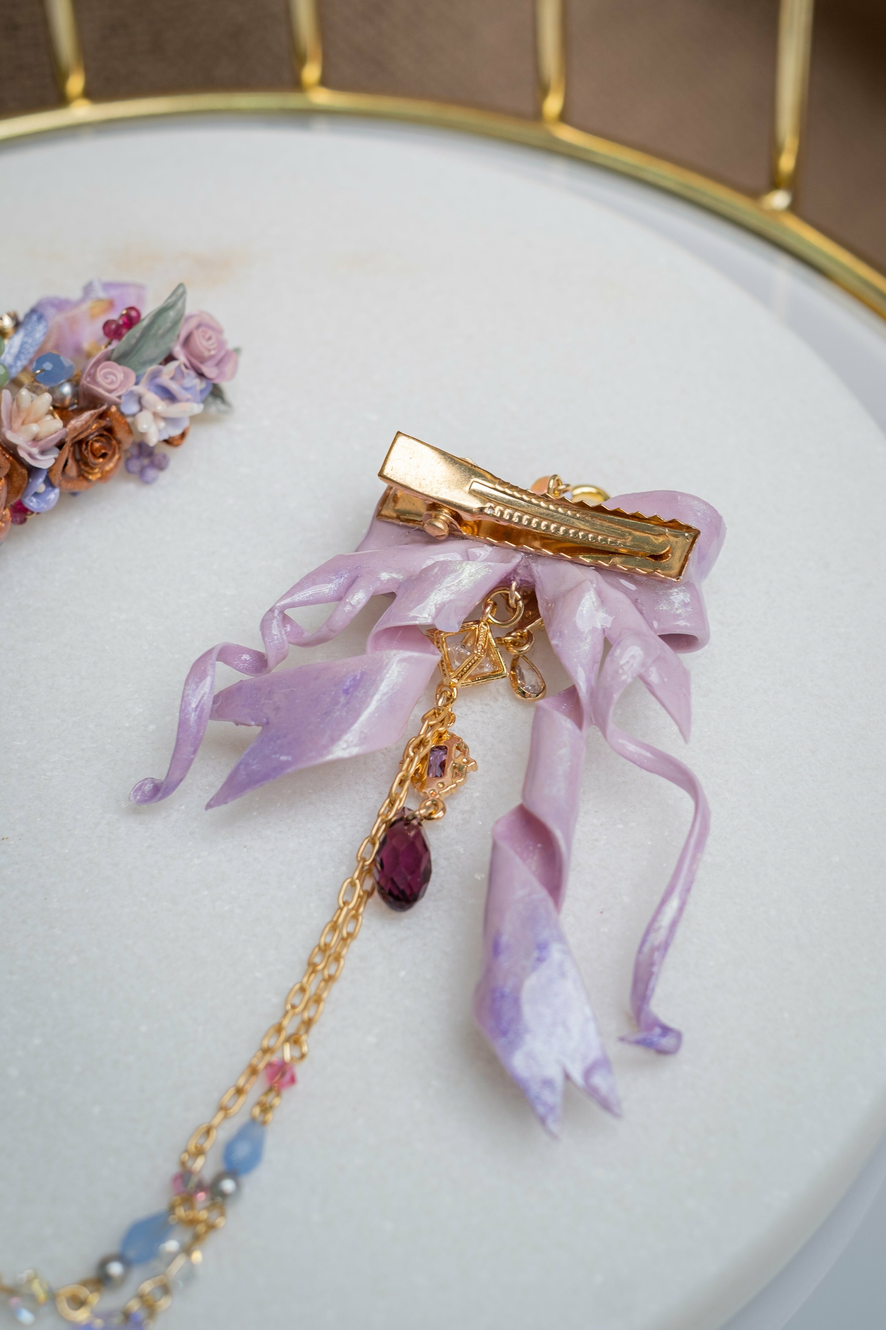14K Gold-plated Metal Clip | Swarovski Crystal | Handcrafted Cold Porcelain Flower | Hardening Resin Coating