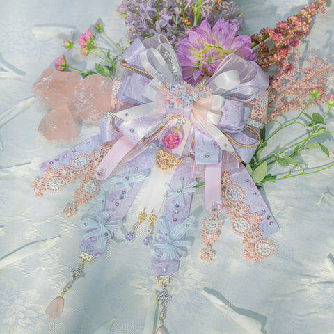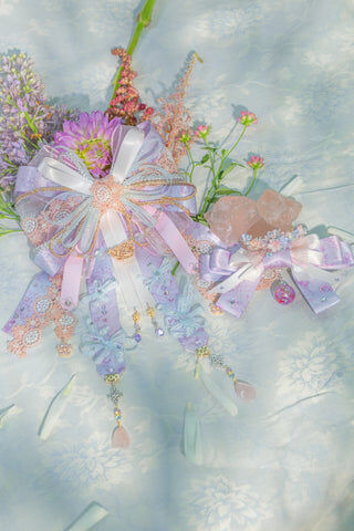 Gold Plated Artistic Wire | Swarovski Crystal | Handcrafted Resin Clay Flowers | UV Hardening Coating | Gold-plated Metal Clip | Pink Lepidolite | Rose Quartz Petal | Aquamarine