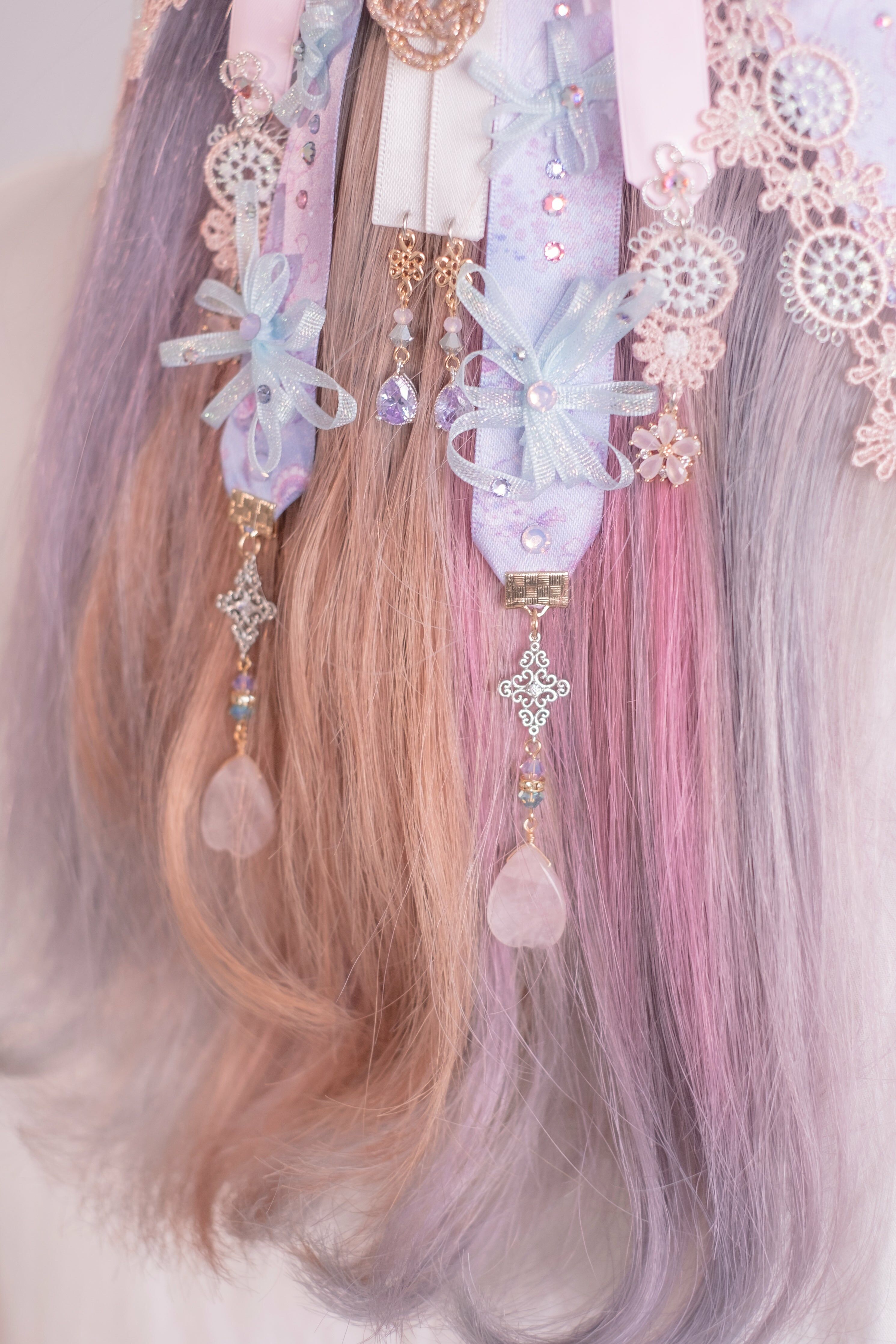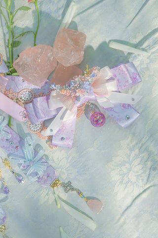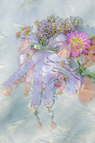 美國進口Beadsmith銀線 | 施華洛世奇水晶 | 手製樹脂黏土花 | UV強化保護層 | 鍍金髮夾 | 粉紅雲母 | 粉晶花瓣 | 海藍寶