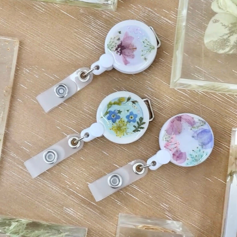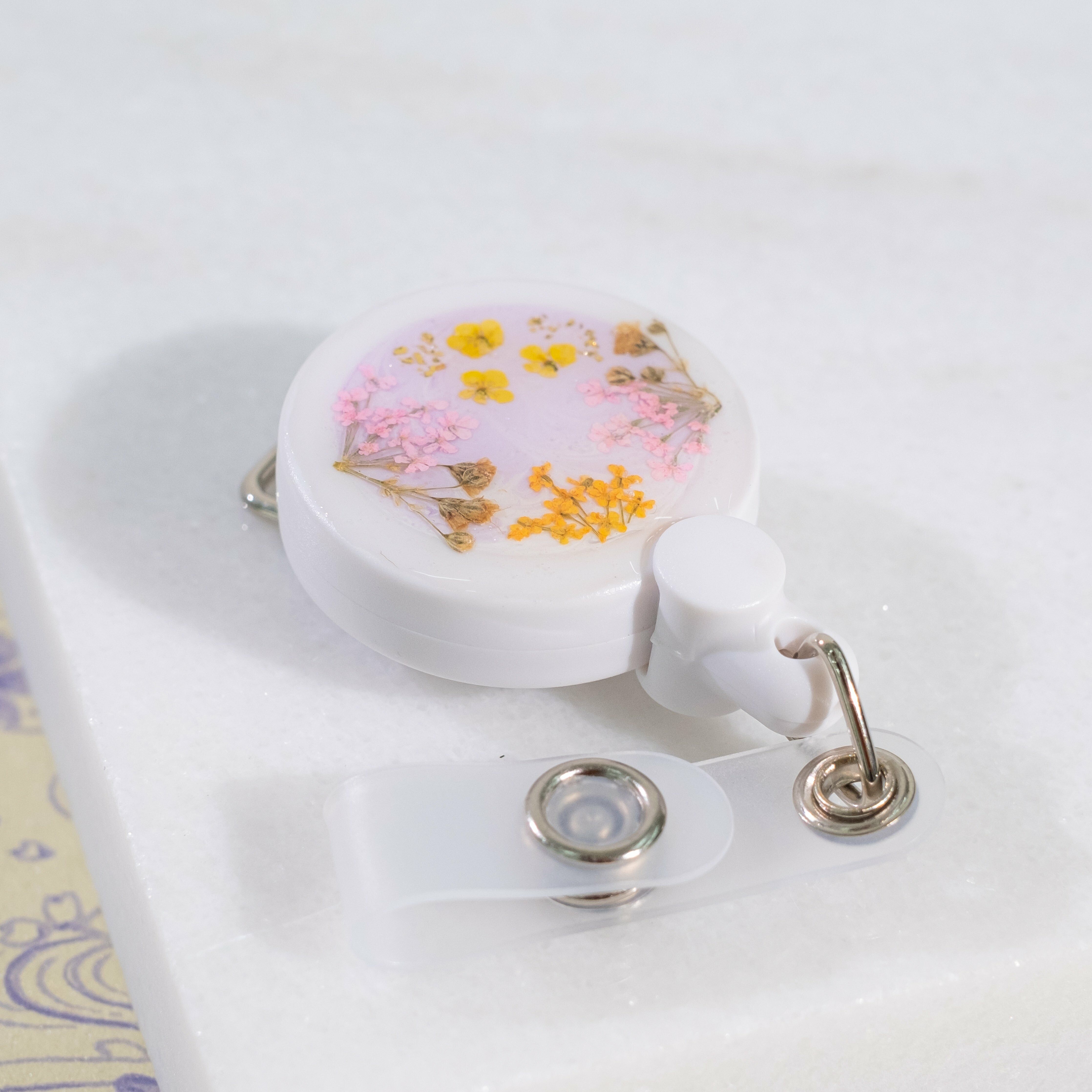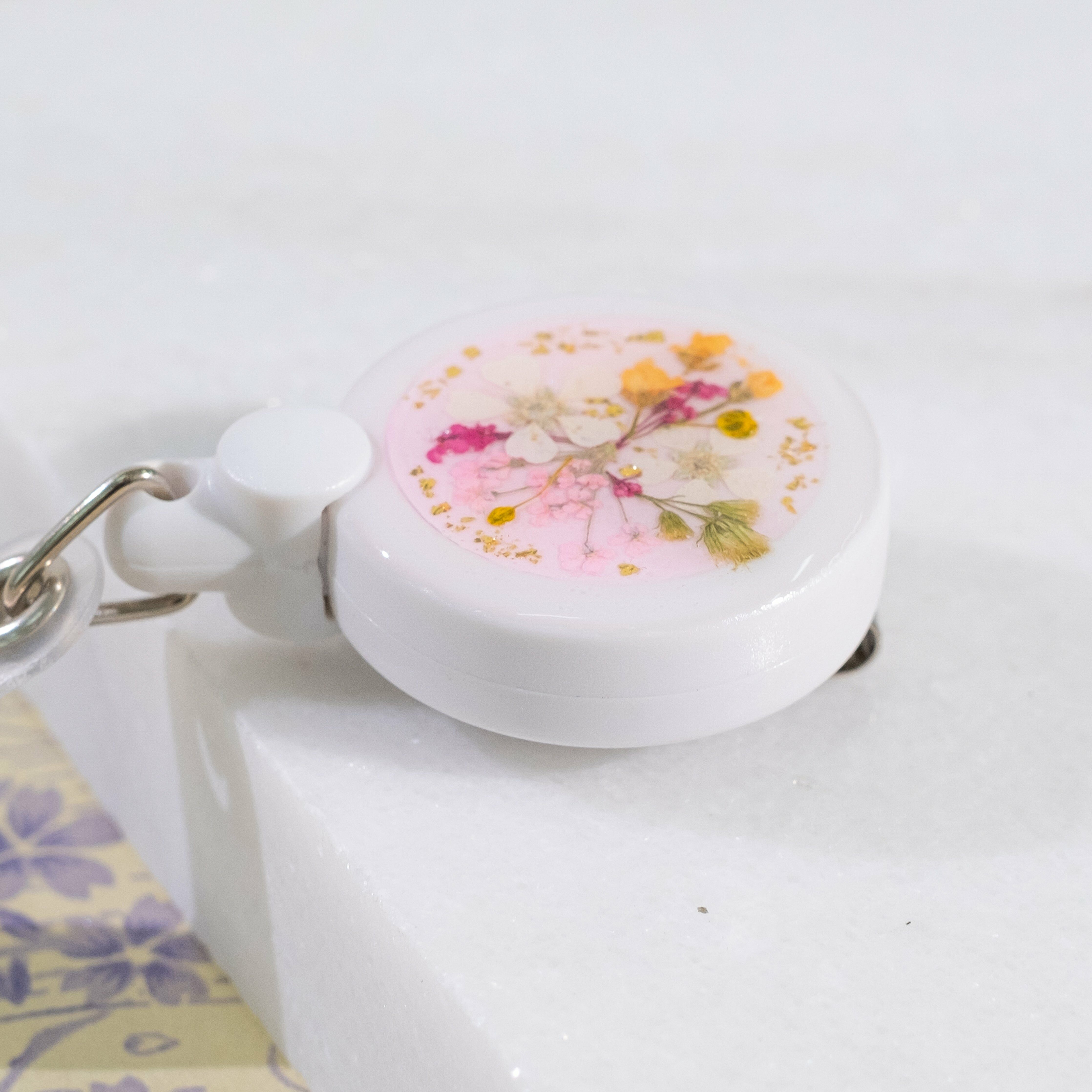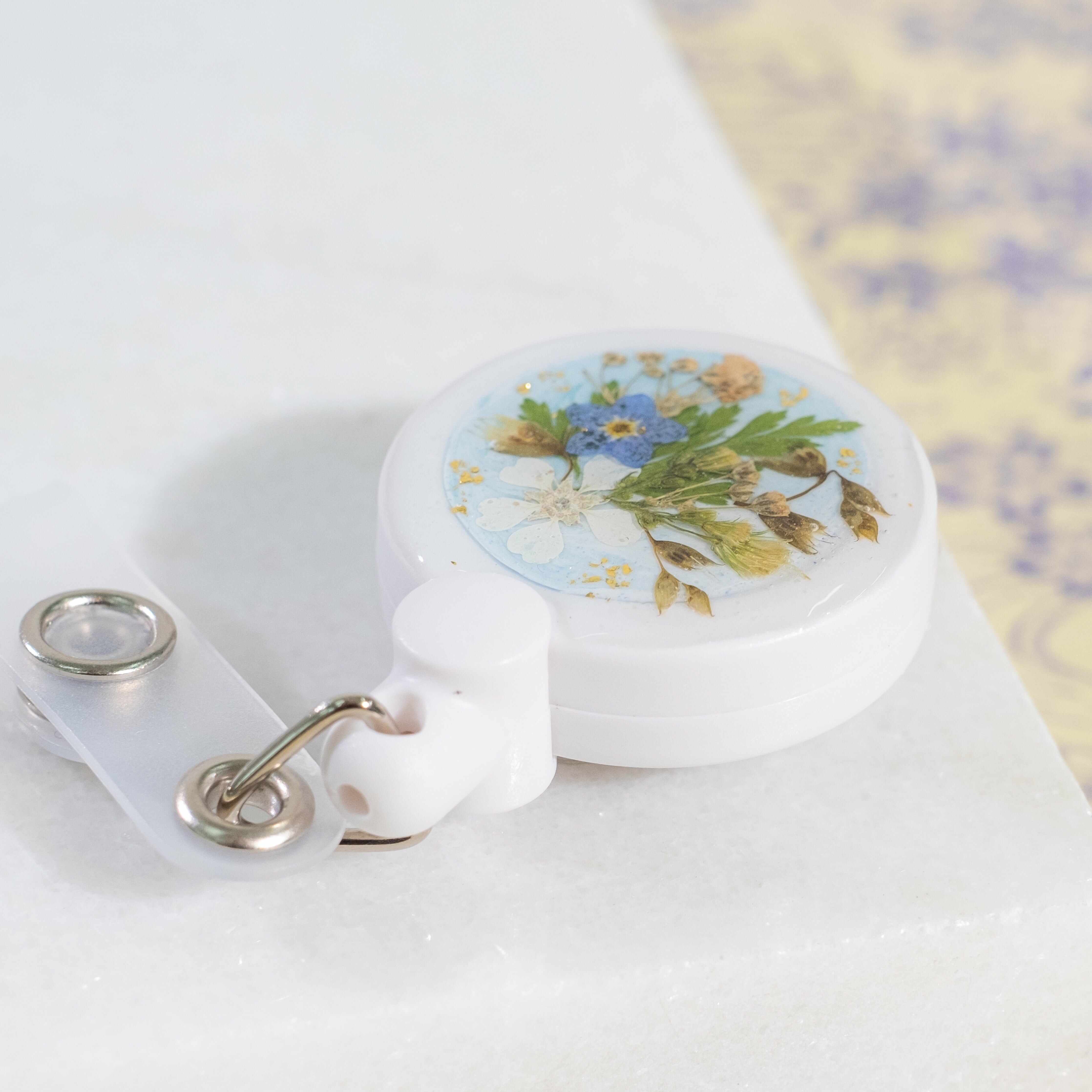 Real flowers preserved in a finely crafted round badge reel. It comes with a belt clip and a clear vinyl strap! Water-proof and durable.