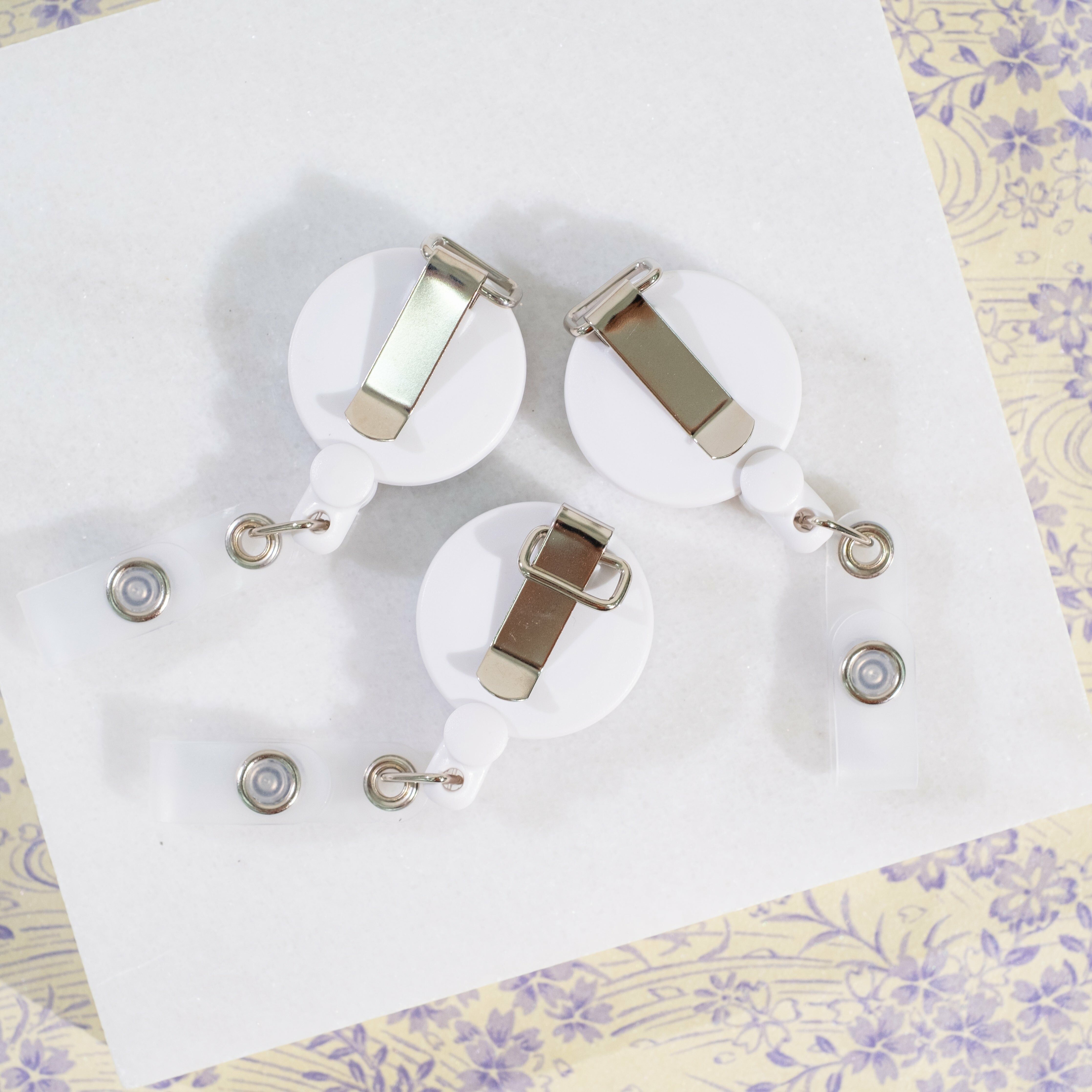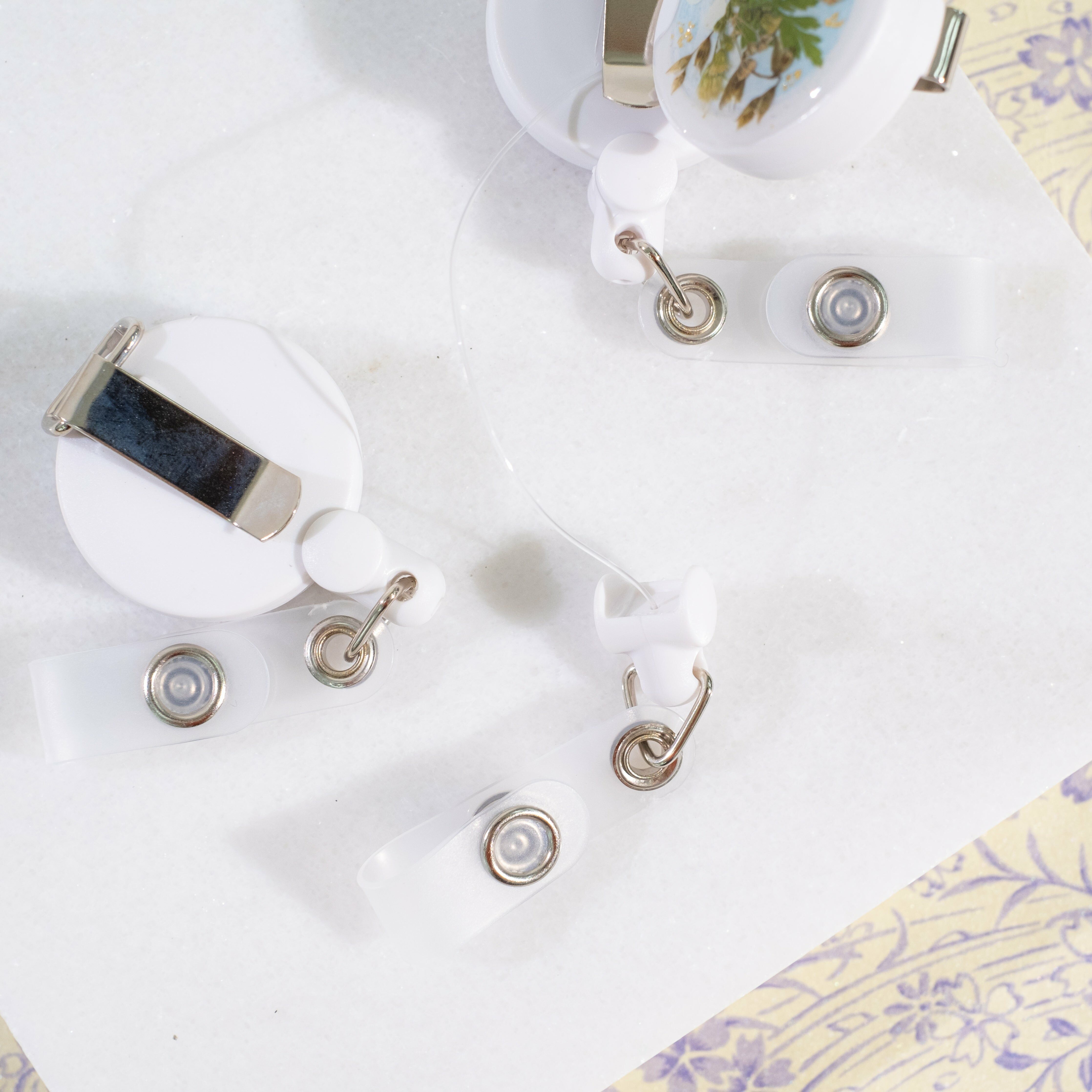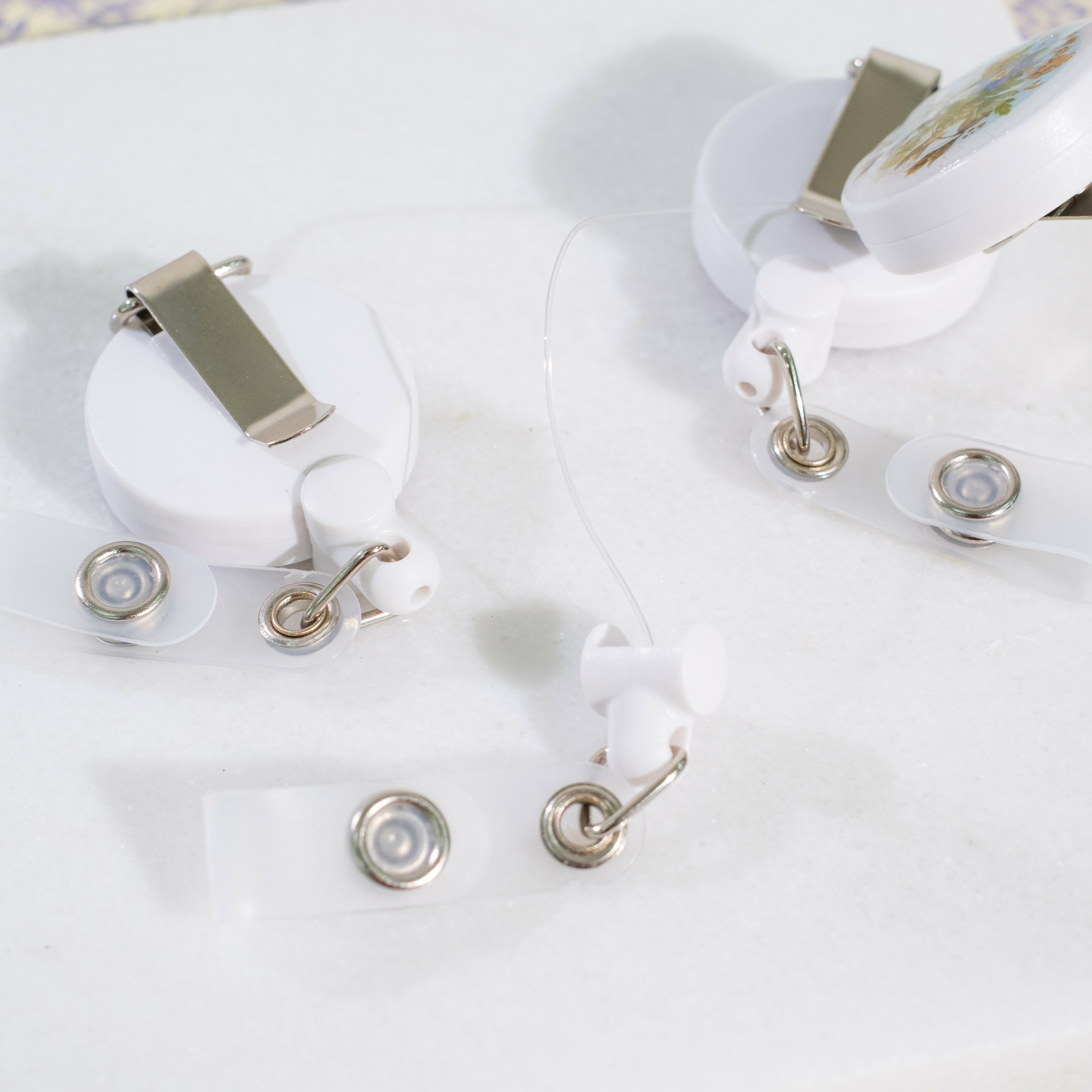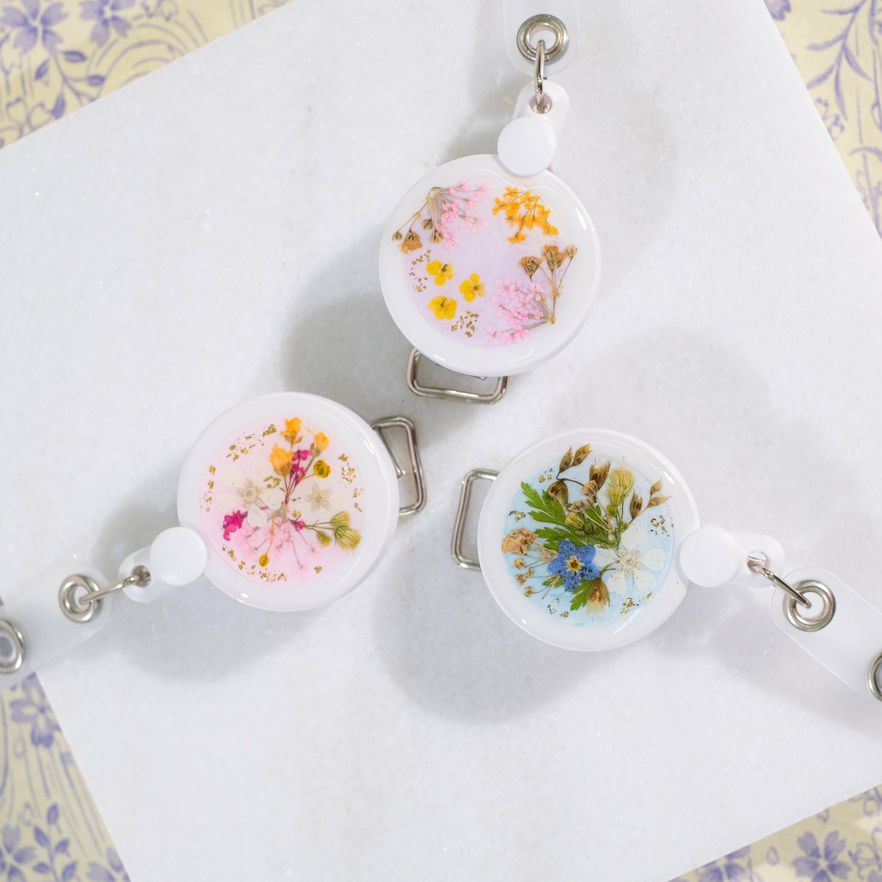 Real flowers preserved in a finely crafted round badge reel. It comes with a belt clip and a clear vinyl strap! Water-proof and durable.