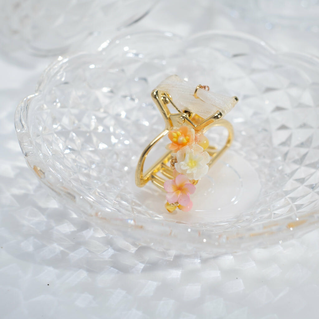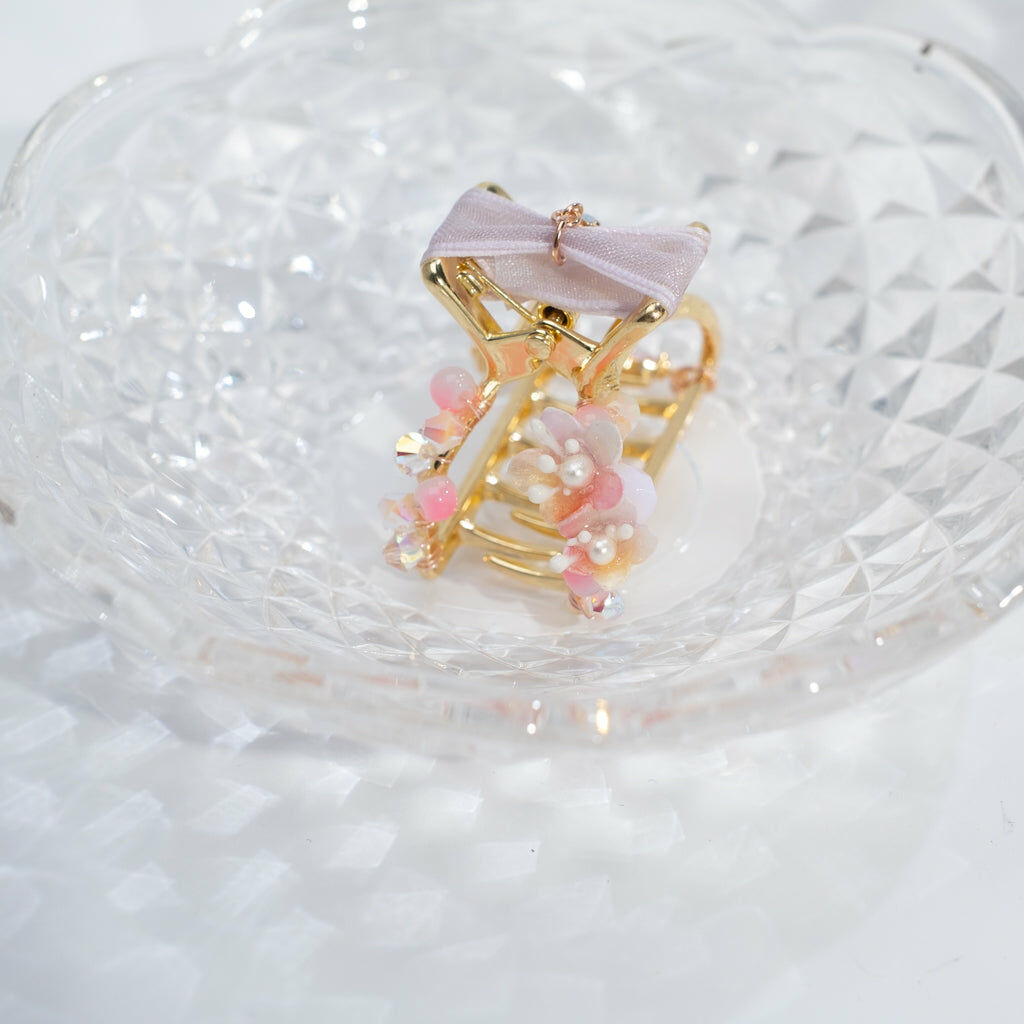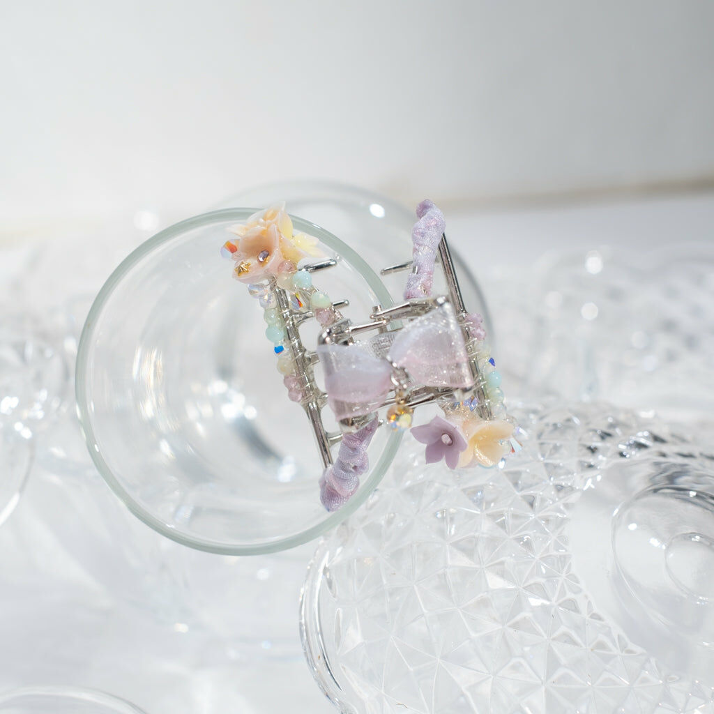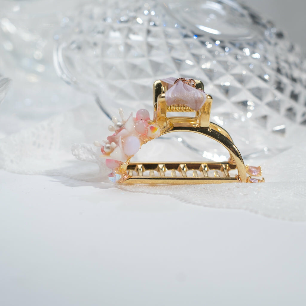 鍍金線 | 施華洛世奇水晶 | 手製樹脂黏土花 | UV膠強化保護層 | 金屬髮夾