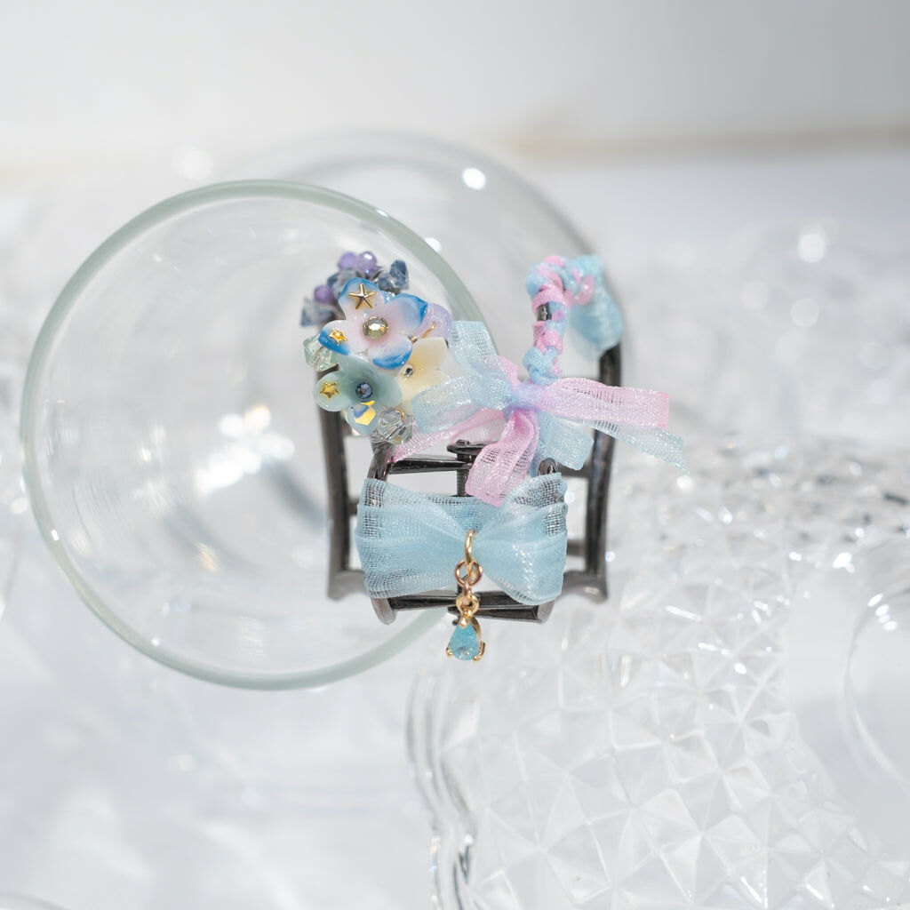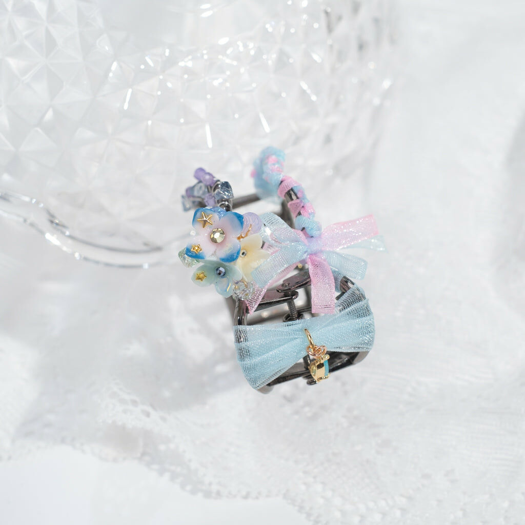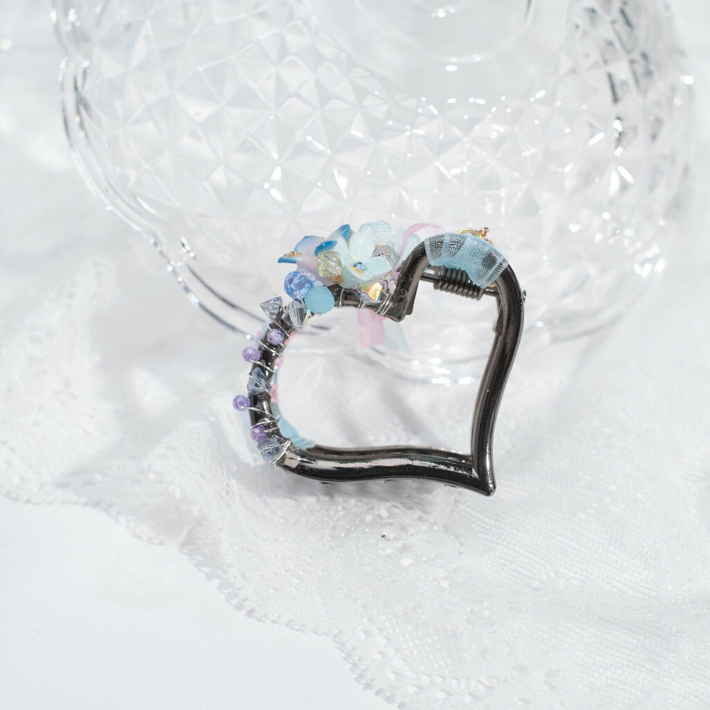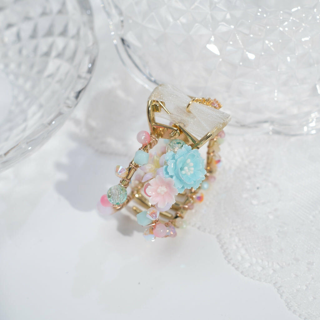 鍍金線 | 施華洛世奇水晶 | 手製樹脂黏土花 | UV膠強化保護層 | 金屬髮夾