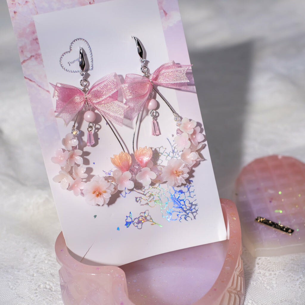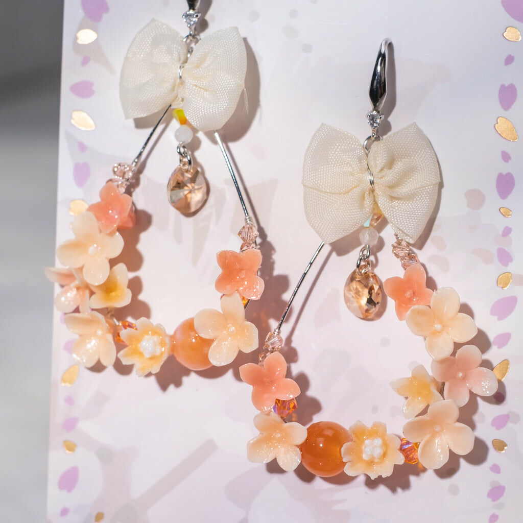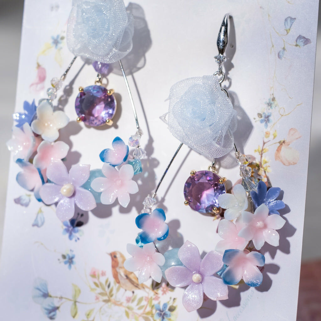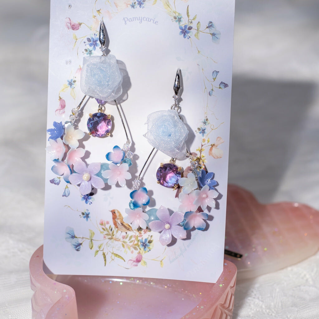 鍍金線 | 施華洛世奇水晶 | 手製樹脂黏土花 | UV膠強化保護層 | 925純銀耳釘