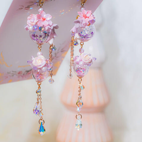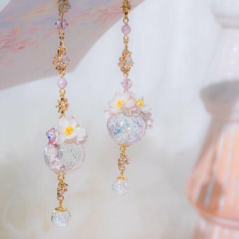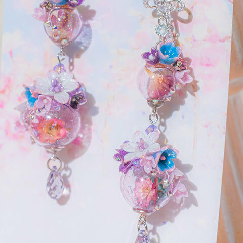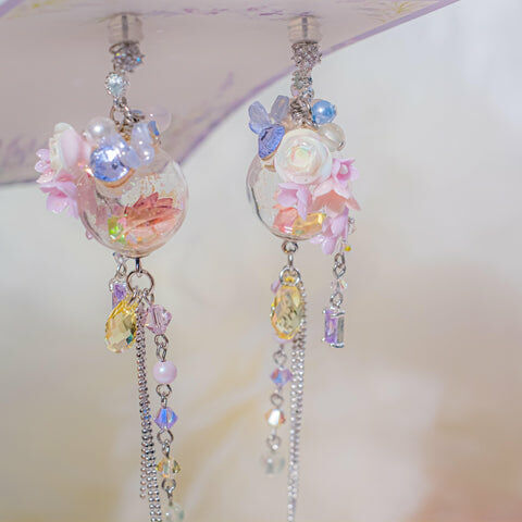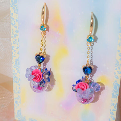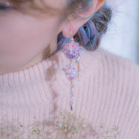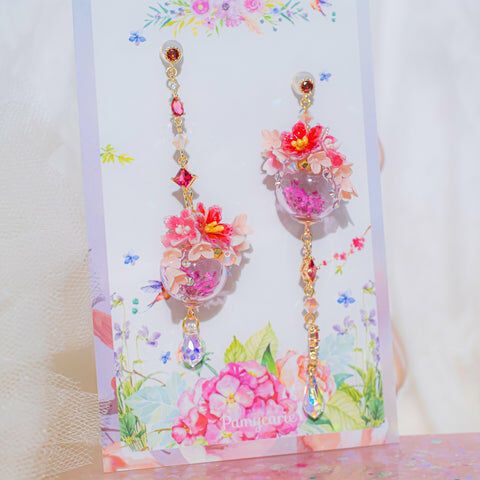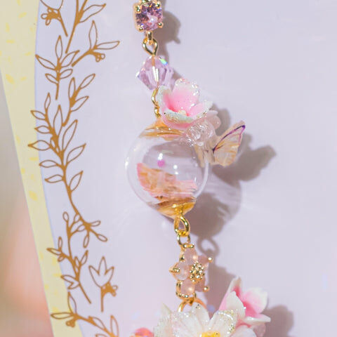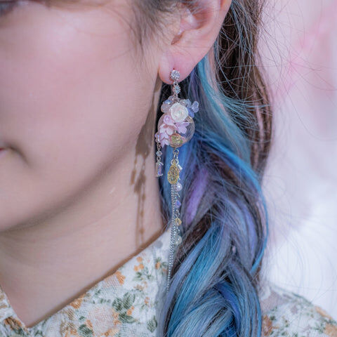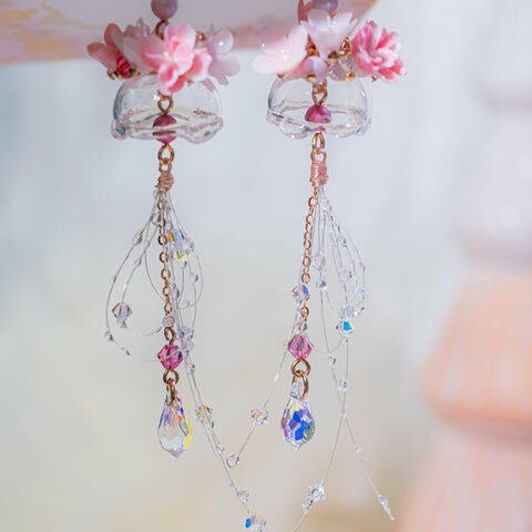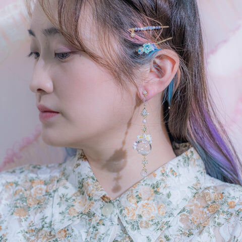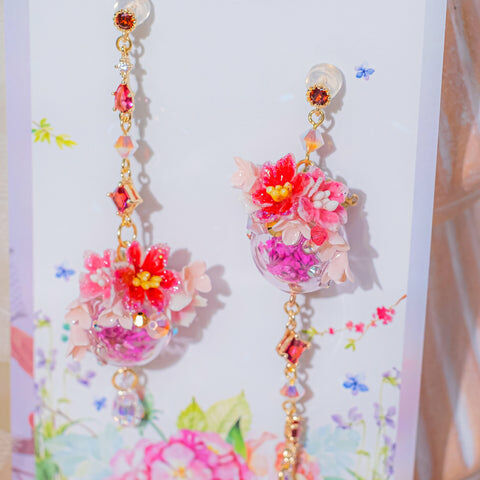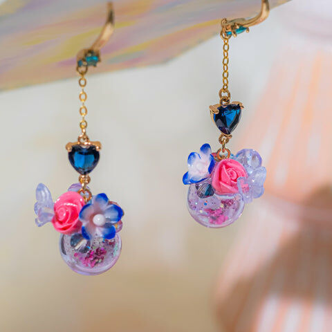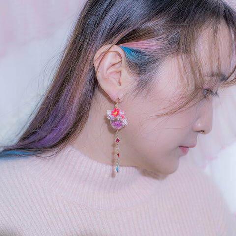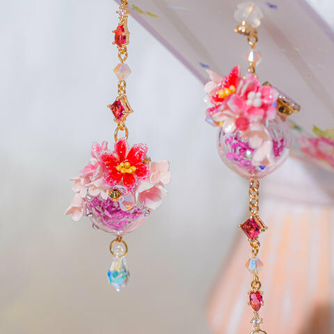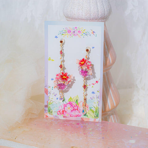 鍍金線 | 施華洛世奇水晶 | 手製樹脂黏土花 | UV膠強化保護層 | 鍍金925純銀耳釘