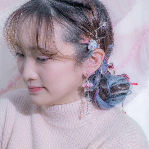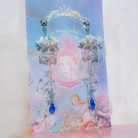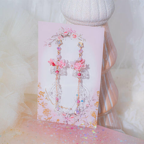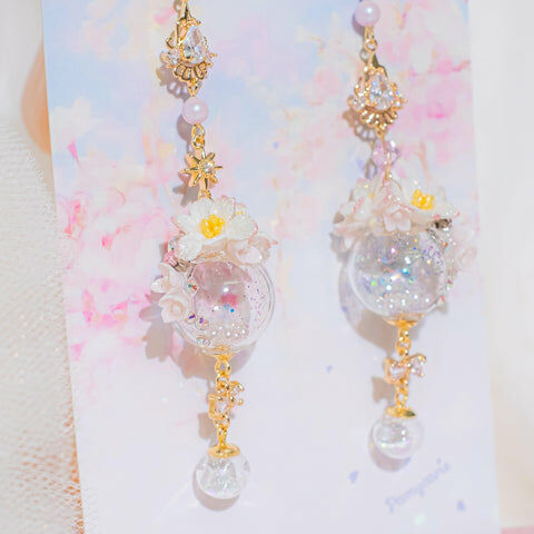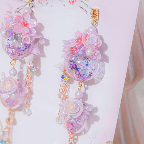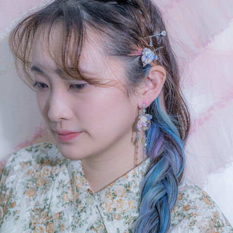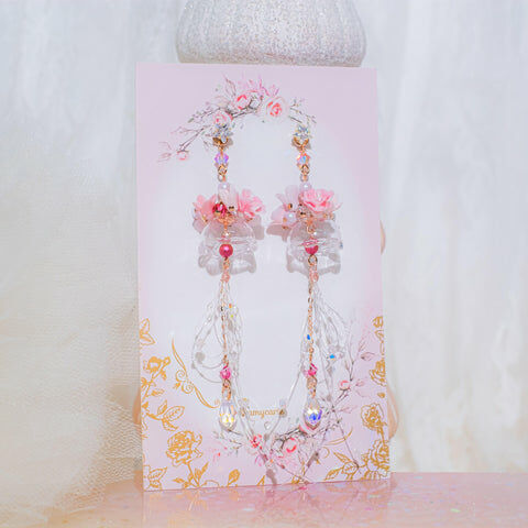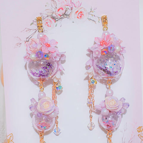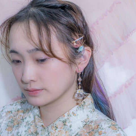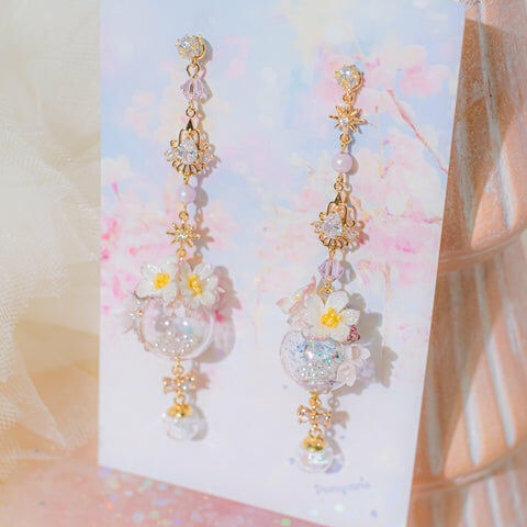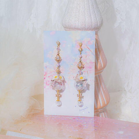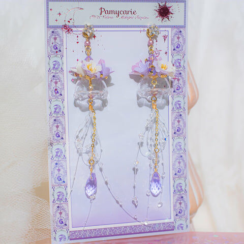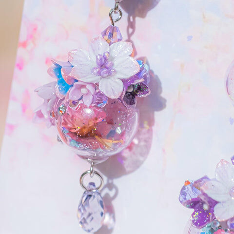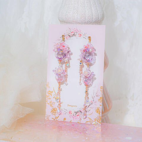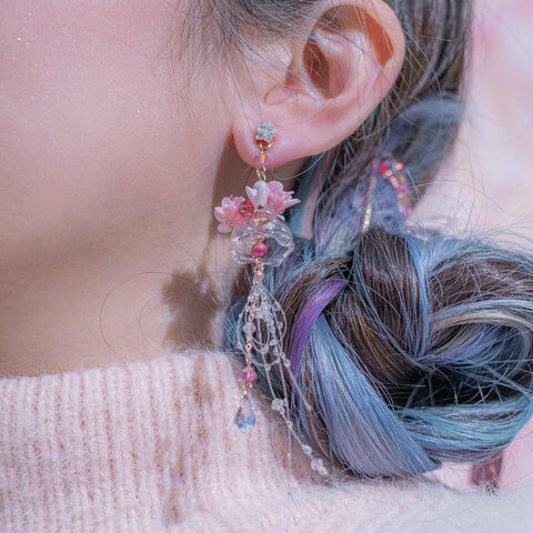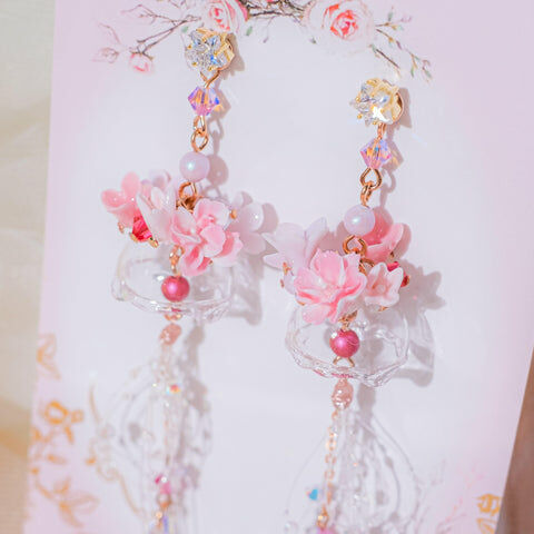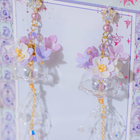 鍍金線 | 施華洛世奇水晶 | 手製樹脂黏土花 | UV膠強化保護層 | 鍍金925純銀耳釘