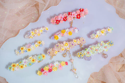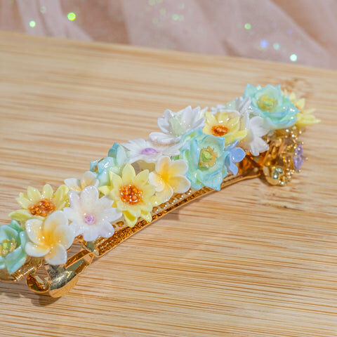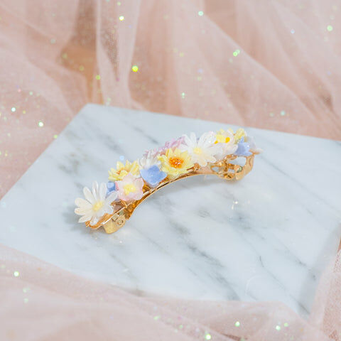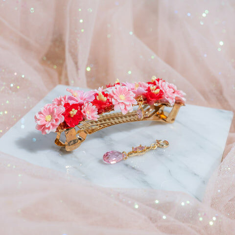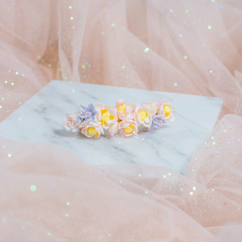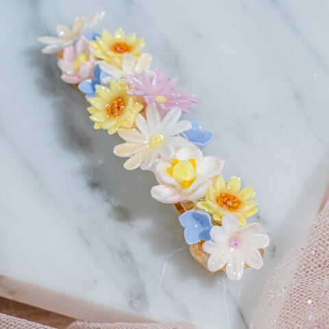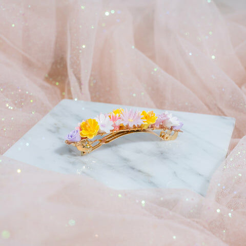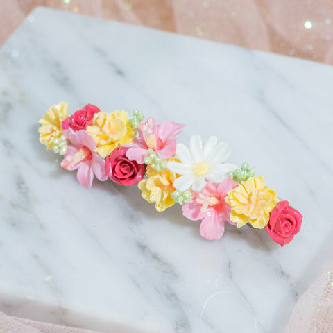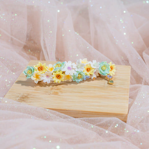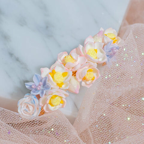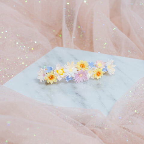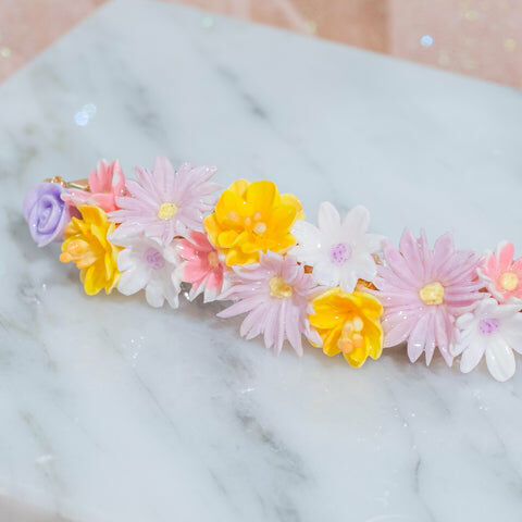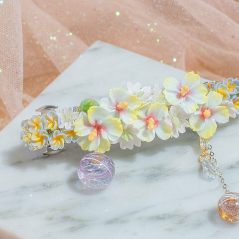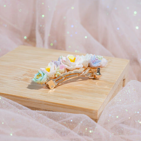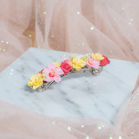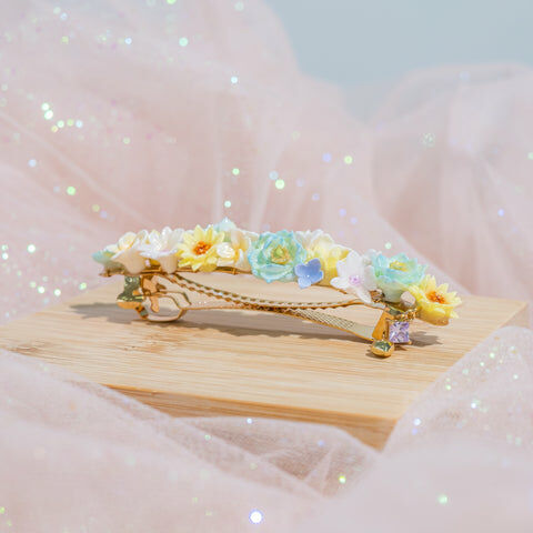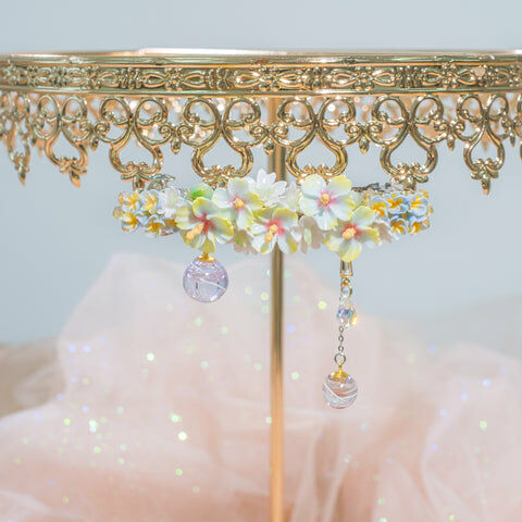 鍍金線 | 施華洛世奇水晶 | 手製樹脂黏土花 | UV膠強化保護層 | 金屬髮夾