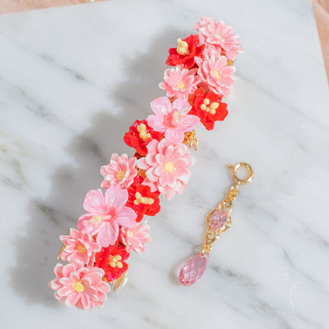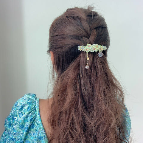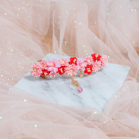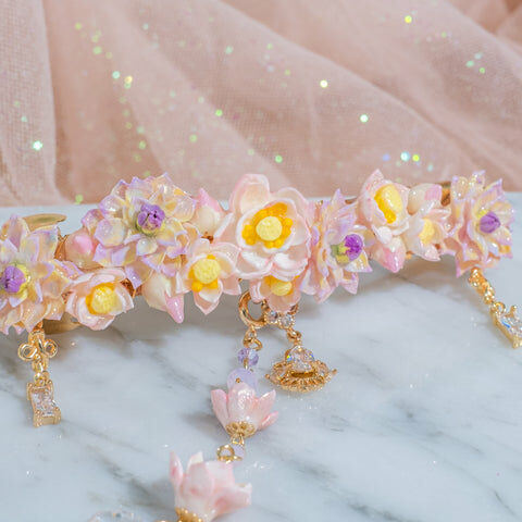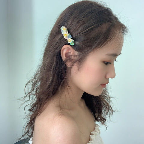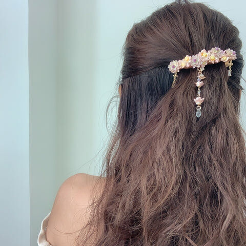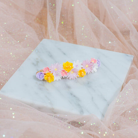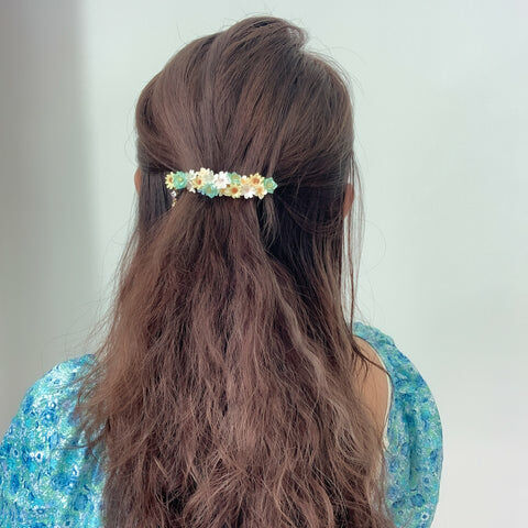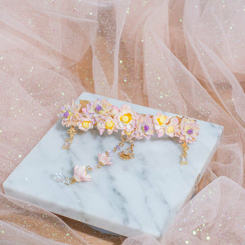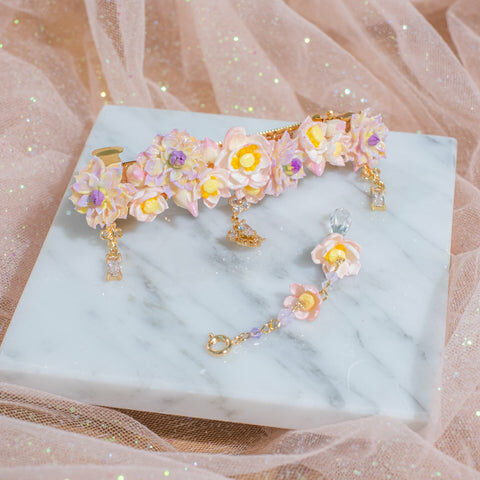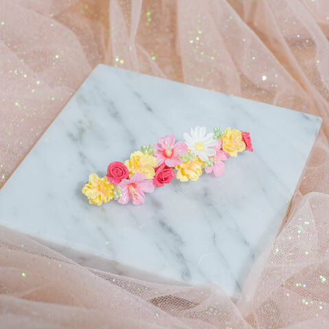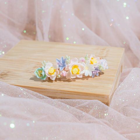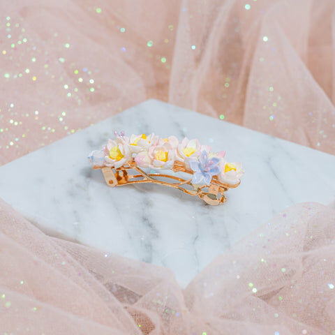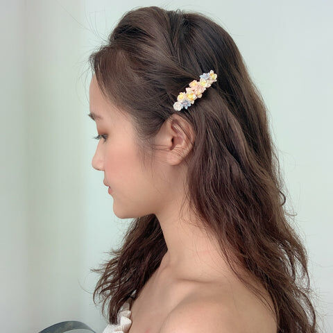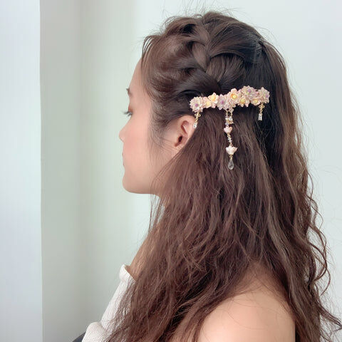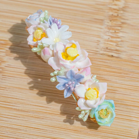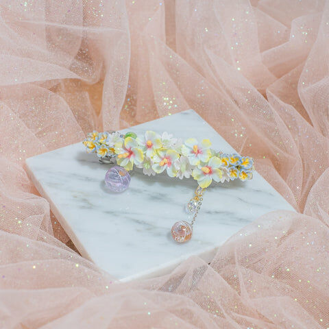鍍金線 | 施華洛世奇水晶 | 手製樹脂黏土花 | UV膠強化保護層 | 金屬髮夾