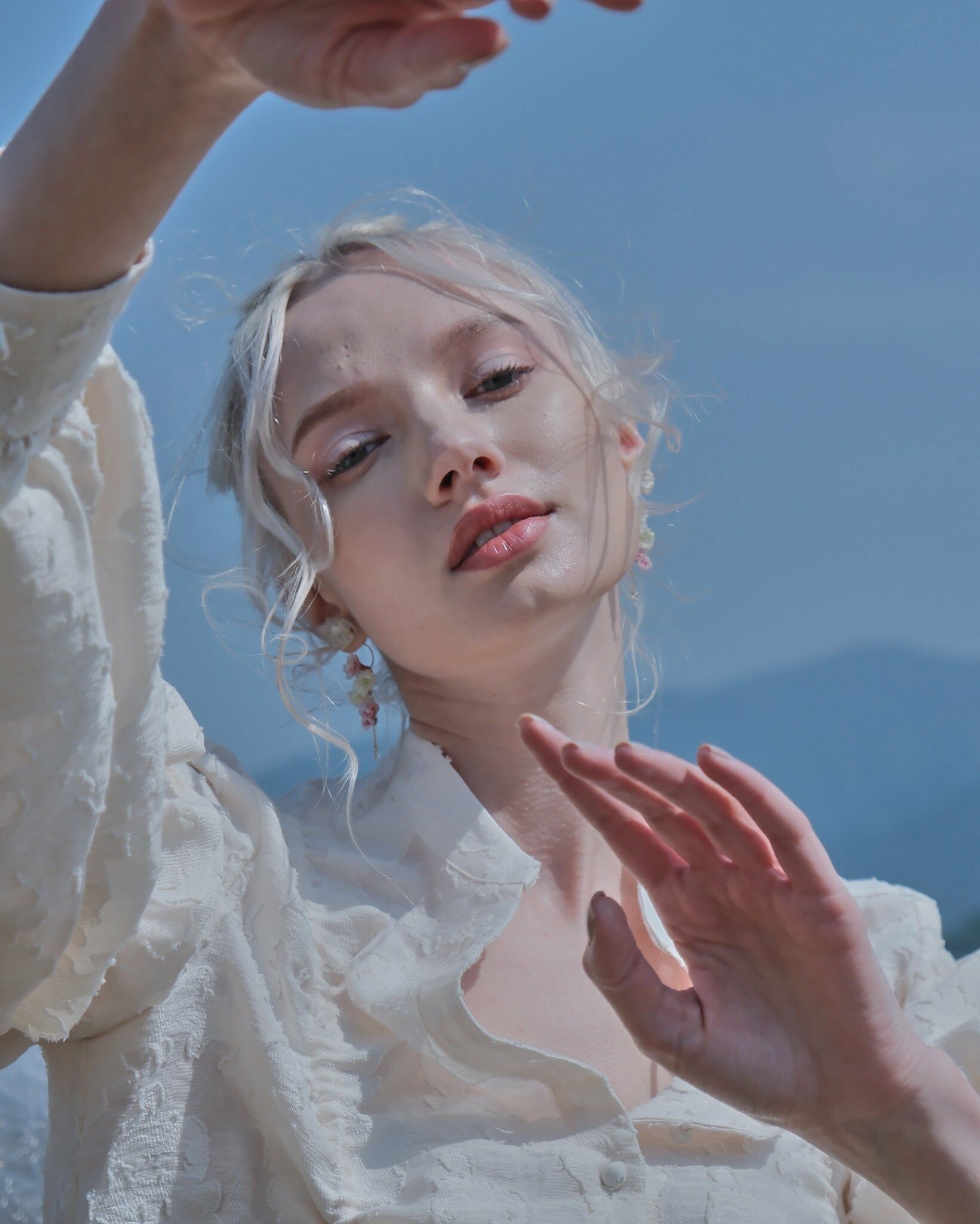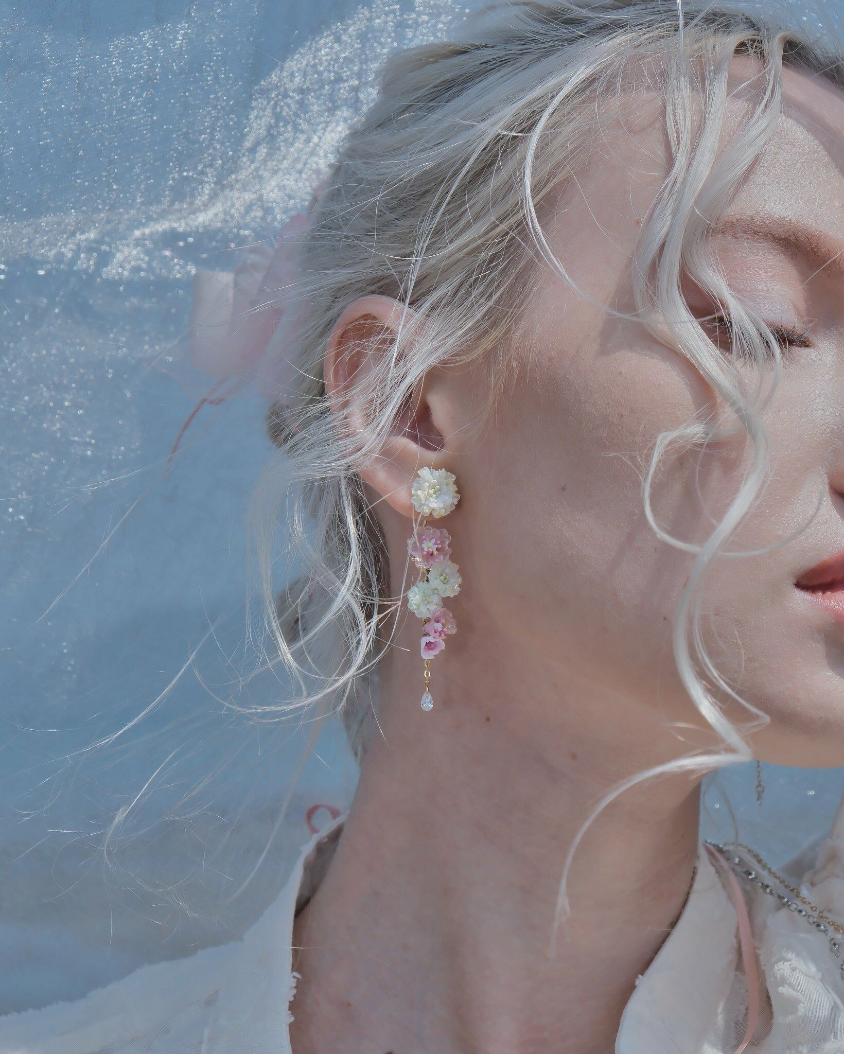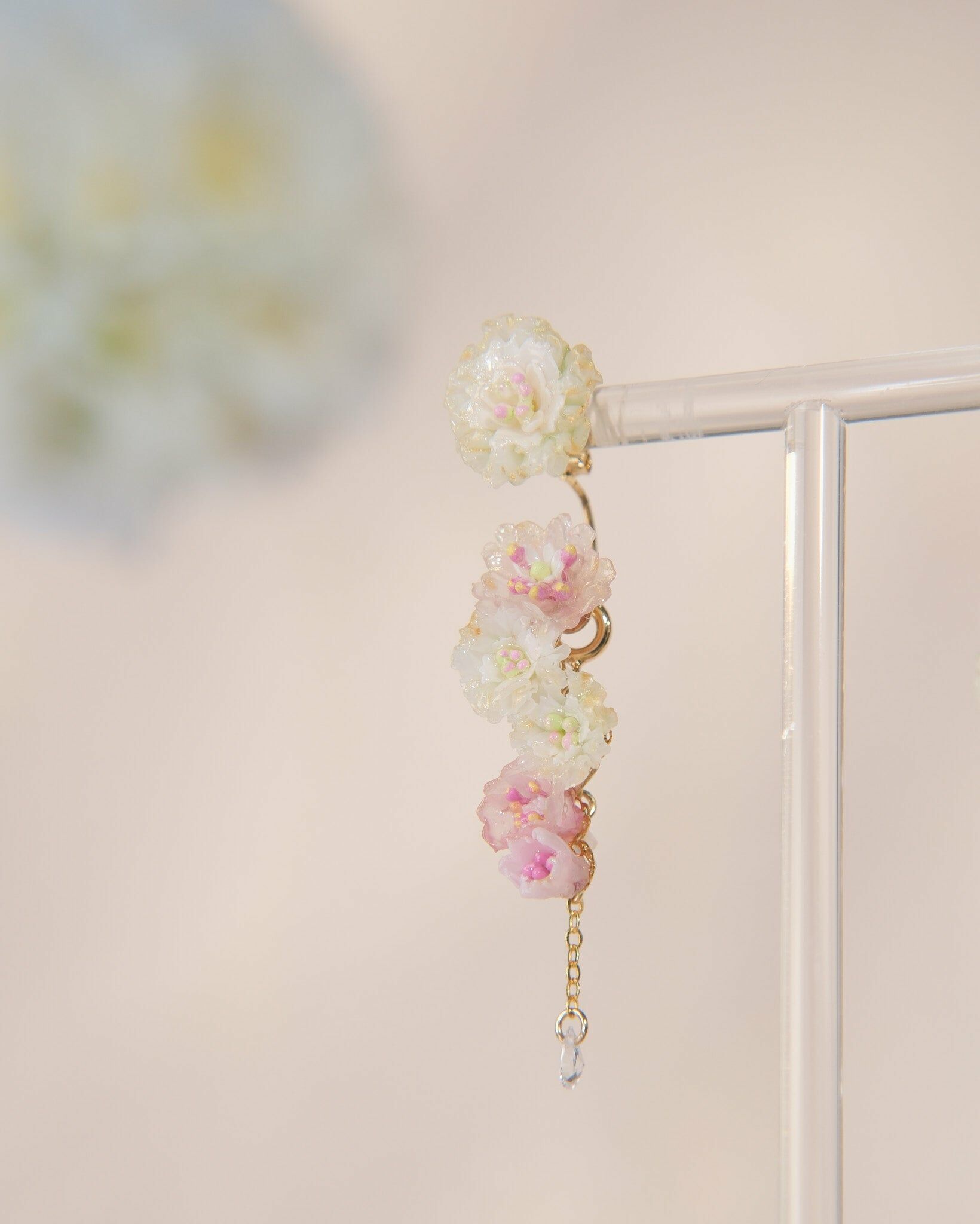 花兒猶如流水般流暢優美。作品仿佛一道清新的瀑布從耳垂飛瀉而下。耳環採用精細的琉璃櫻花編織而成,令人感受到一陣陣的清新氣息,能為你的穿搭增添一份流暢自然的美感。