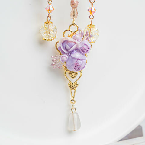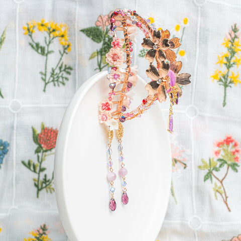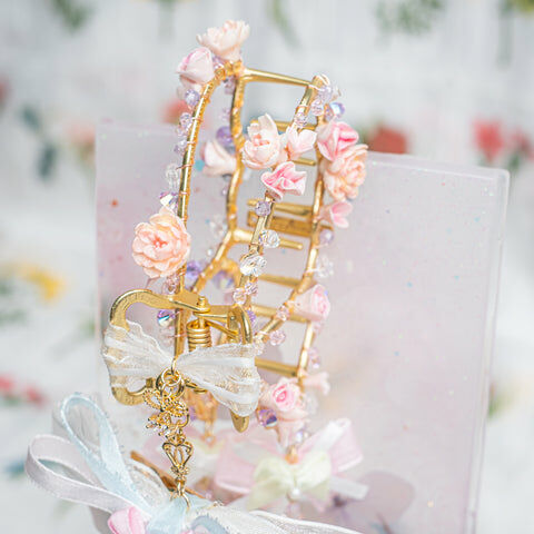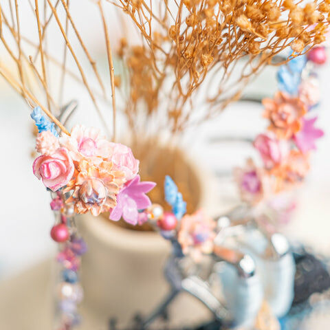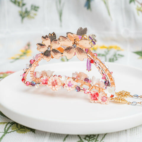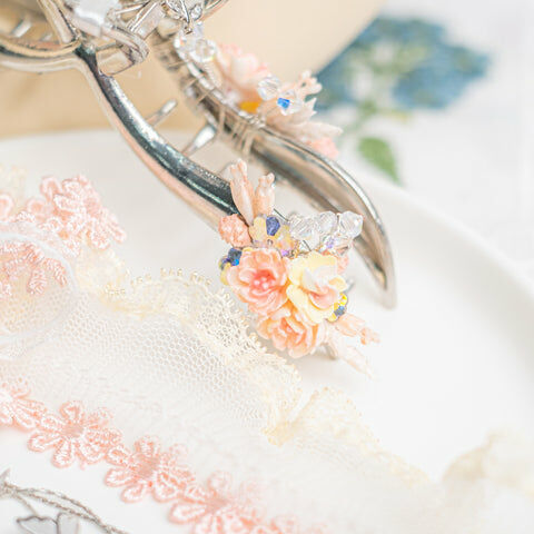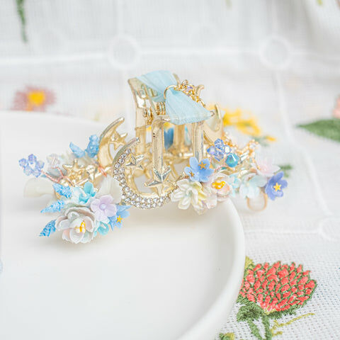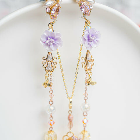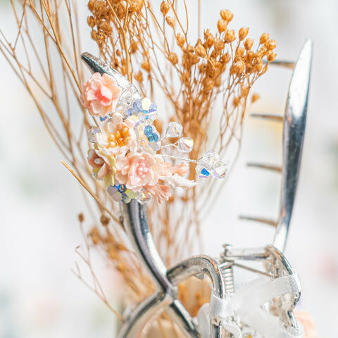 鍍金線 | 施華洛世奇水晶 | 手製樹脂黏土花 | UV膠強化保護層 | 金屬髮夾