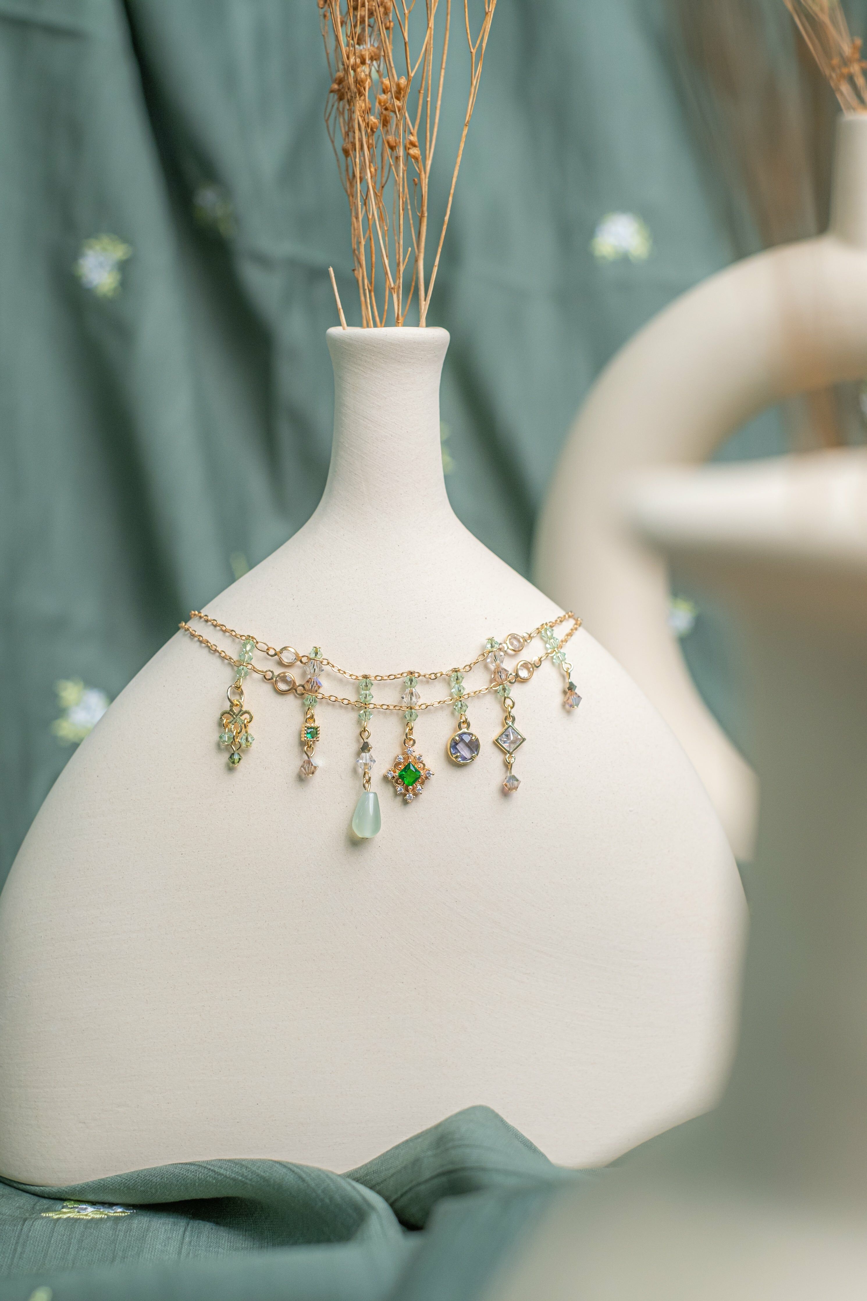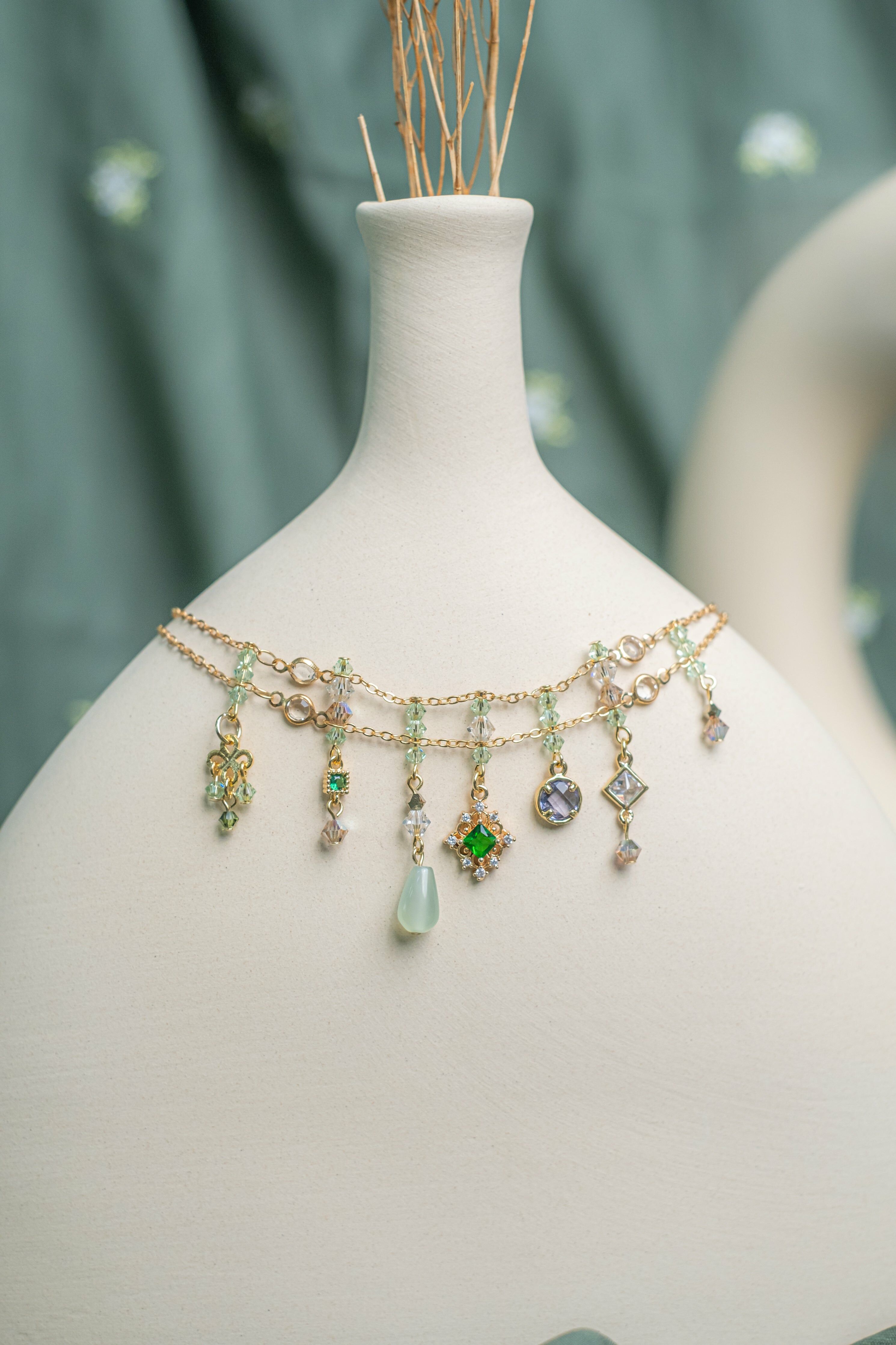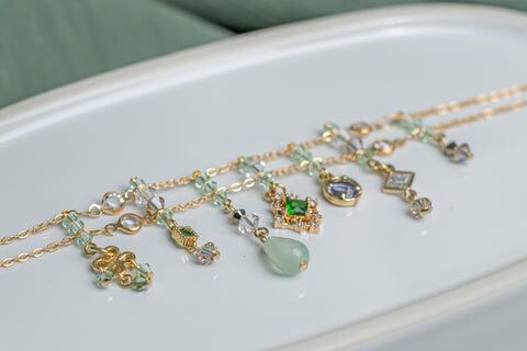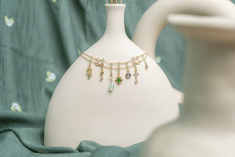 夏天就是把握溫度要露出腳踝!腳鏈的穿戴率雖然算不上最熱門,但它卻可以營造出無可替代的率性感覺,這款腳鏈選用了多種水晶與仿寶石,配搭出小復古率性造型。腳鏈長度可以量身定制。