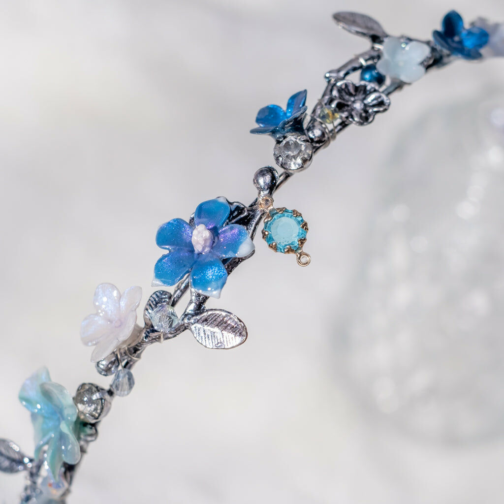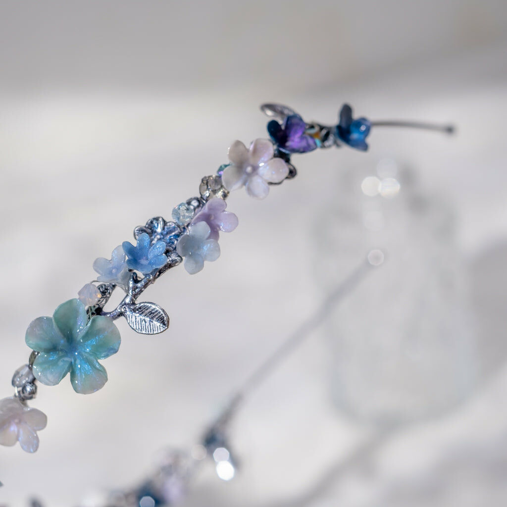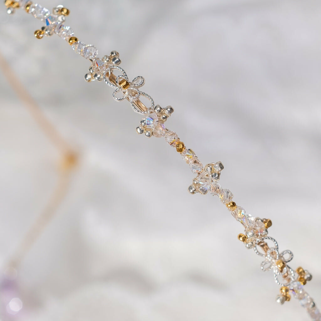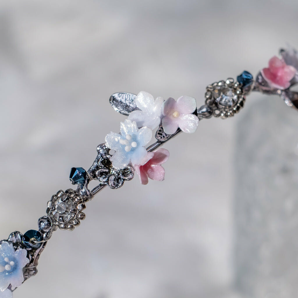 鍍金線 | 施華洛世奇水晶 | 手製樹脂黏土花 | UV膠強化保護層 | 金屬髮箍