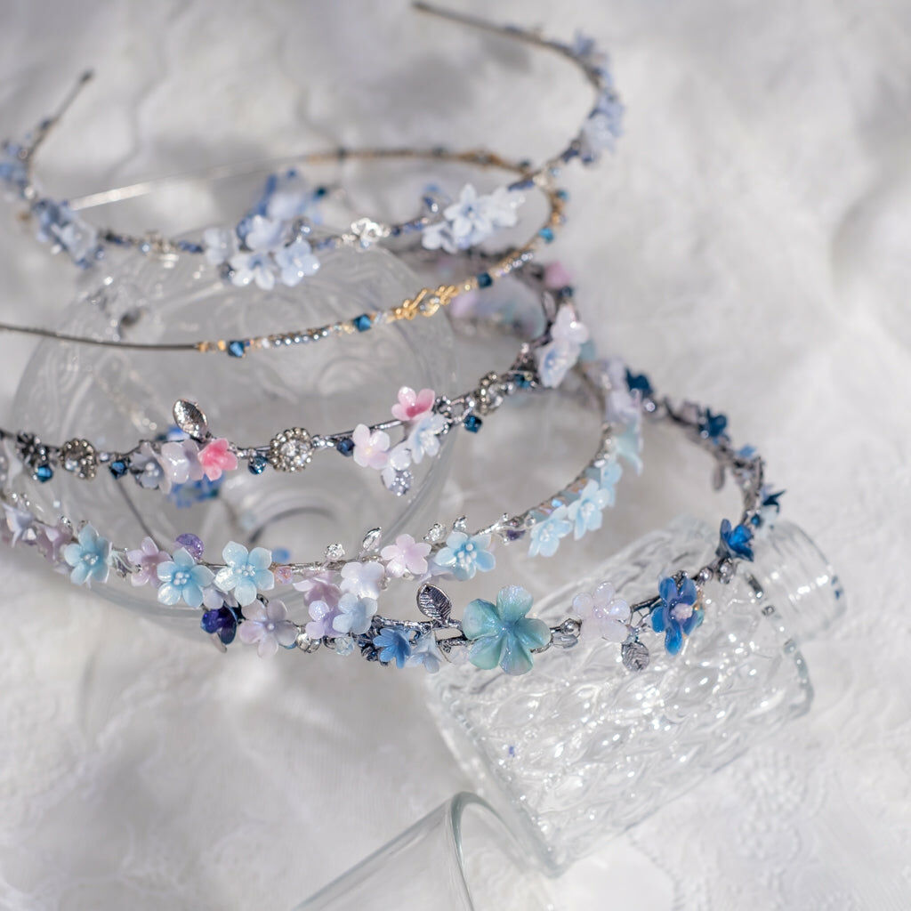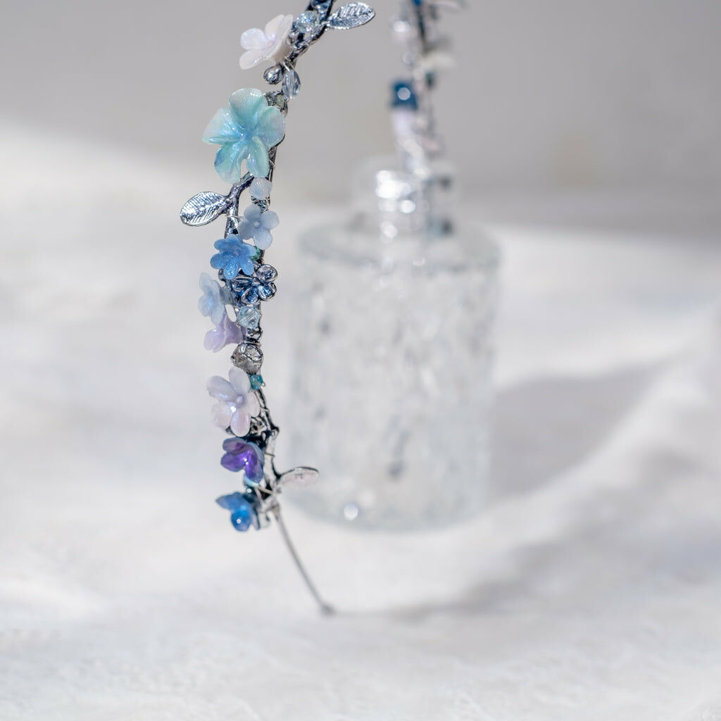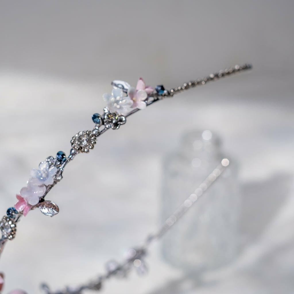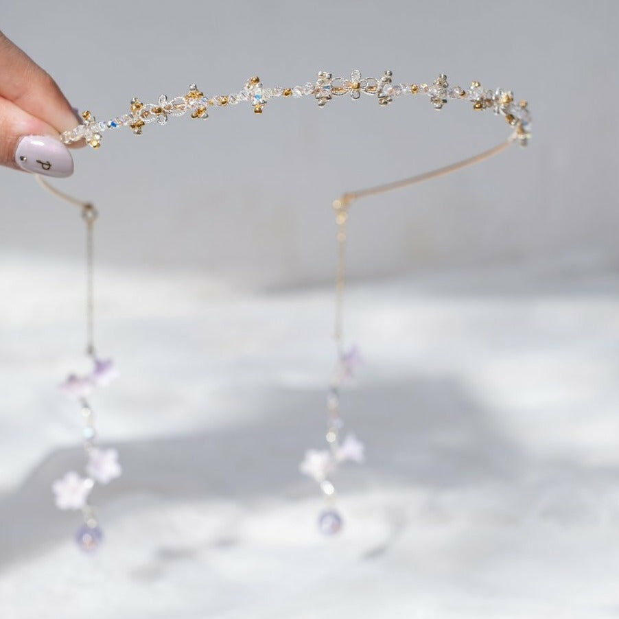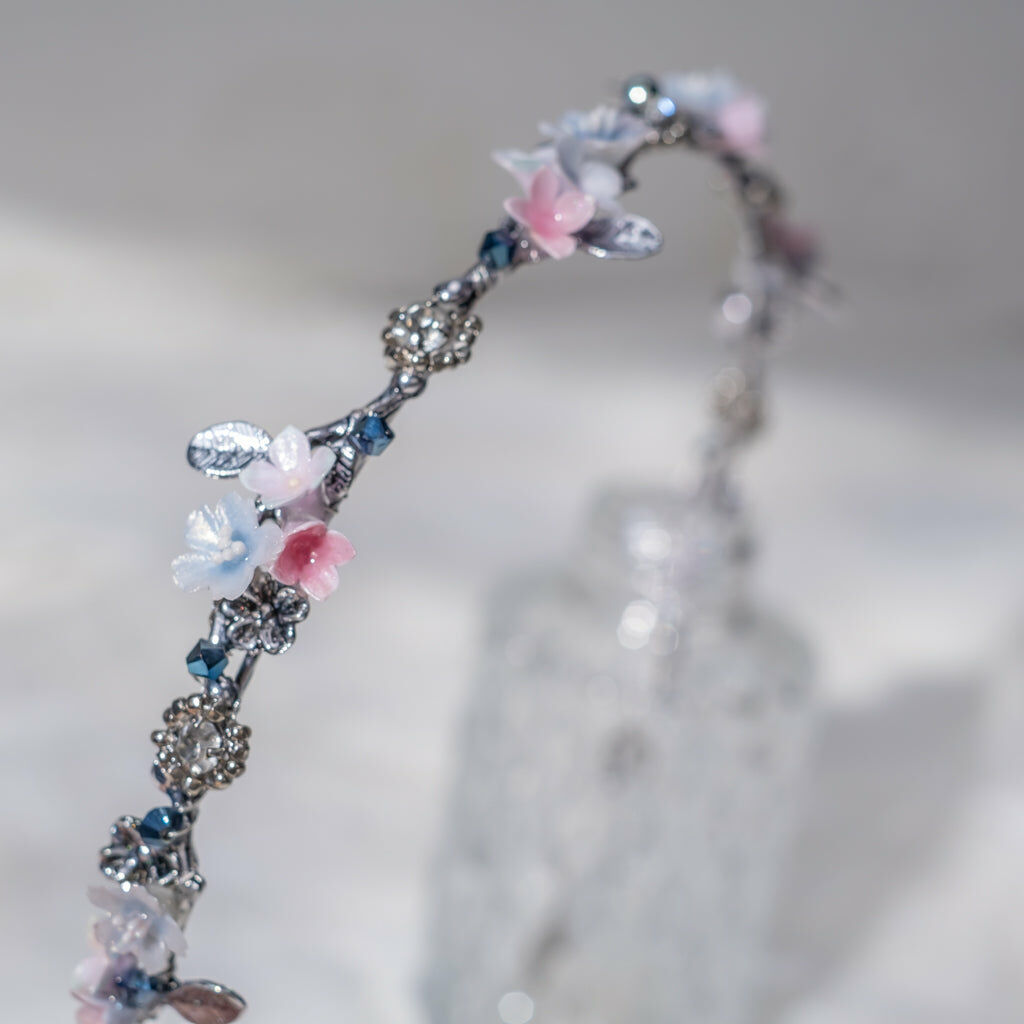 鍍金線 | 施華洛世奇水晶 | 手製樹脂黏土花 | UV膠強化保護層 | 金屬髮箍