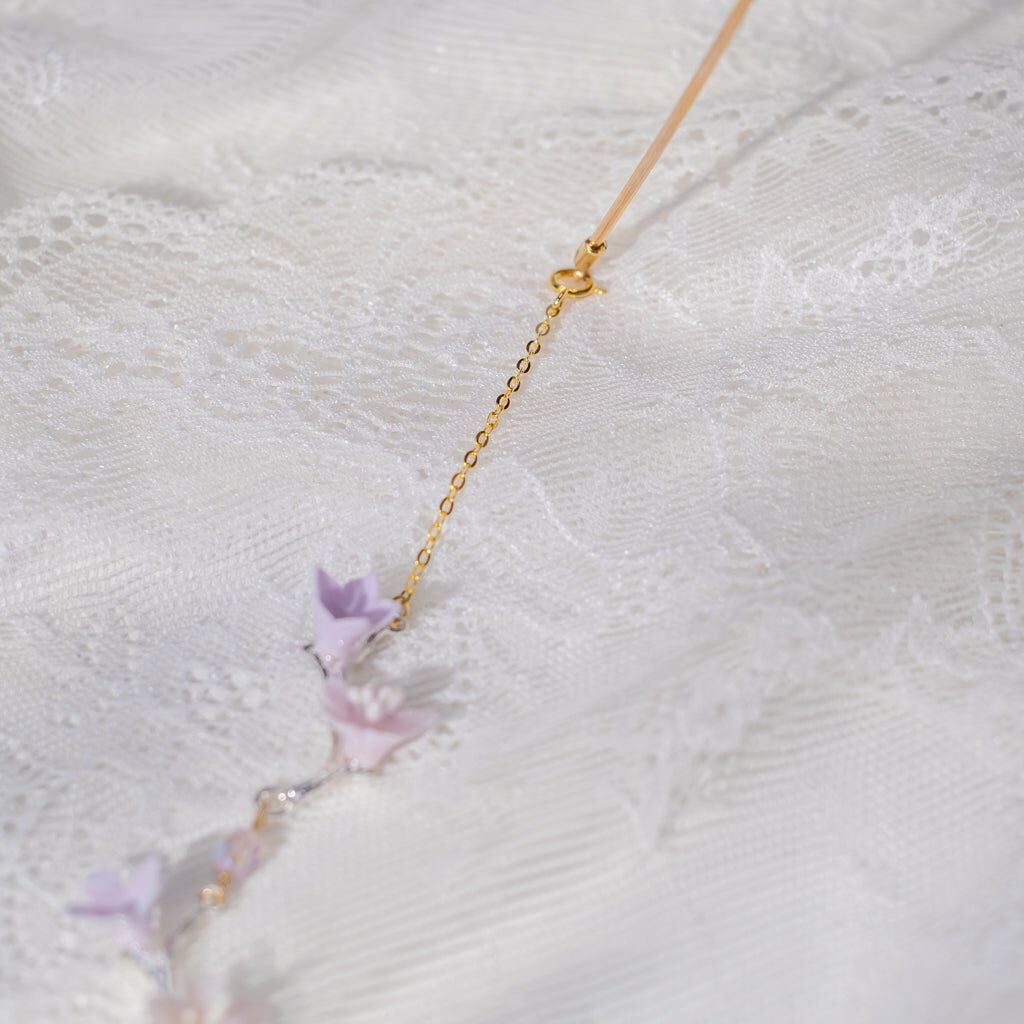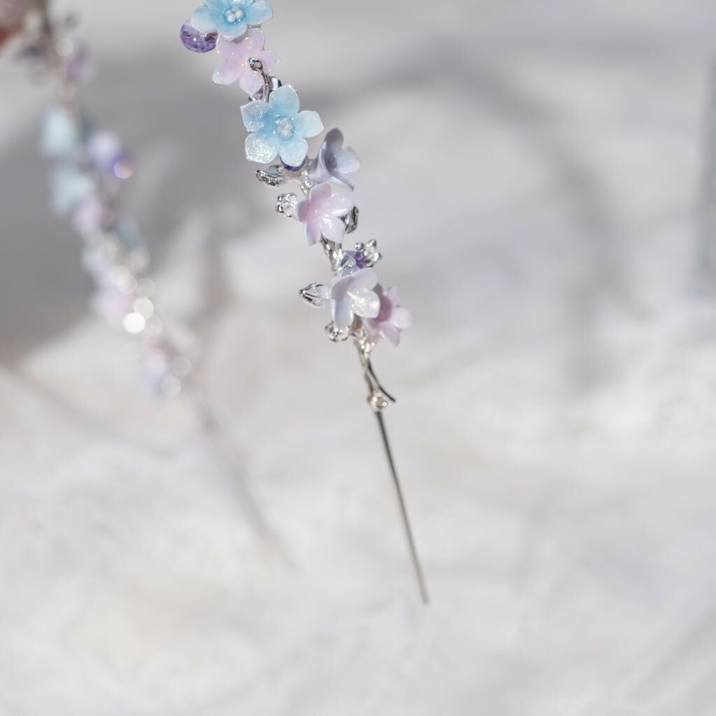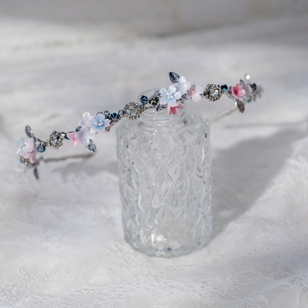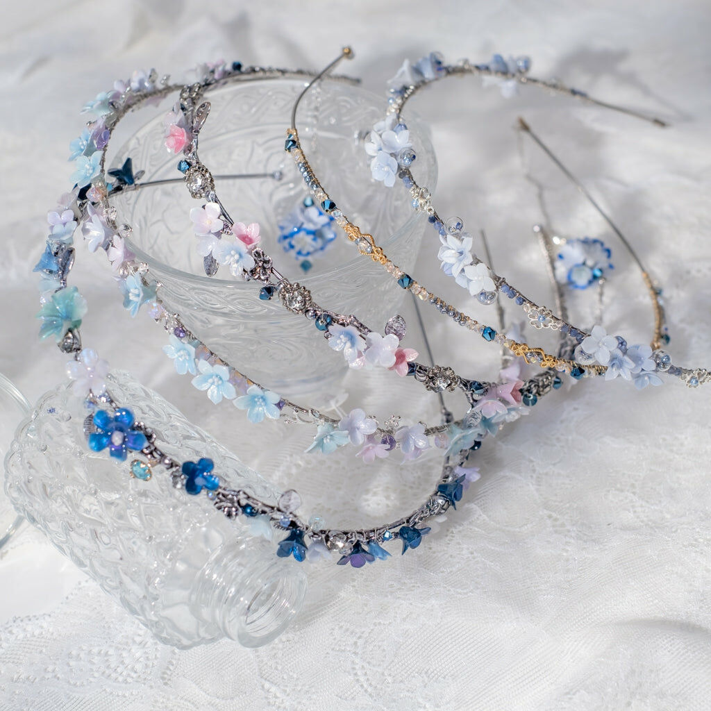 鍍金線 | 施華洛世奇水晶 | 手製樹脂黏土花 | UV膠強化保護層 | 金屬髮箍