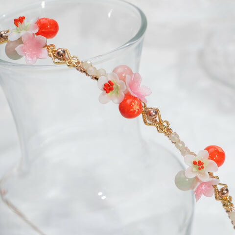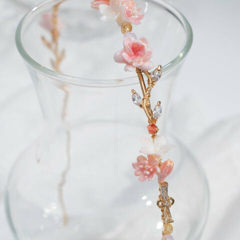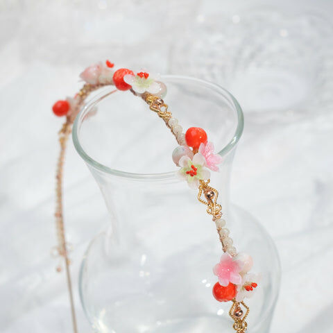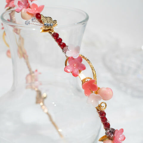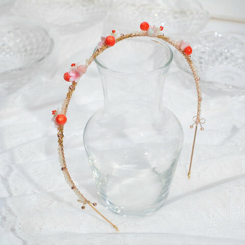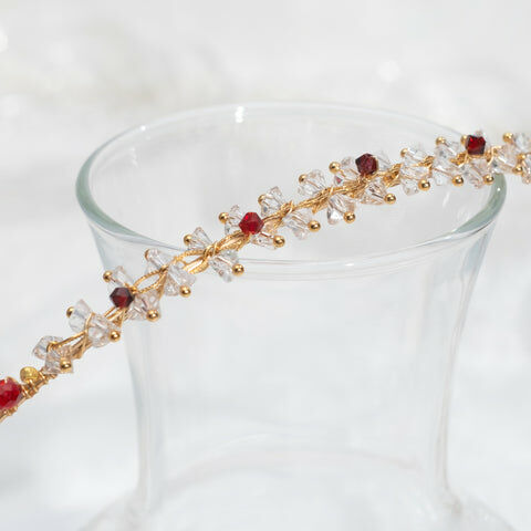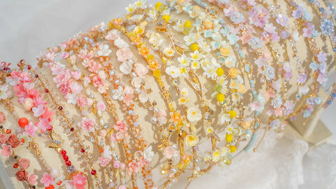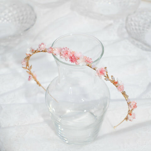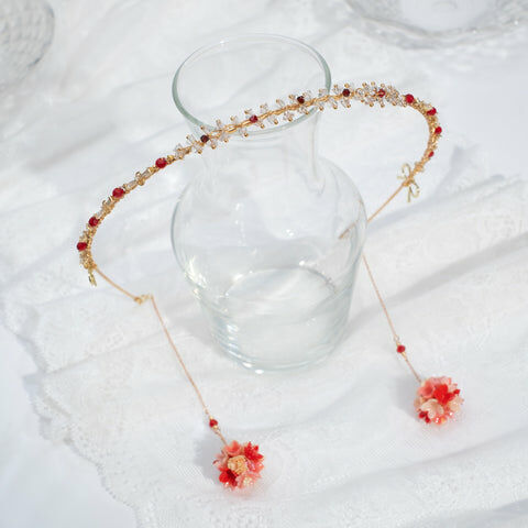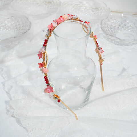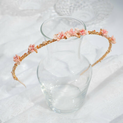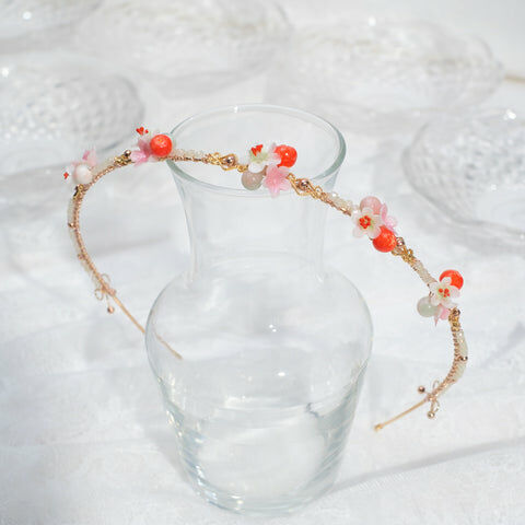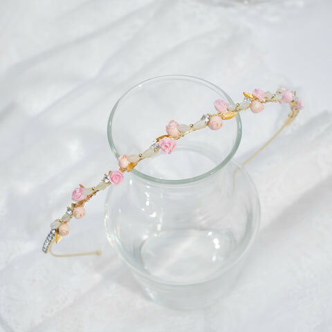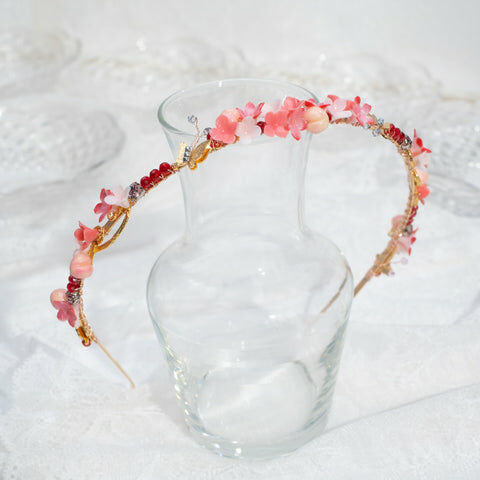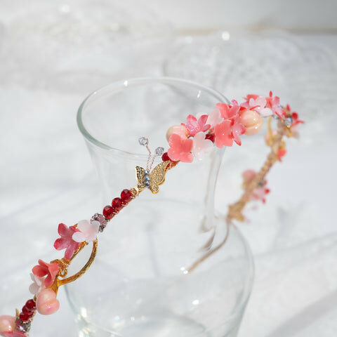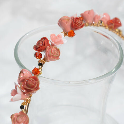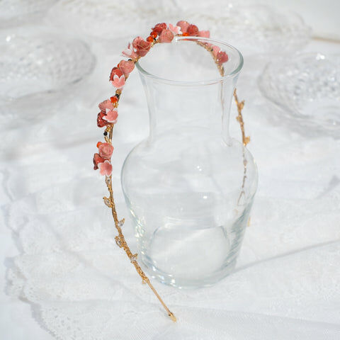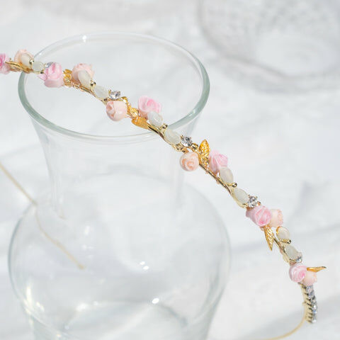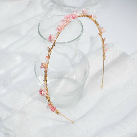 鍍金線 | 施華洛世奇水晶 | 手製樹脂黏土花 | UV膠強化保護層 | 金屬髮箍