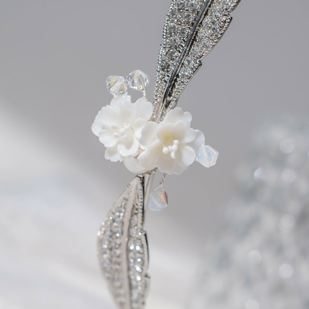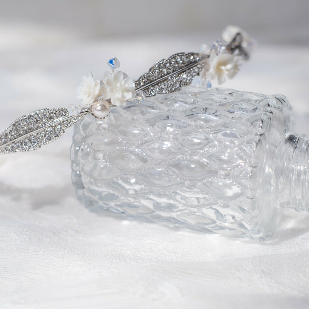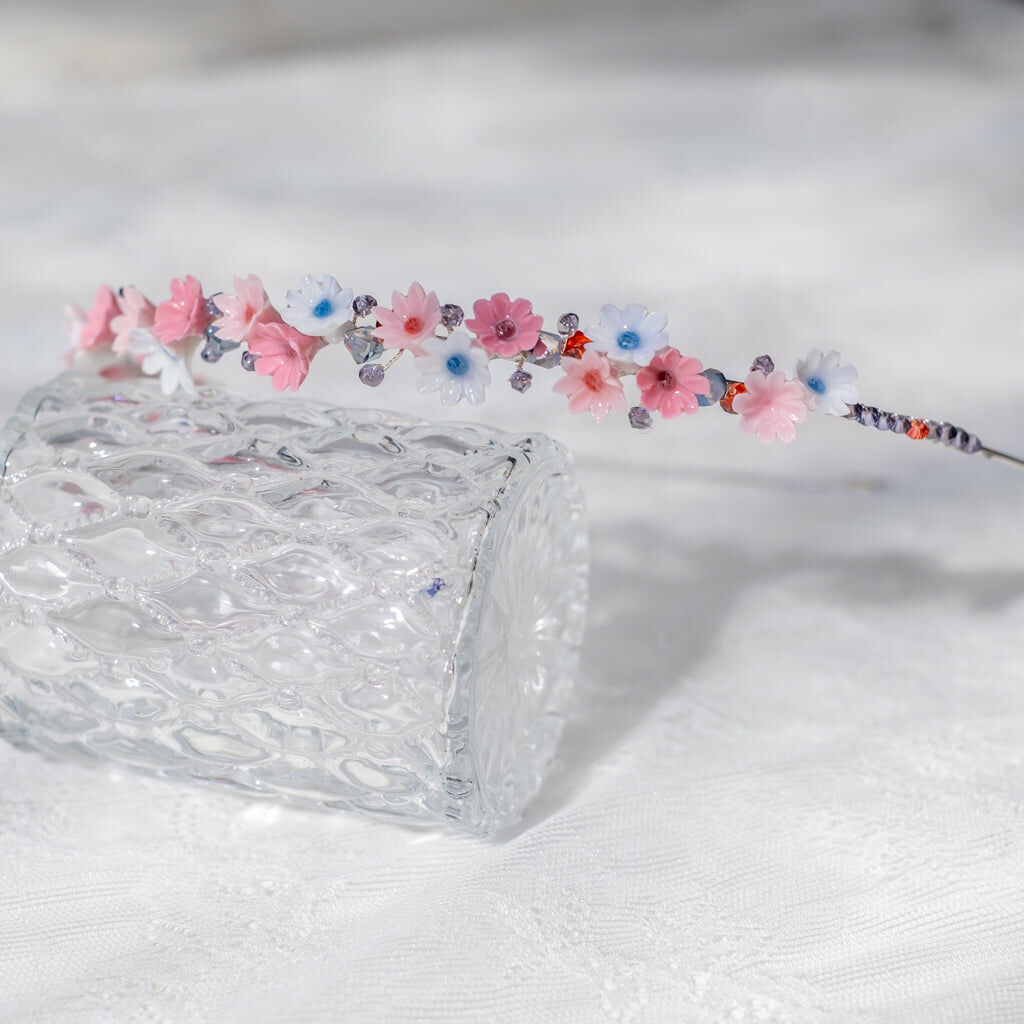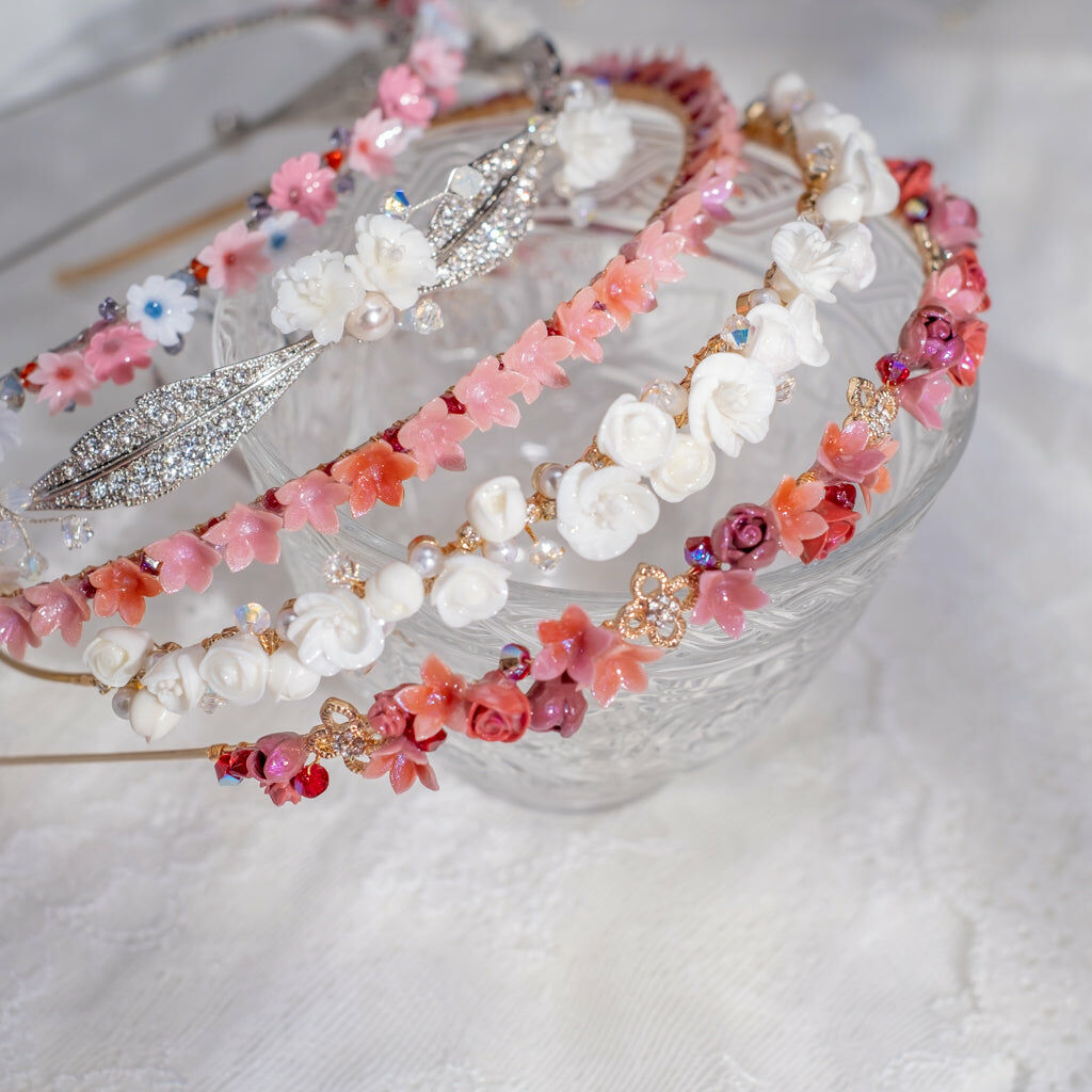 鍍金線 | 施華洛世奇水晶 | 手製樹脂黏土花 | UV膠強化保護層 | 金屬髮箍