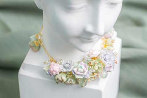 豐富的多肉植物配上天然的葡萄石,每粒配件和吊墜均以人手裝嵌,確保每粒多肉植物在手部擺動時仍然能置中及保持良好角度。