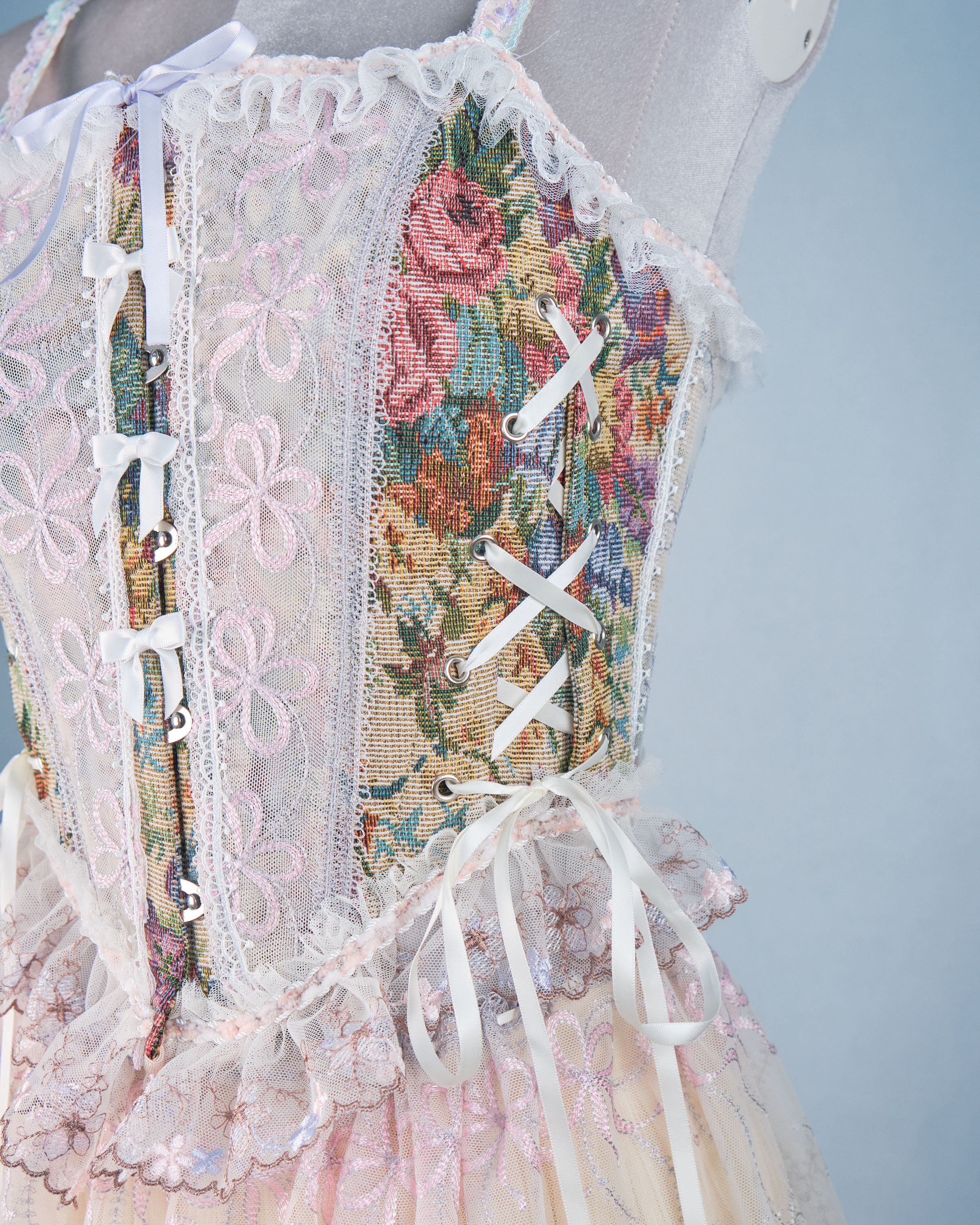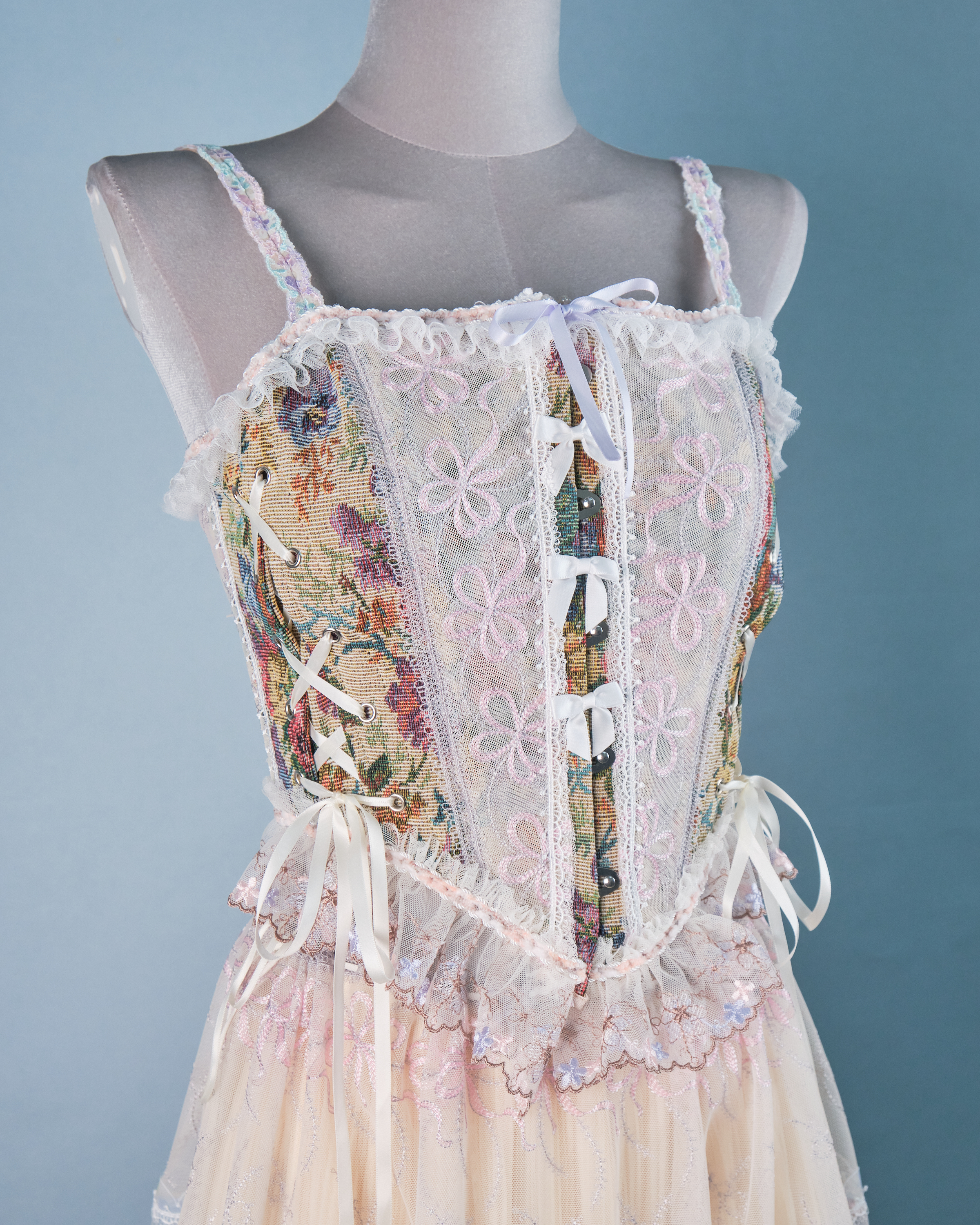 This corset top blends vintage charm with romance, featuring floral fabric, lace edges, and a fishbone structure. Adjustable ties on both sides ensure a perfect fit for all body types, creating a graceful and noble look.