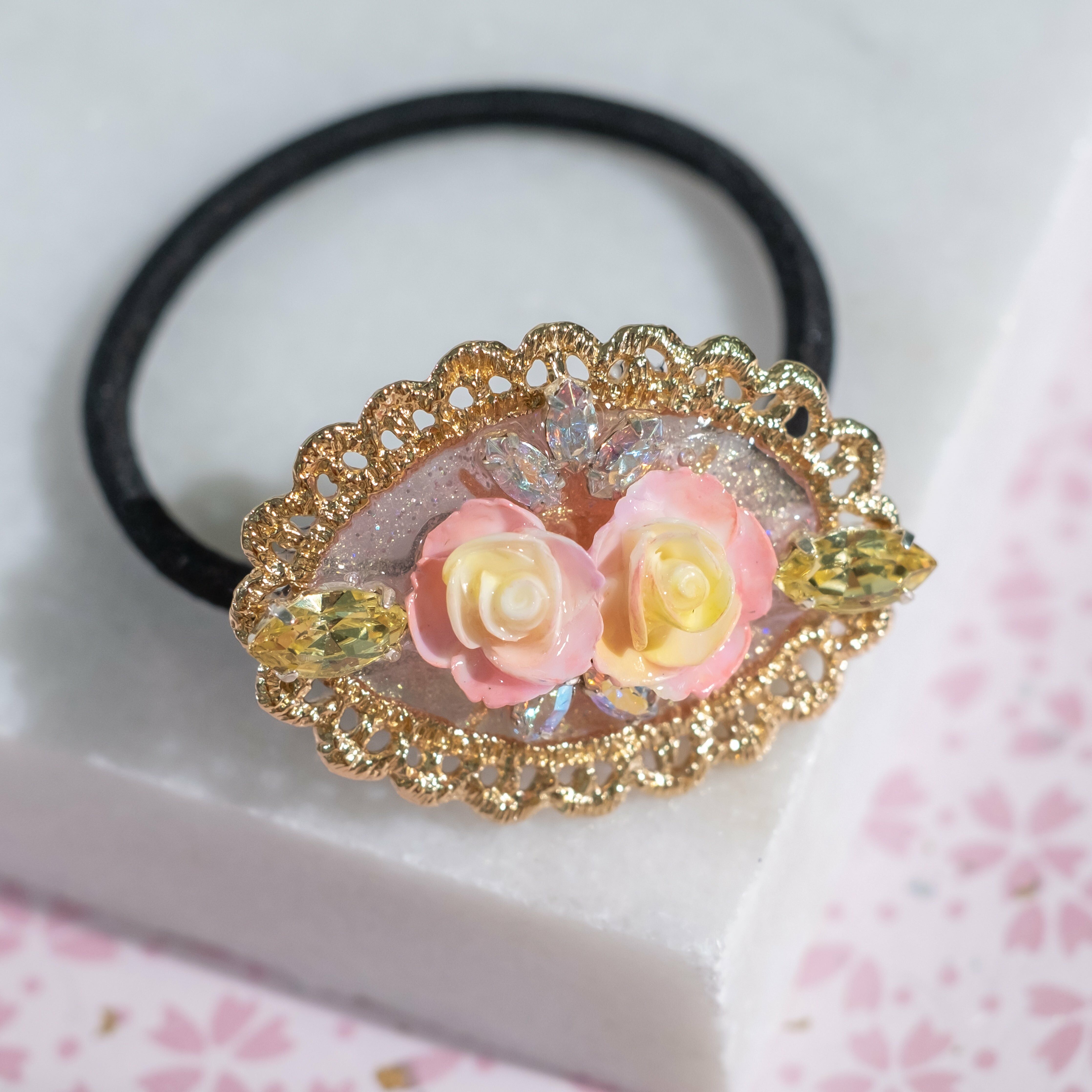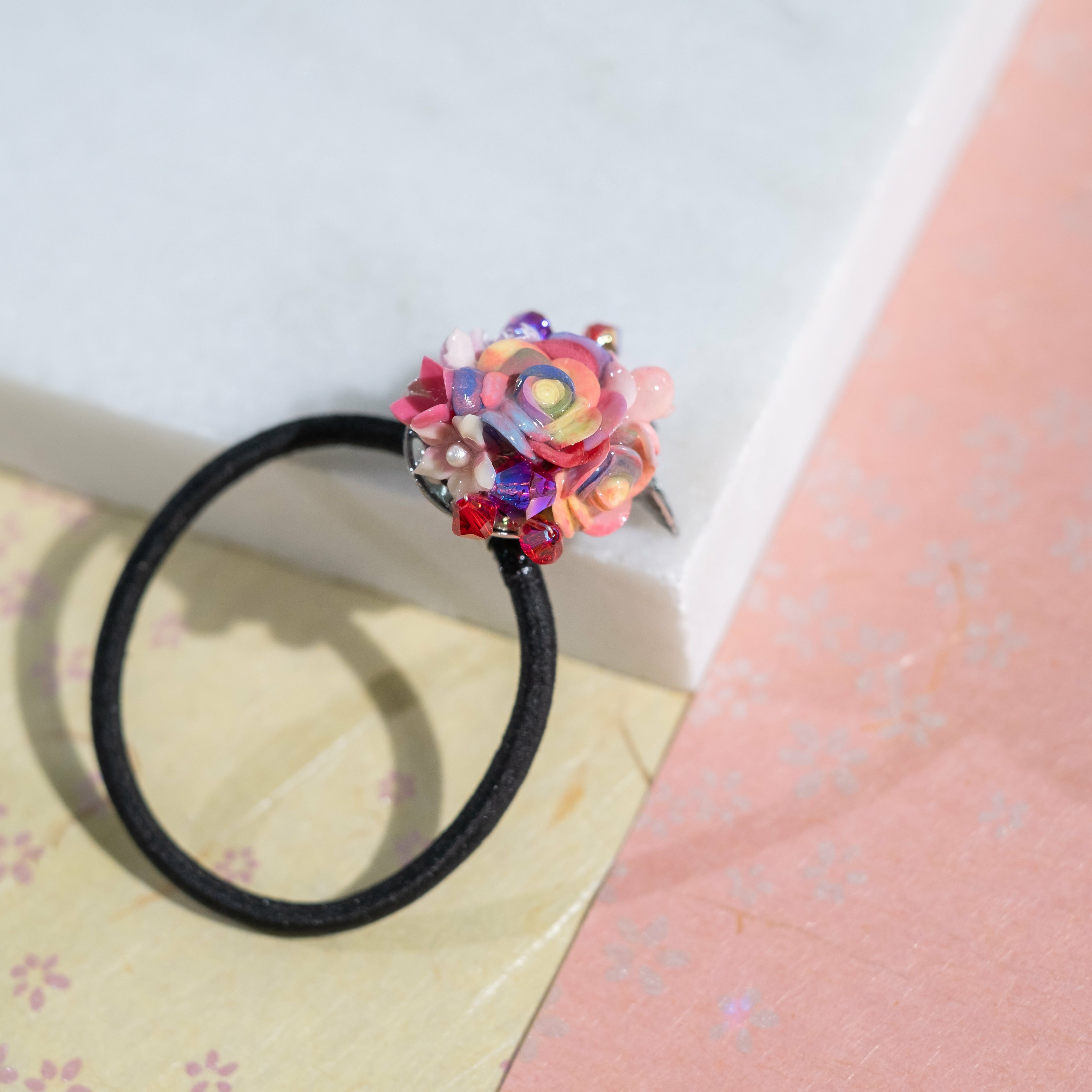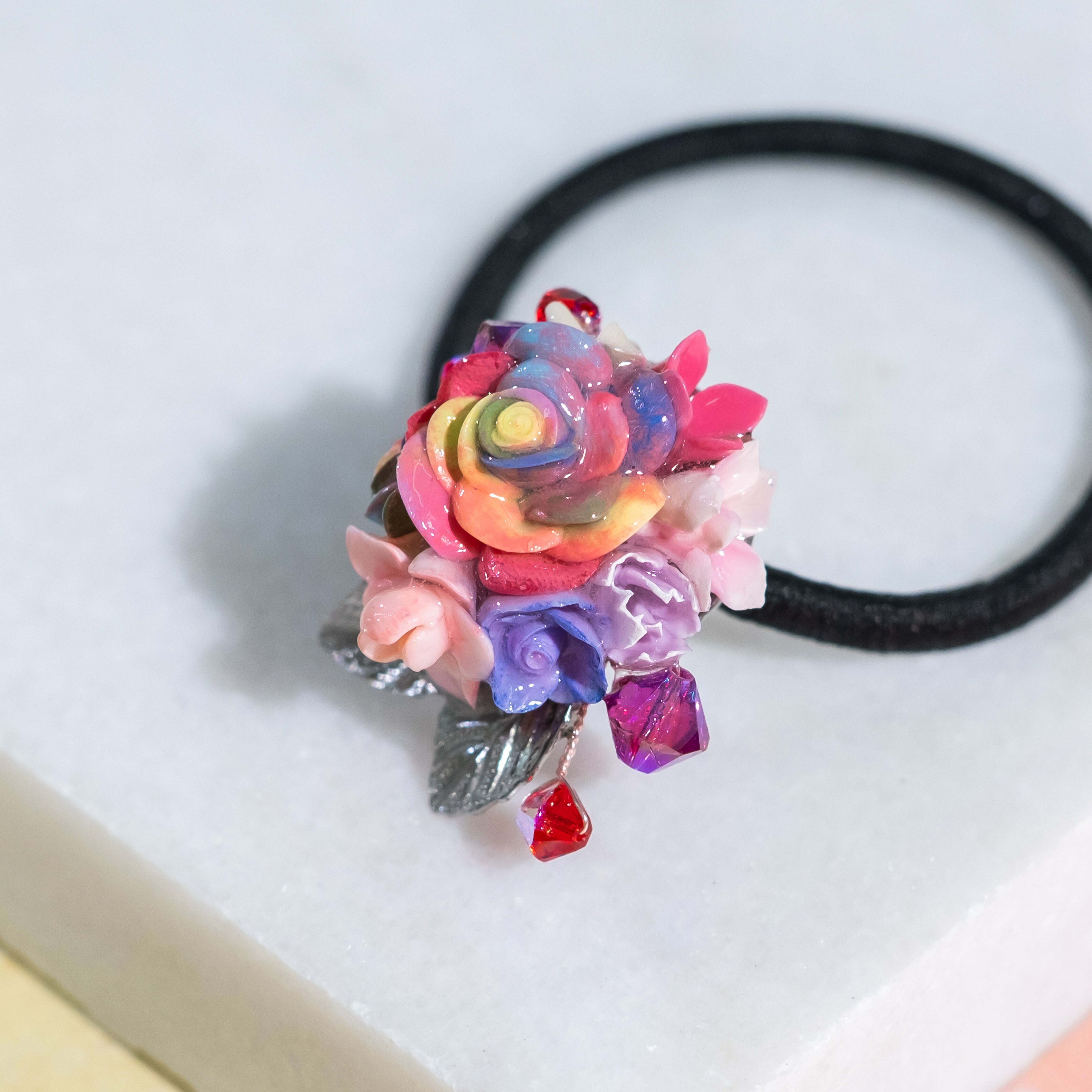Gold Plated Artistic Wire | Swarovski Crystal Bead | Handcrafted Resin Clay Flower | UV Hardening Coating | Elastic Rubber Band