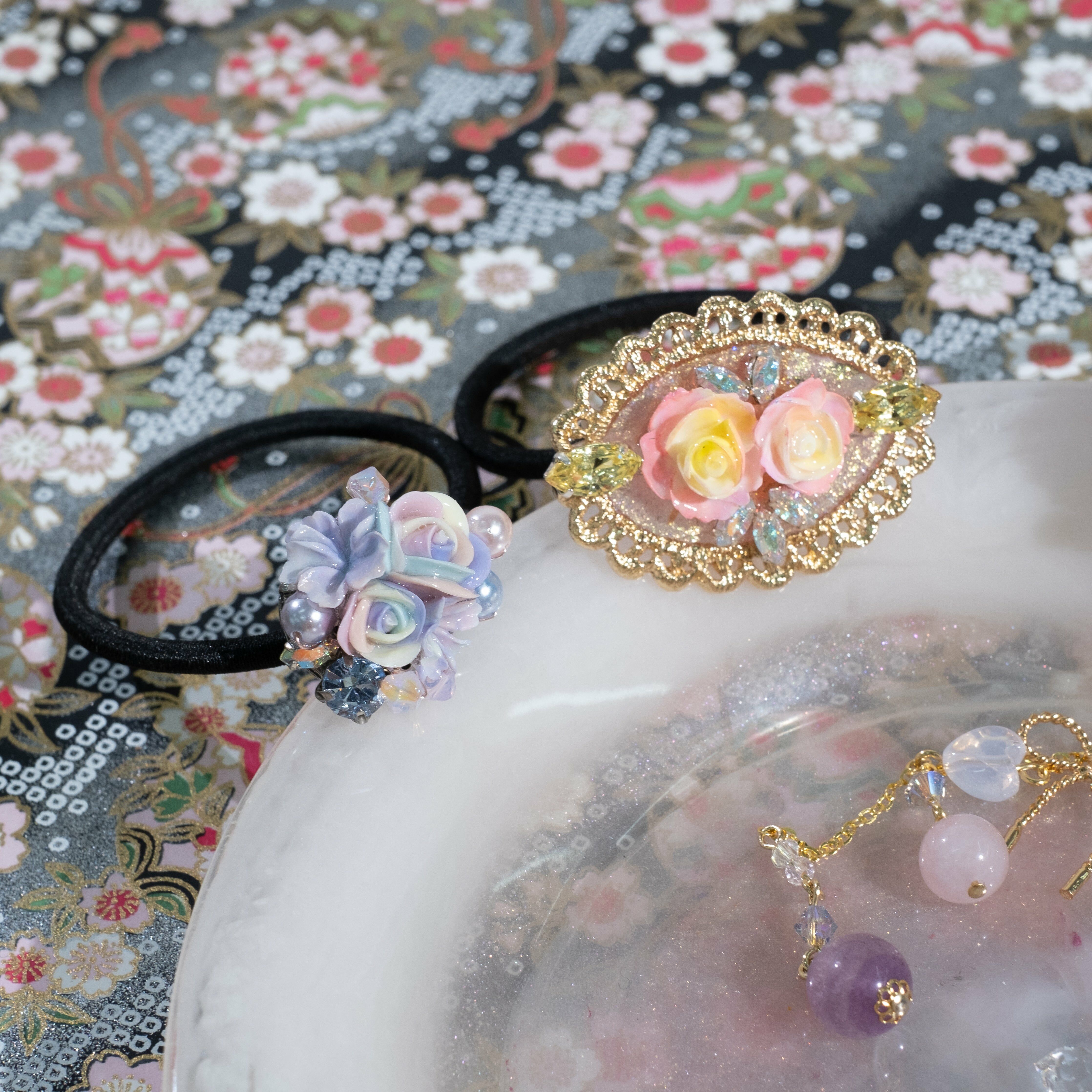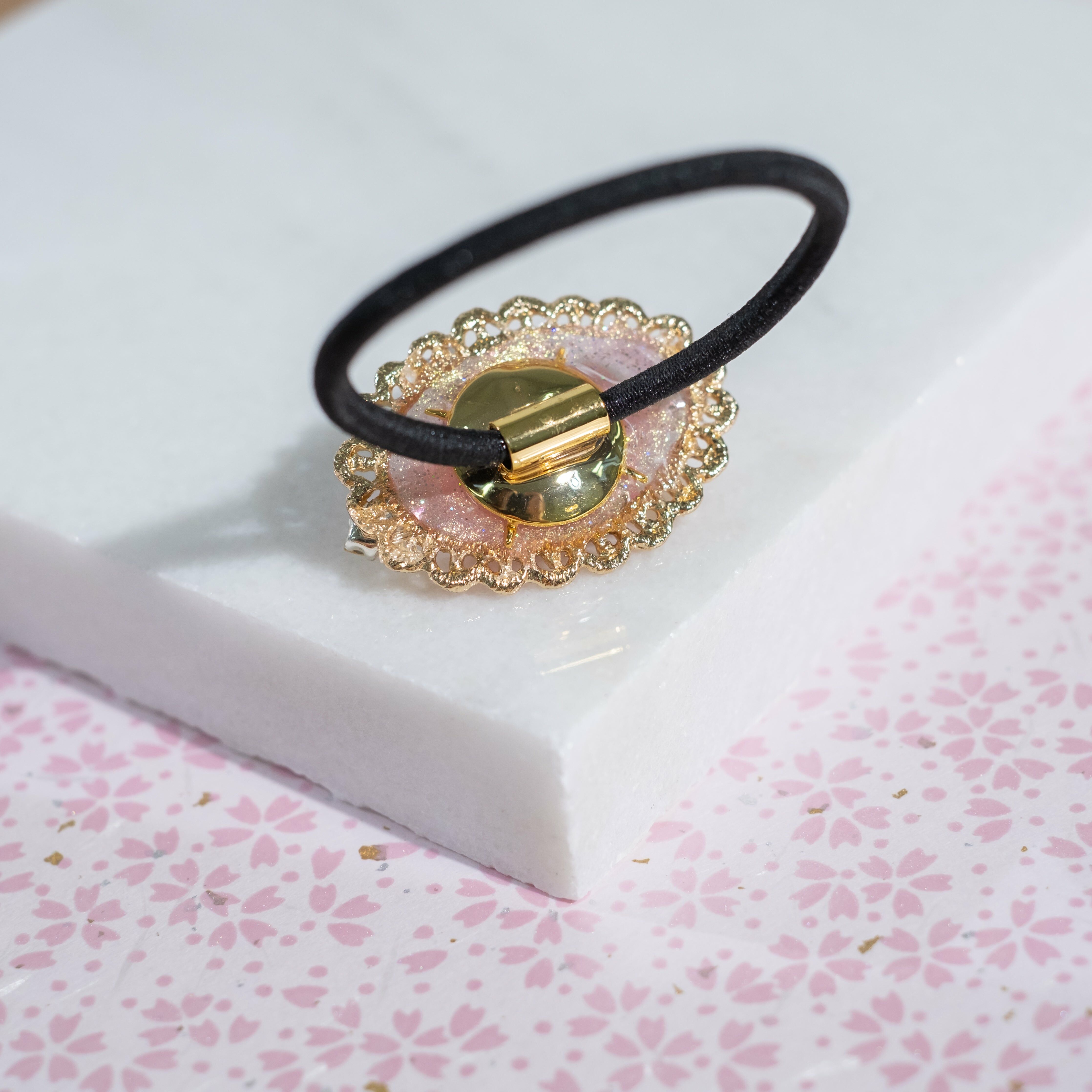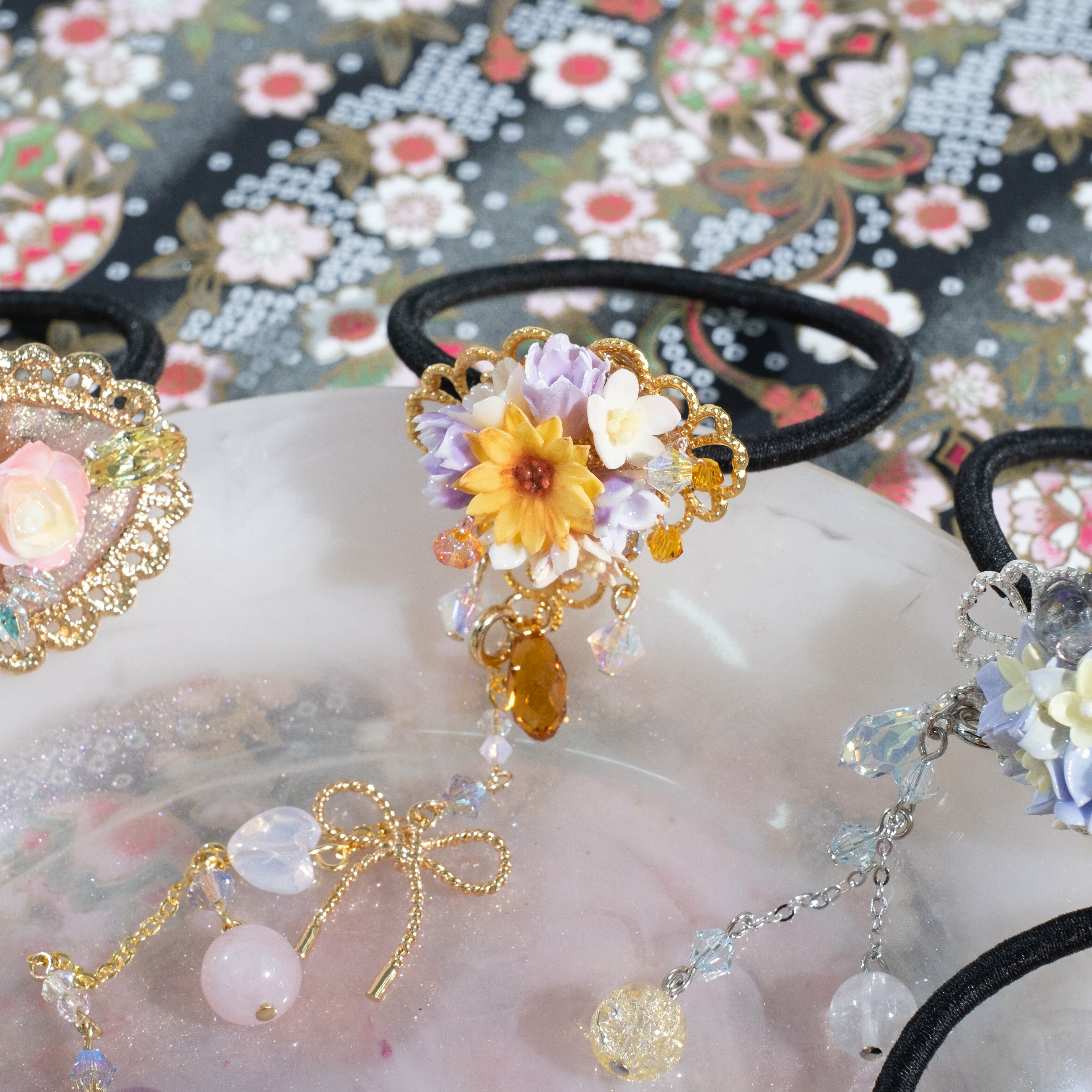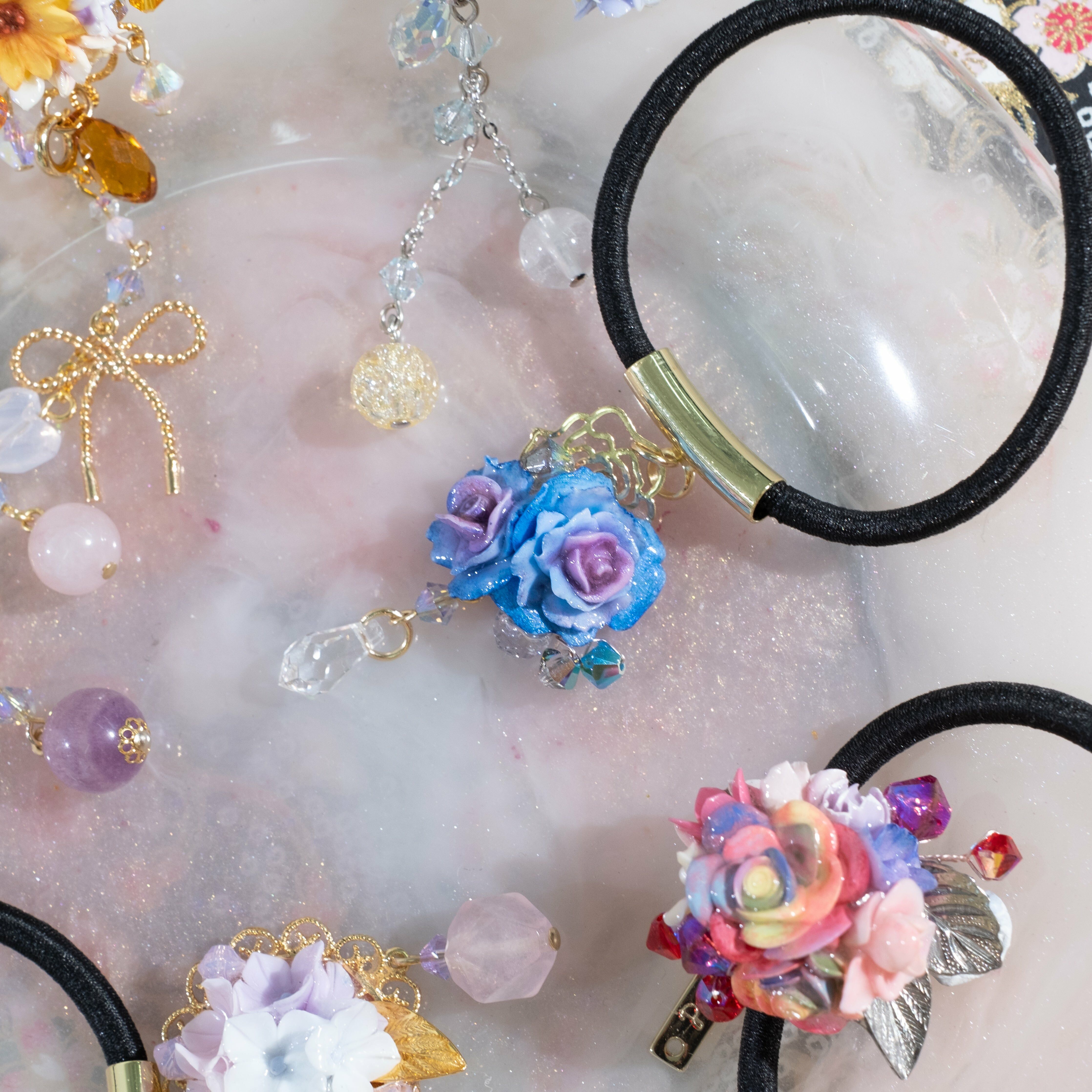 鍍金線 | 施華洛世奇水晶 | 手製樹脂黏土花 | UV膠強化保護層 | 彈性橡筋
