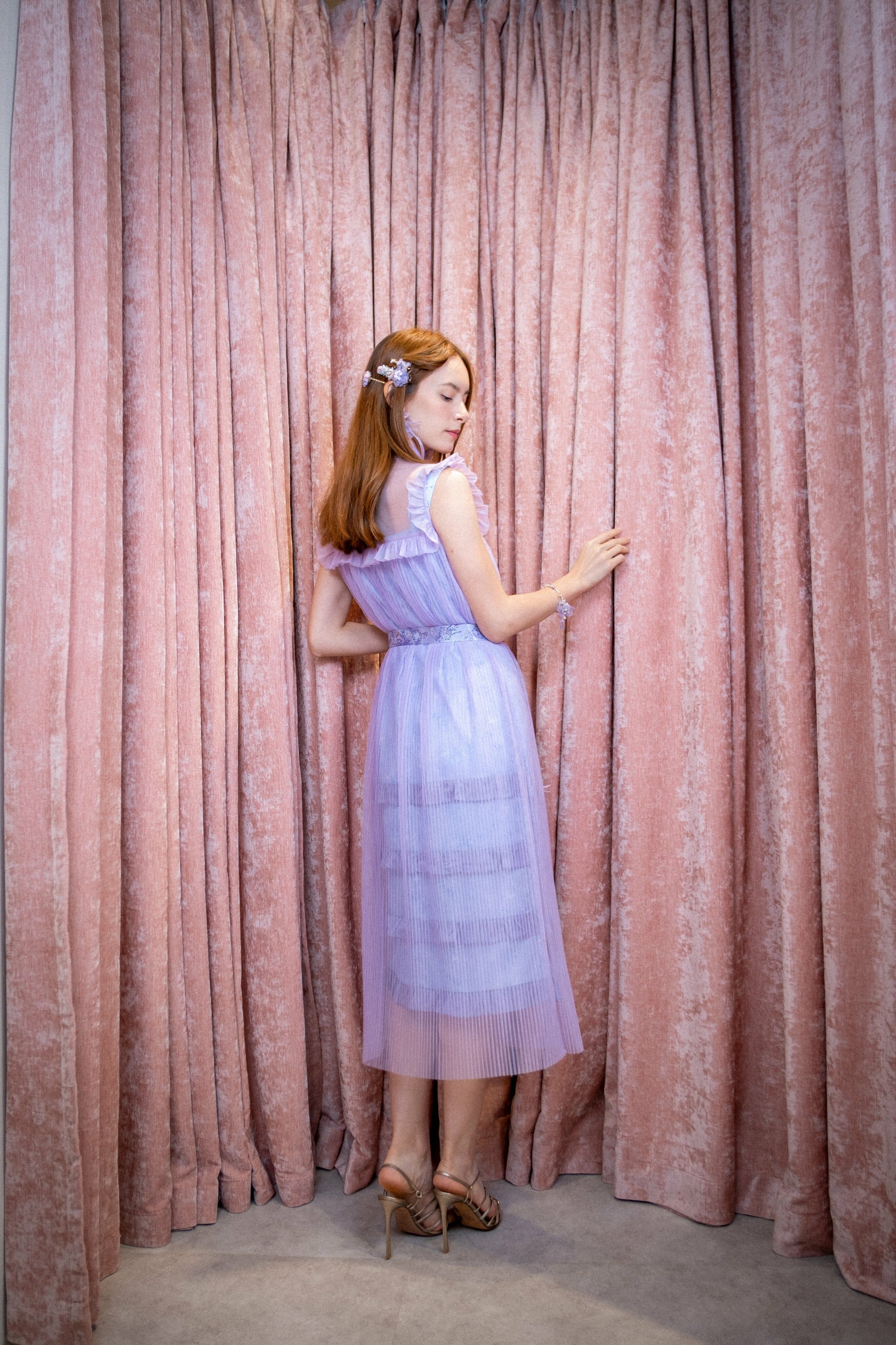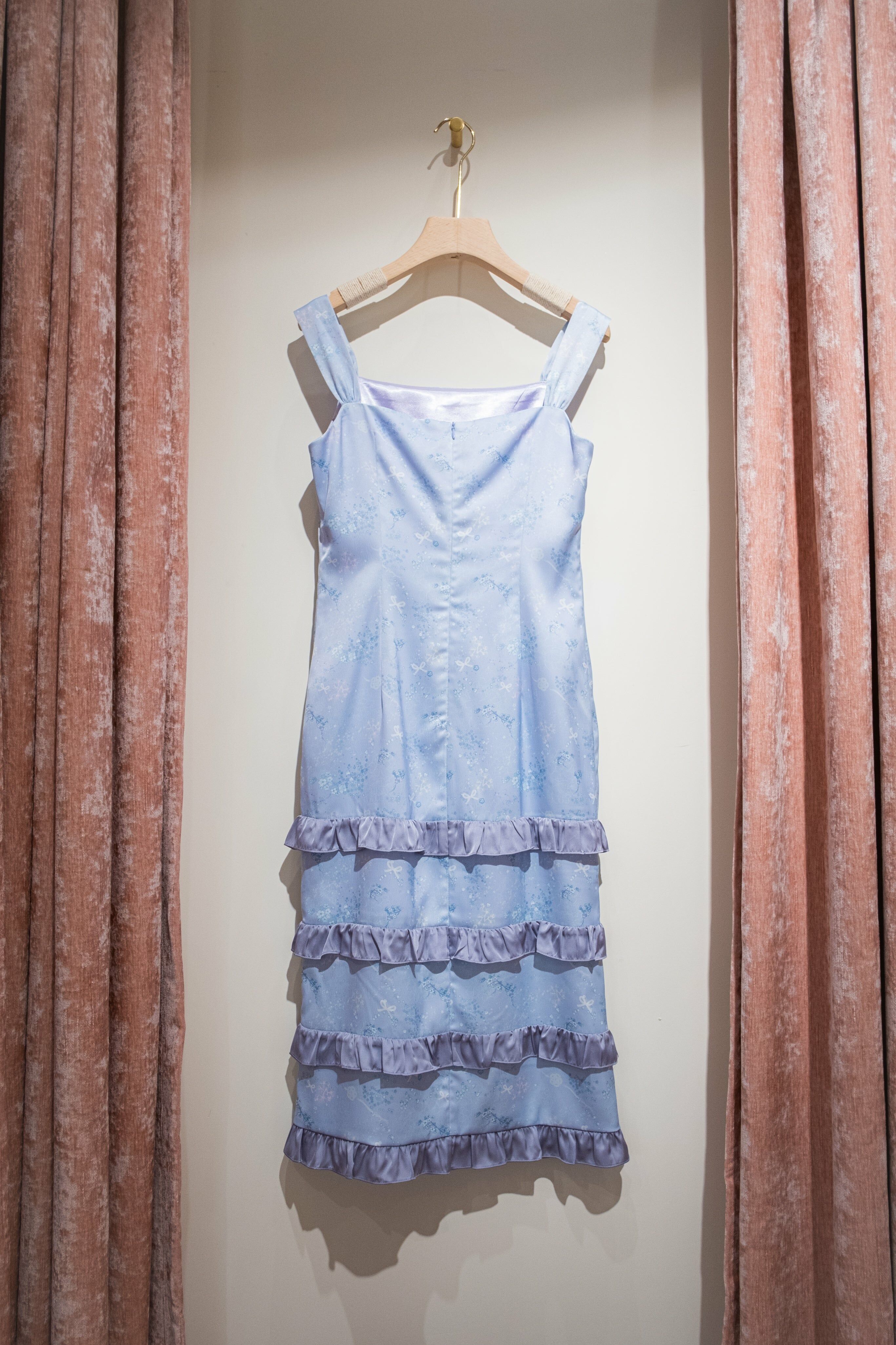紫色印花吊帶荷葉邊連衣裙