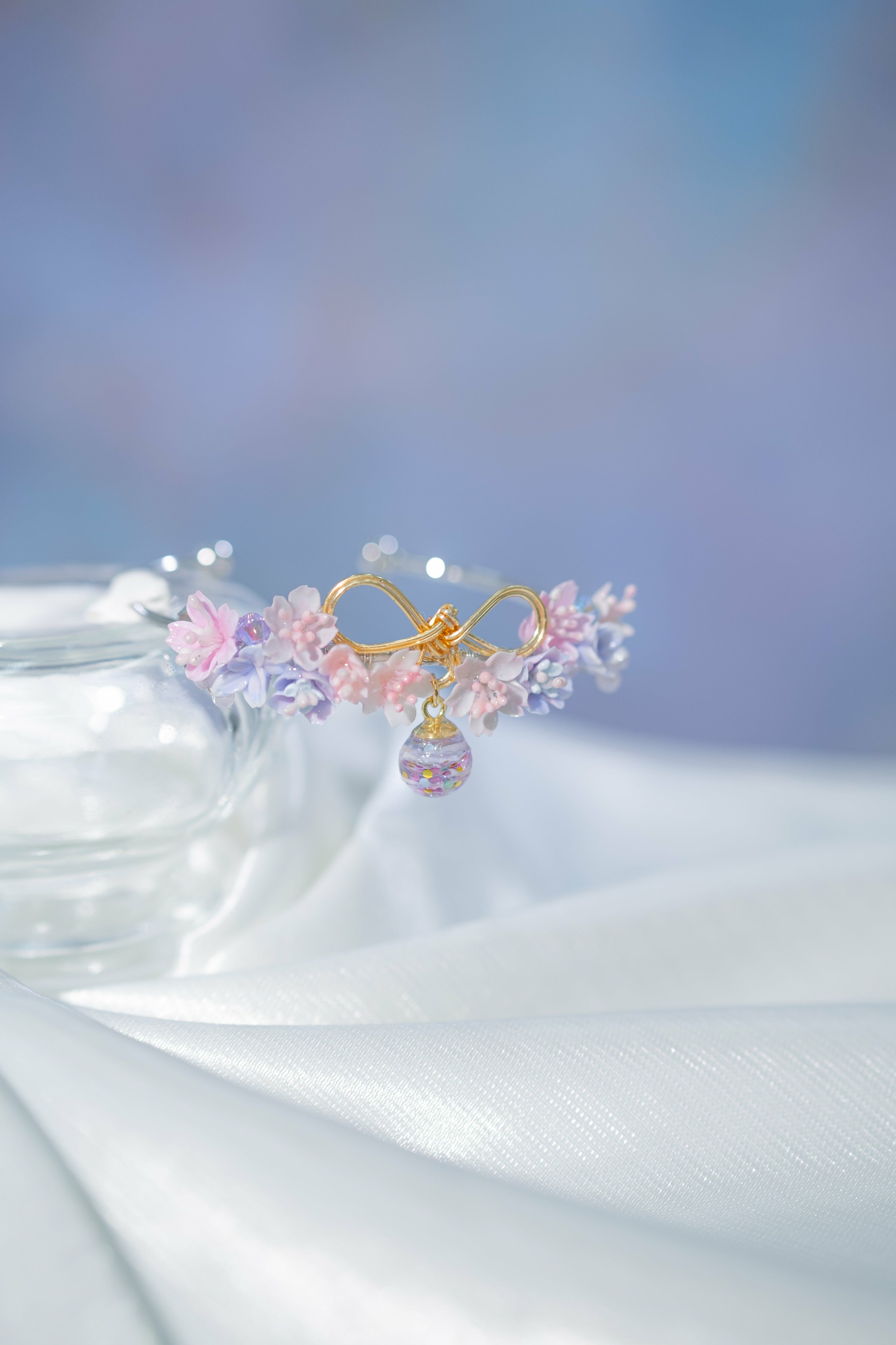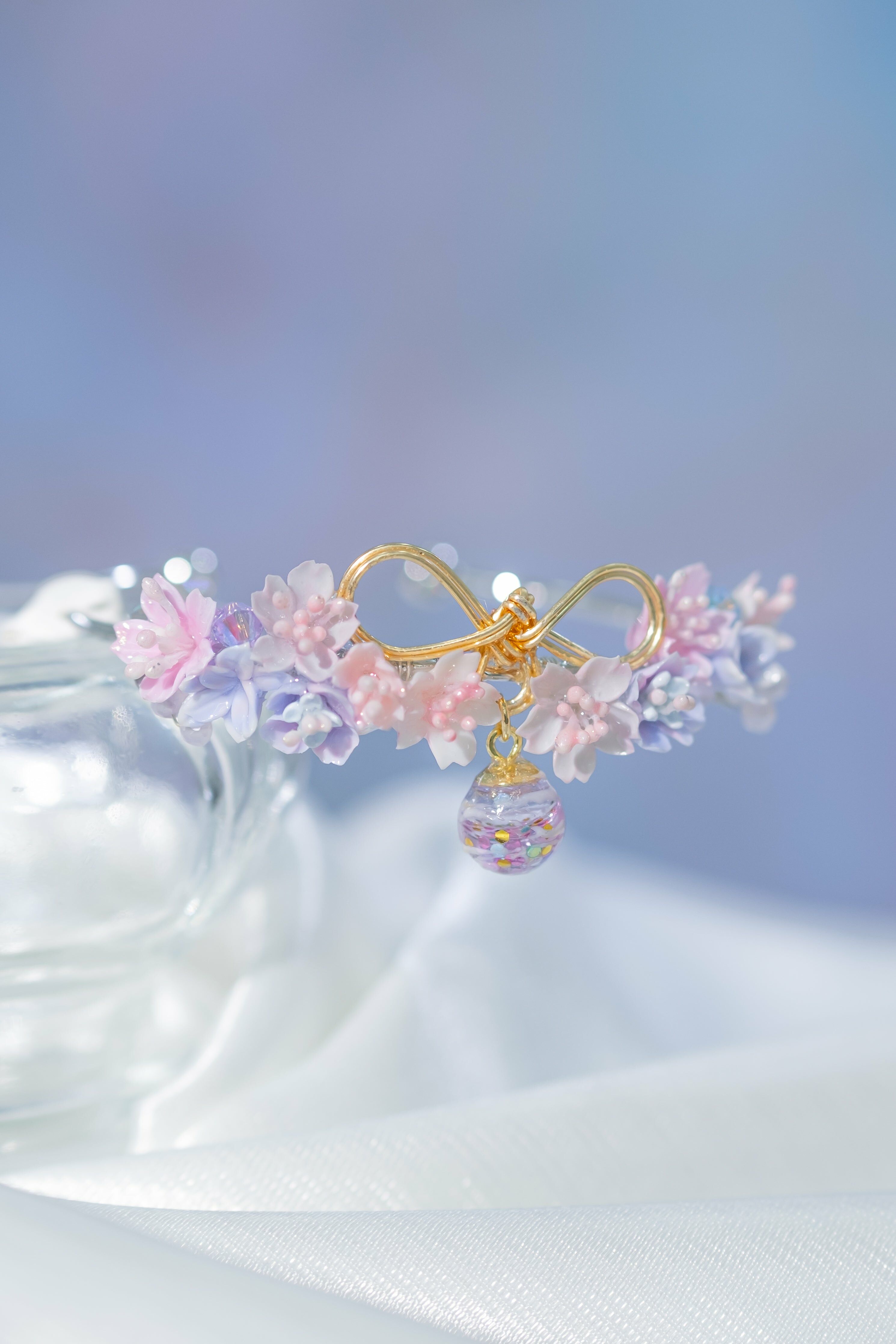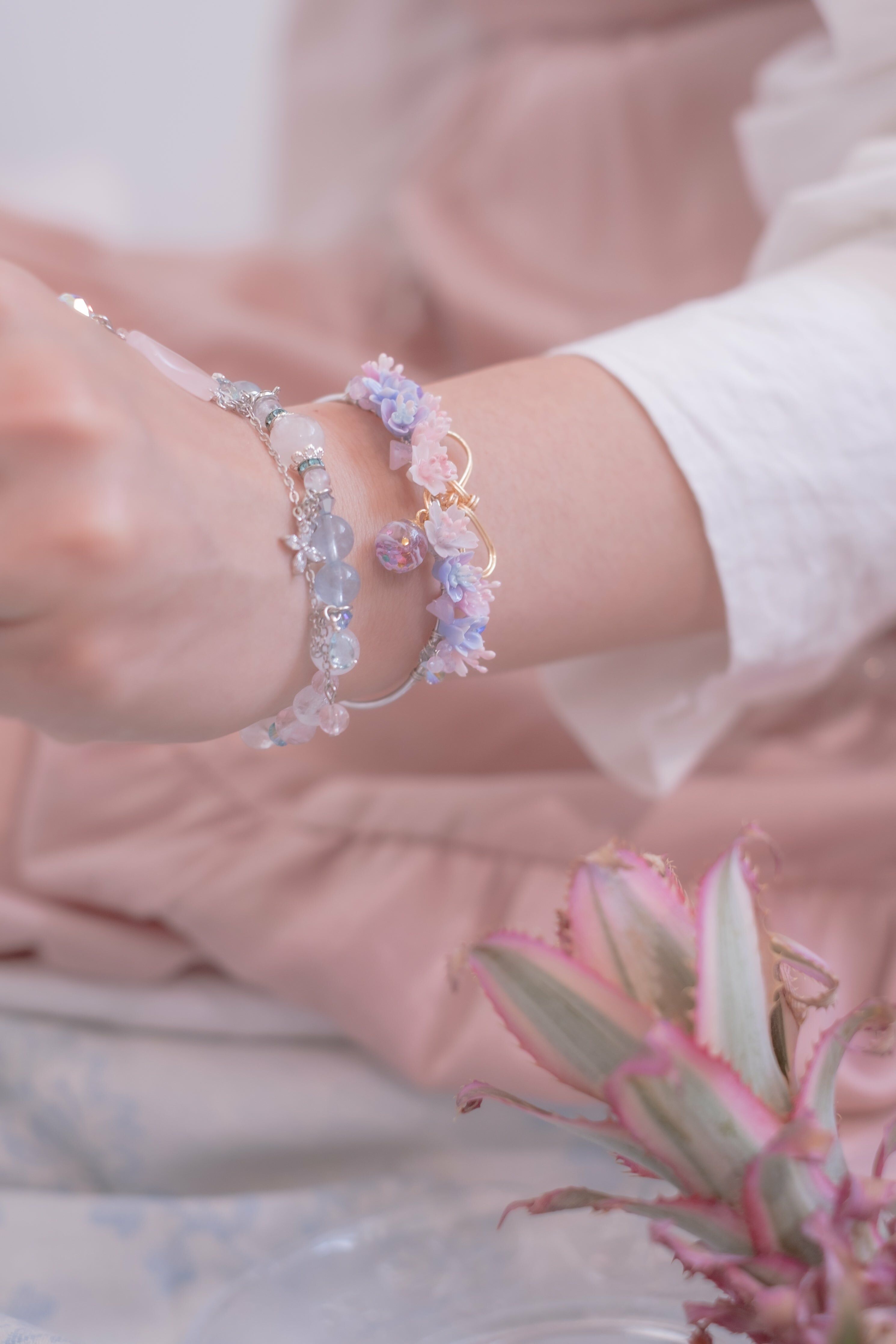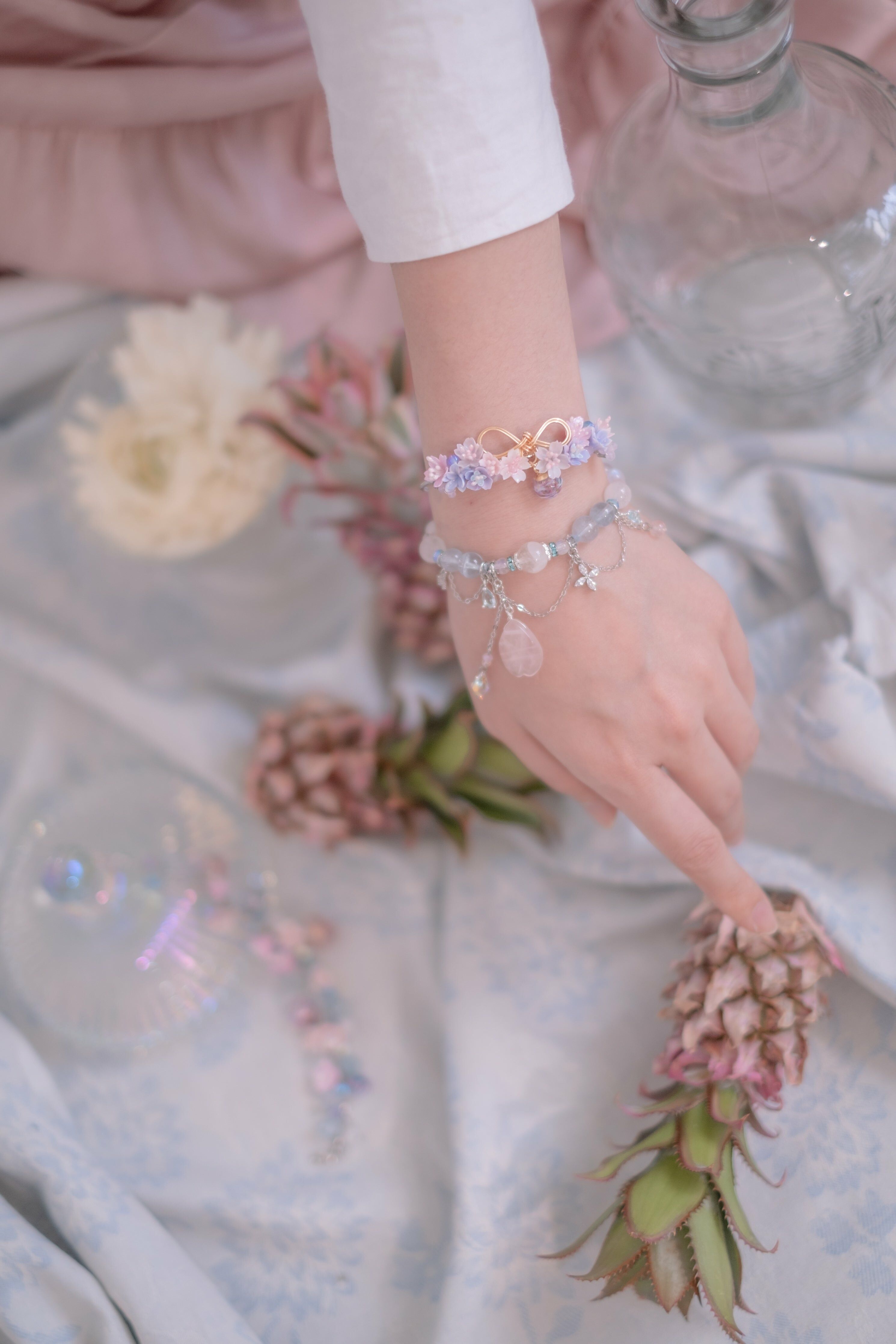 美國進口Beadsmith銀線| 施華洛世奇水晶 | 手製樹脂黏土花| UV強化保護層 | 金屬鍍銀手鐲