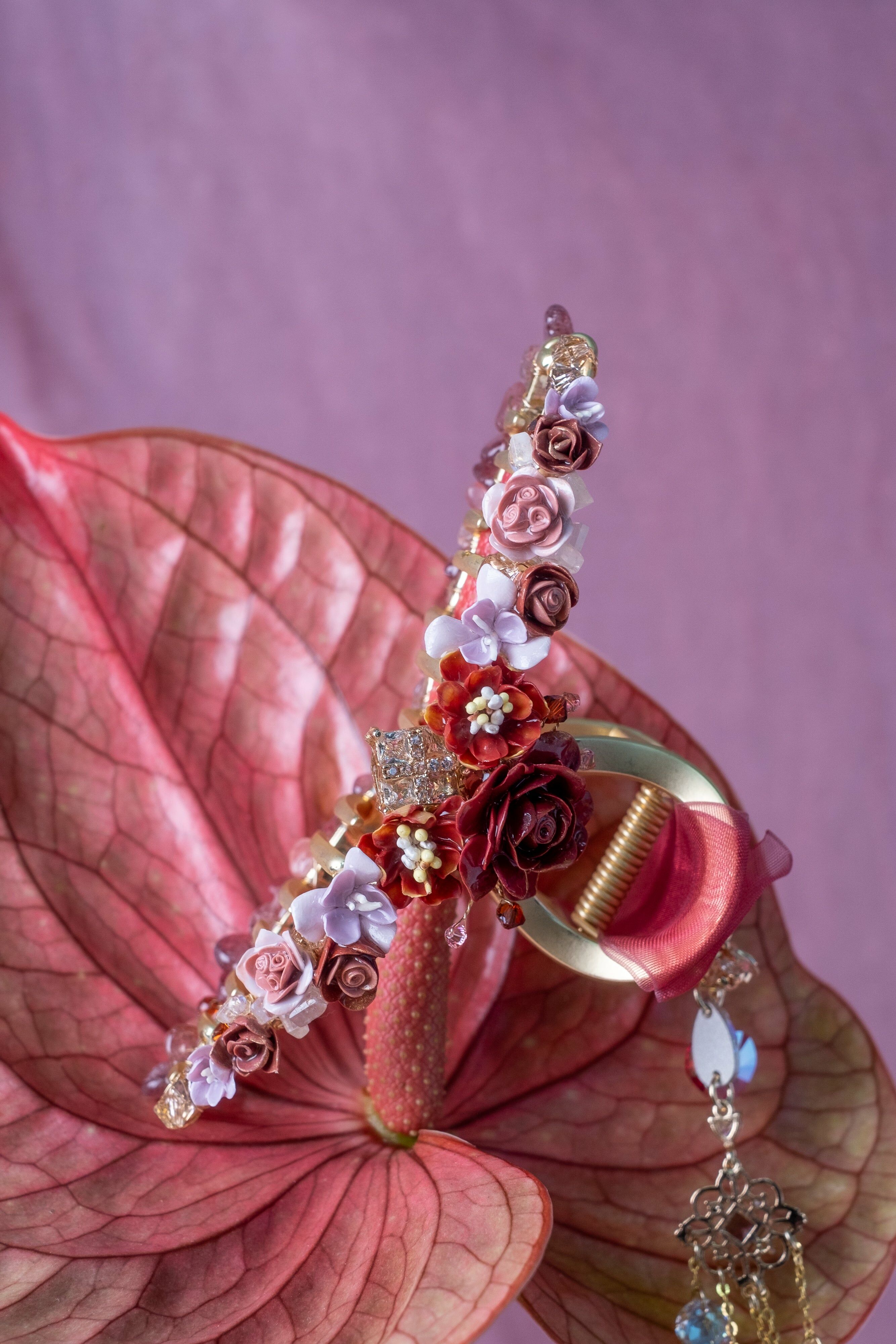 特長鯊魚髮佈滿盛開的薔薇和牡丹夾,打造專屬於花系女孩的帥氣低髮髻。髮夾尾端的吊飾可以整串拆出,加與不加各有千秋!單用髮夾帥氣俐落,加上吊飾則是高貴穩重。