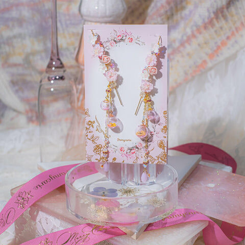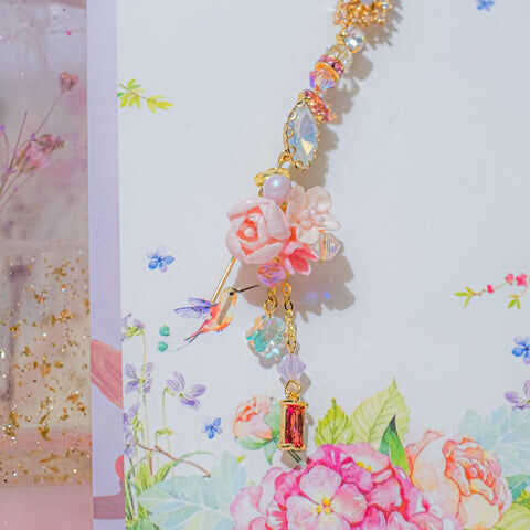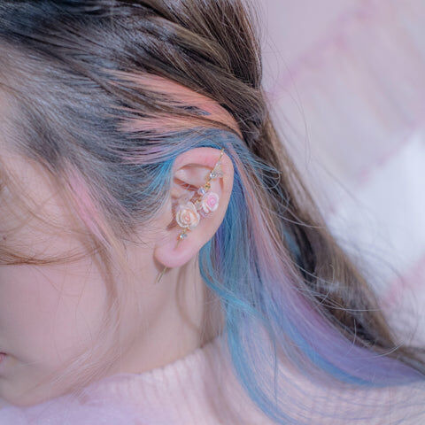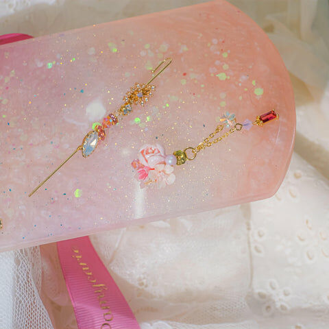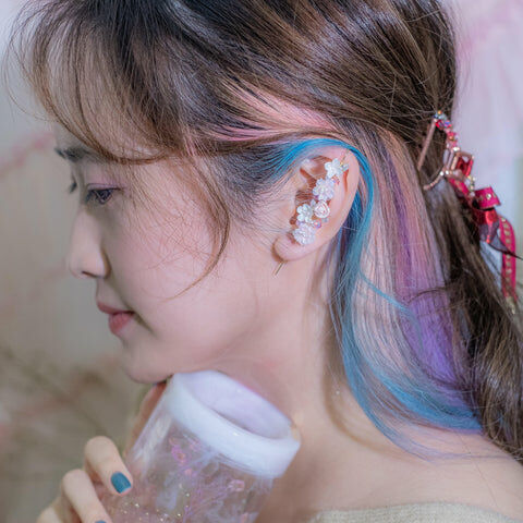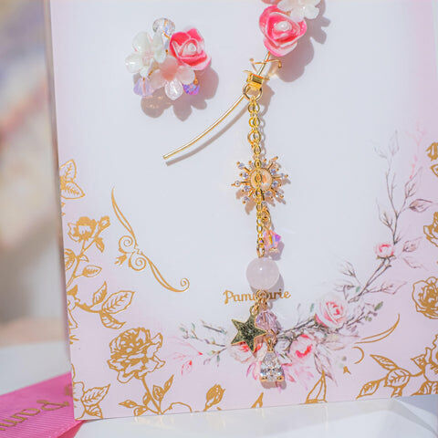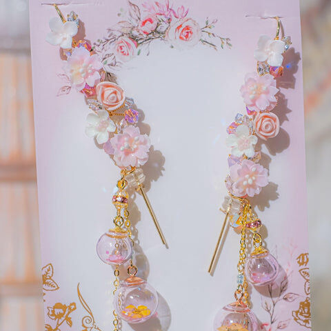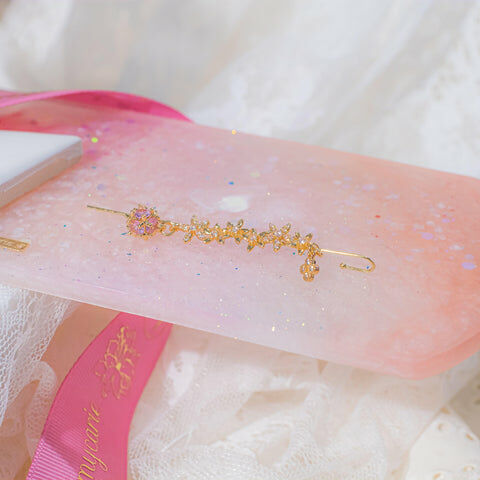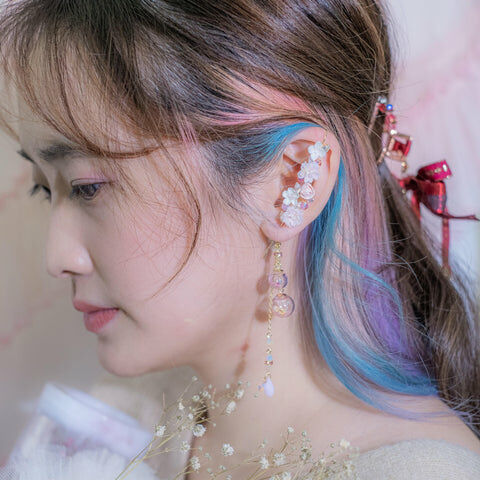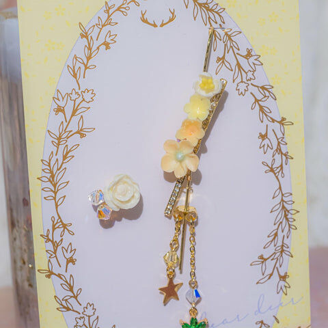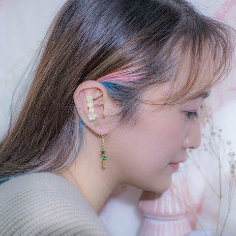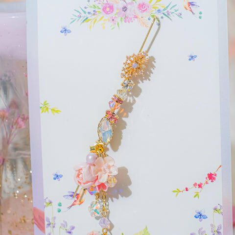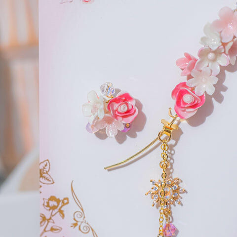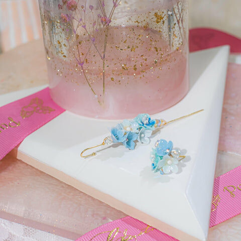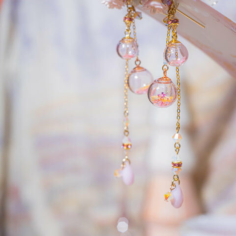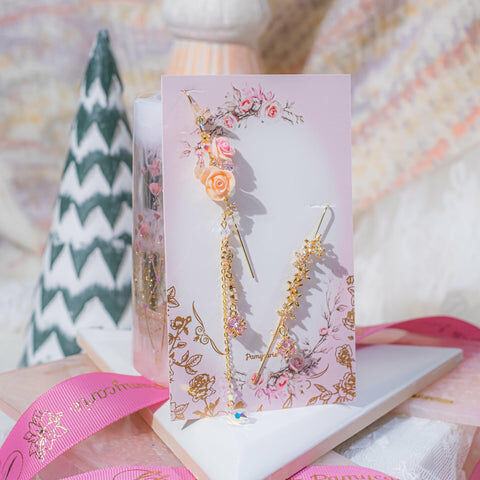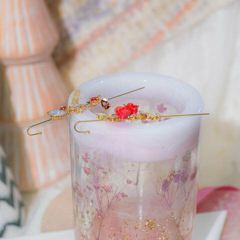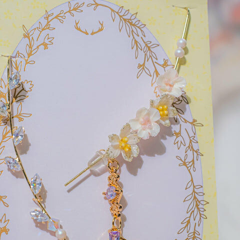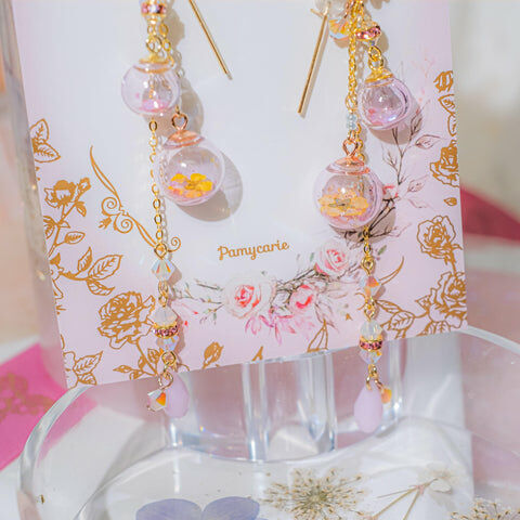 鍍金線 | 施華洛世奇水晶 | 手製樹脂黏土花 | UV膠強化保護層 | 鍍金925純銀耳釘