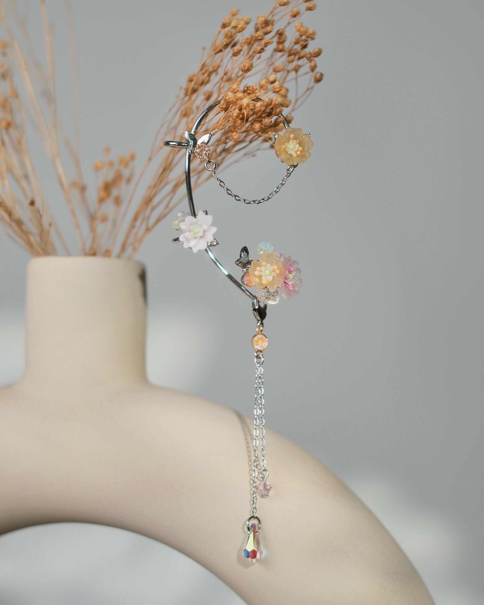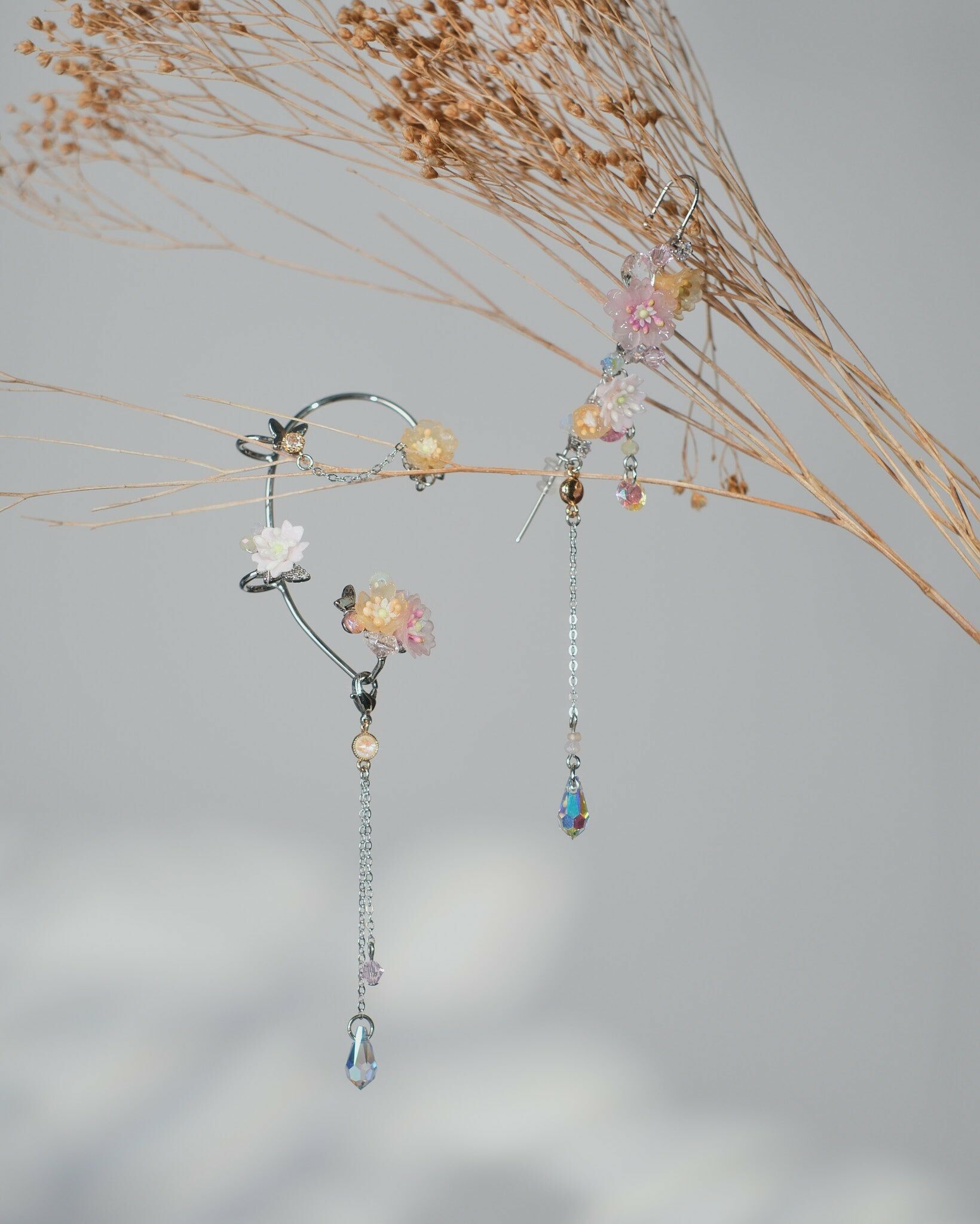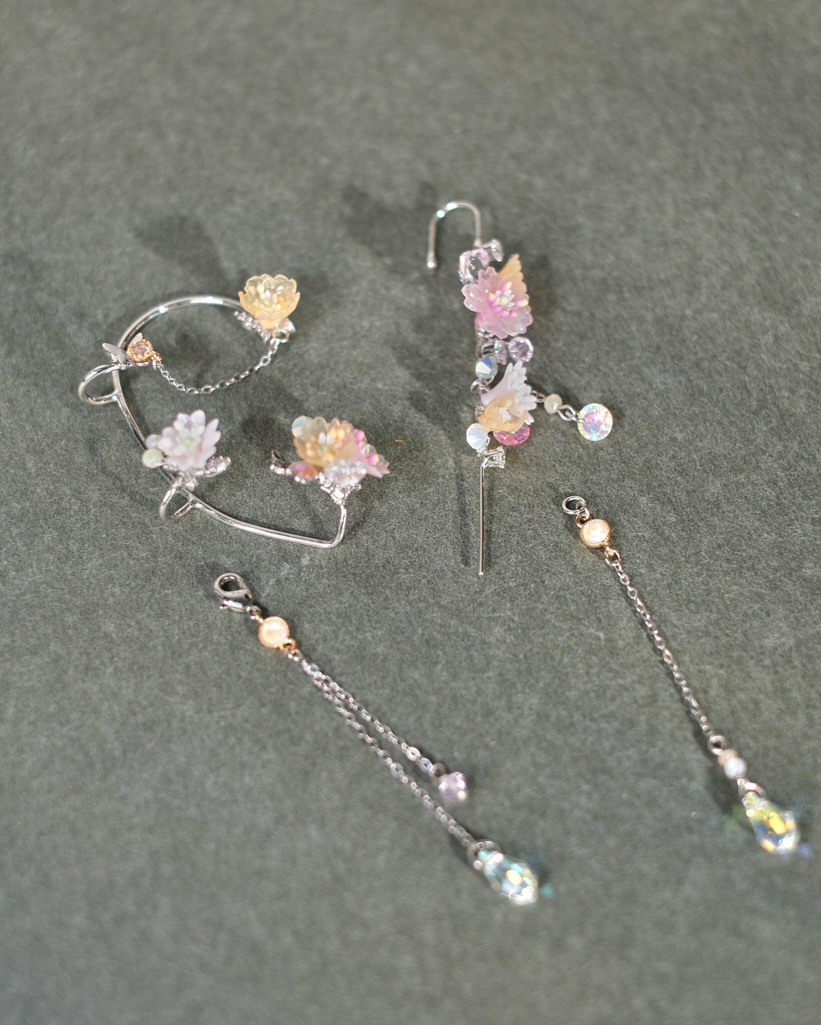 Sliver metal plated Ear Hook | S925 Ear Needle | Resin Clay Flower | Swarovski Crystals