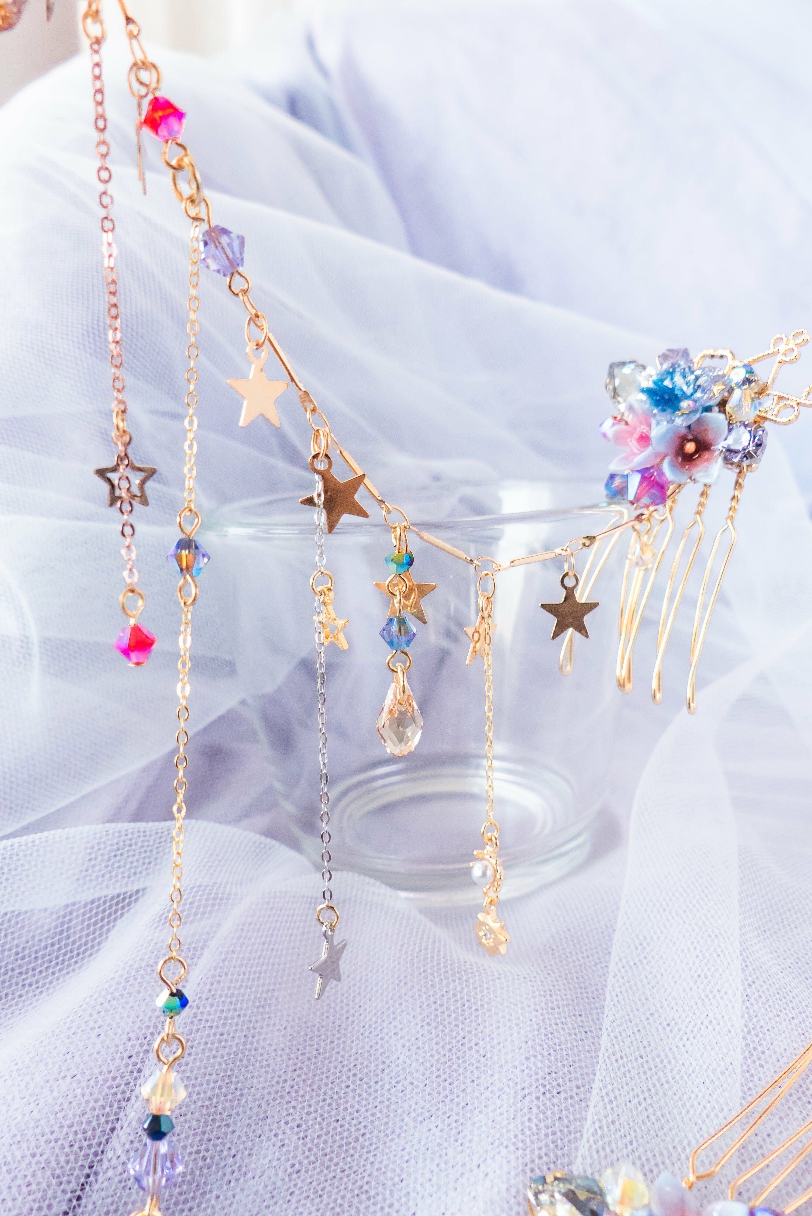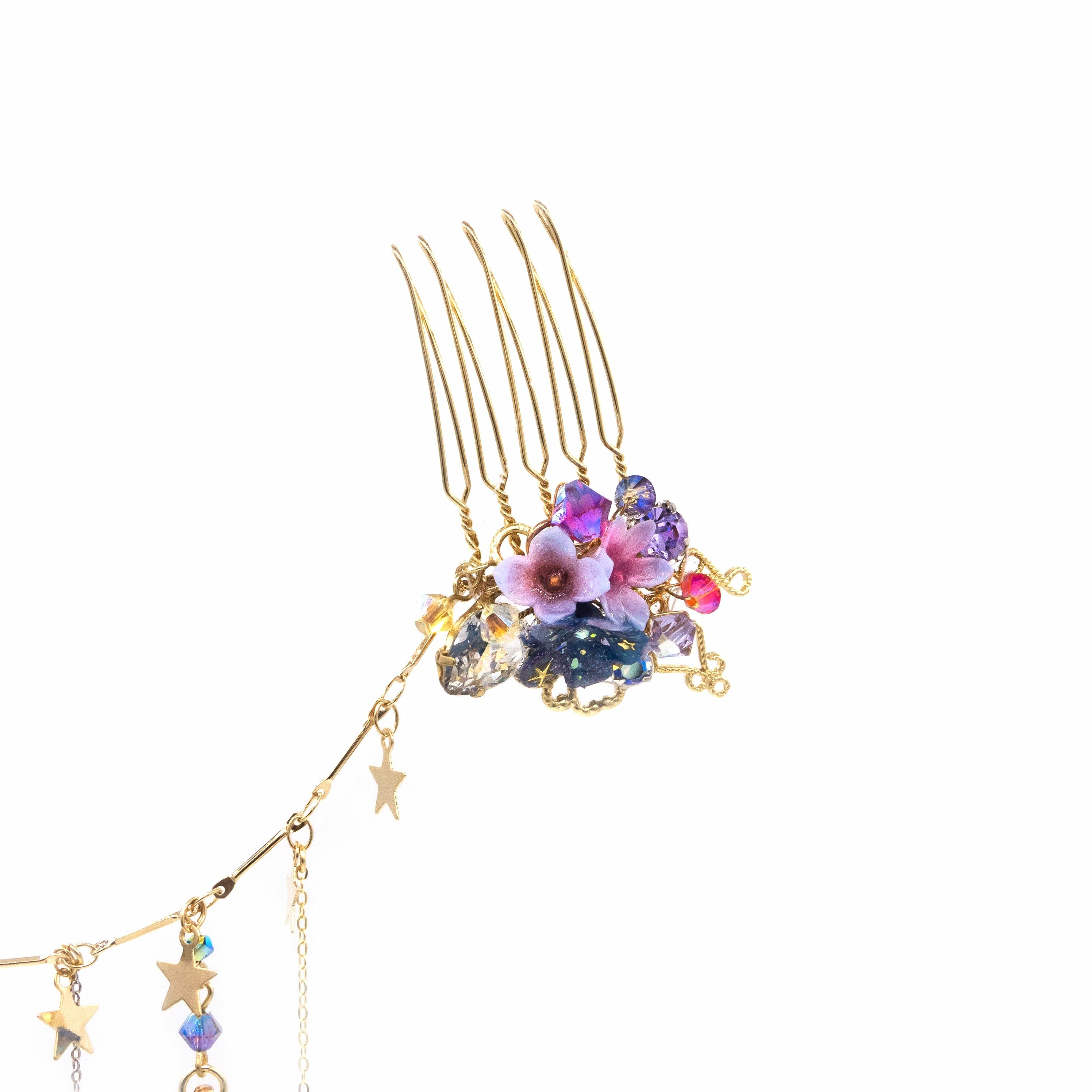 施華洛世奇水晶 | 手製樹脂黏土花 | UV膠強化保護層 | 鍍14K金金屬鏈飾 | 鍍金髮梳