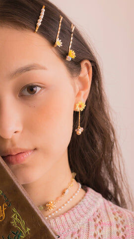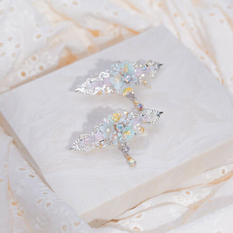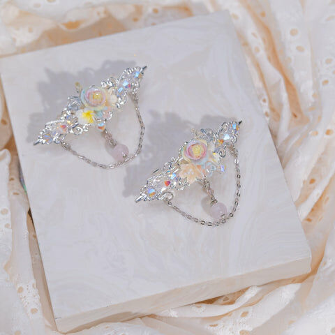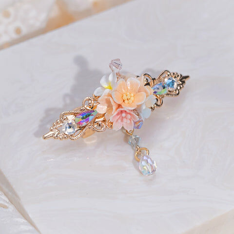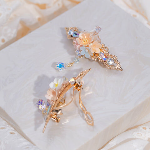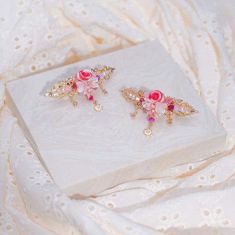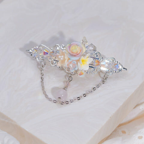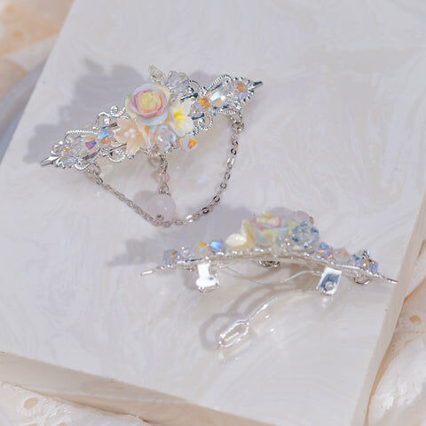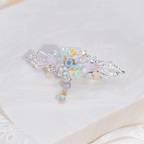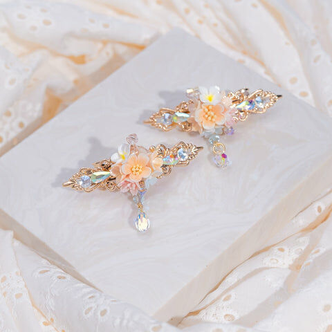 鍍金線 | 施華洛世奇水晶 | 手製樹脂黏土花 | UV膠強化保護層 | 金屬髮夾