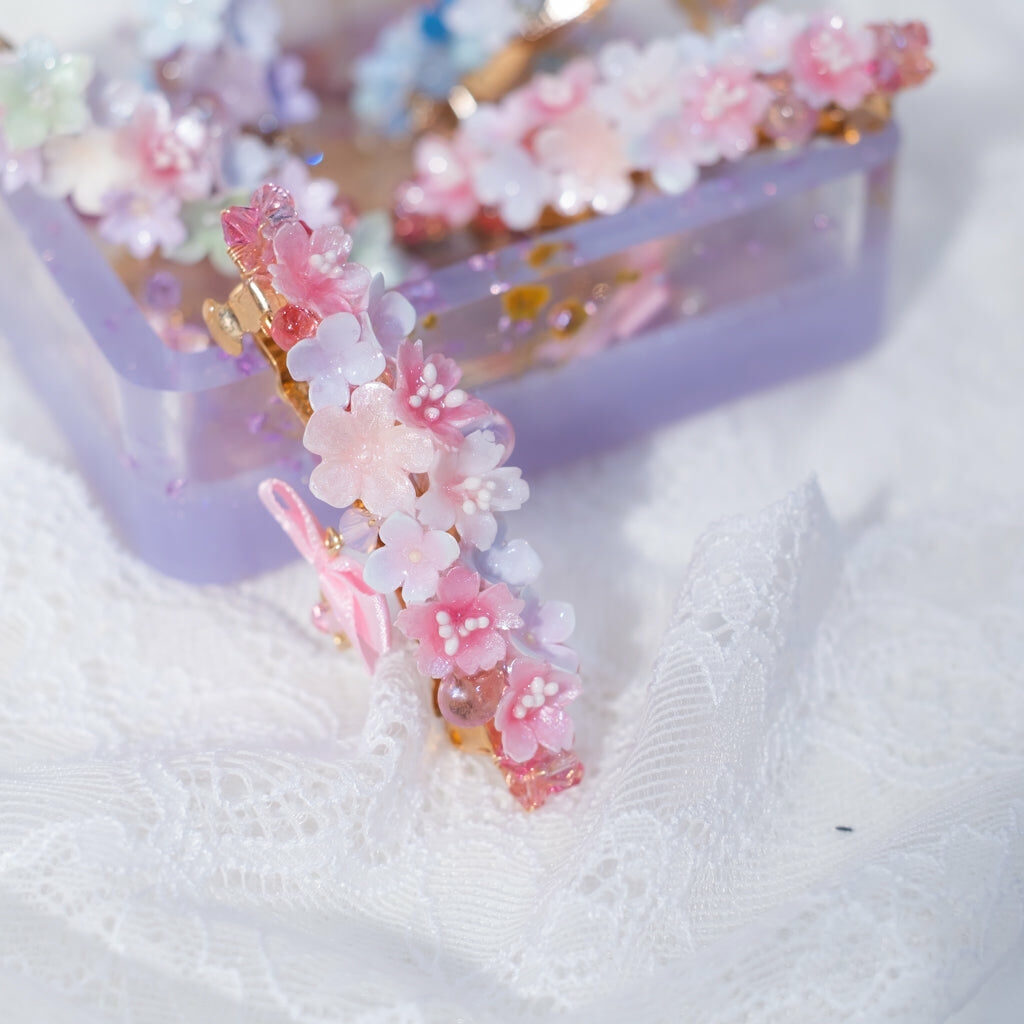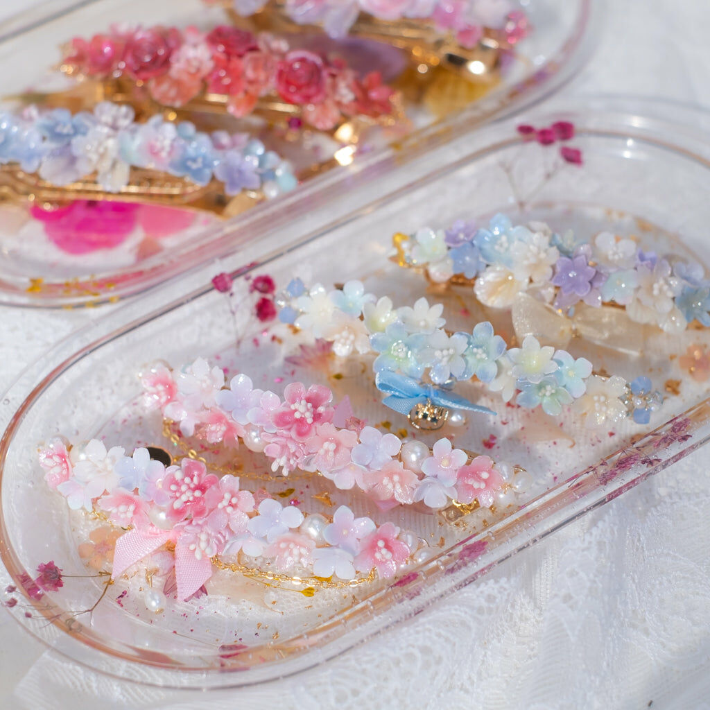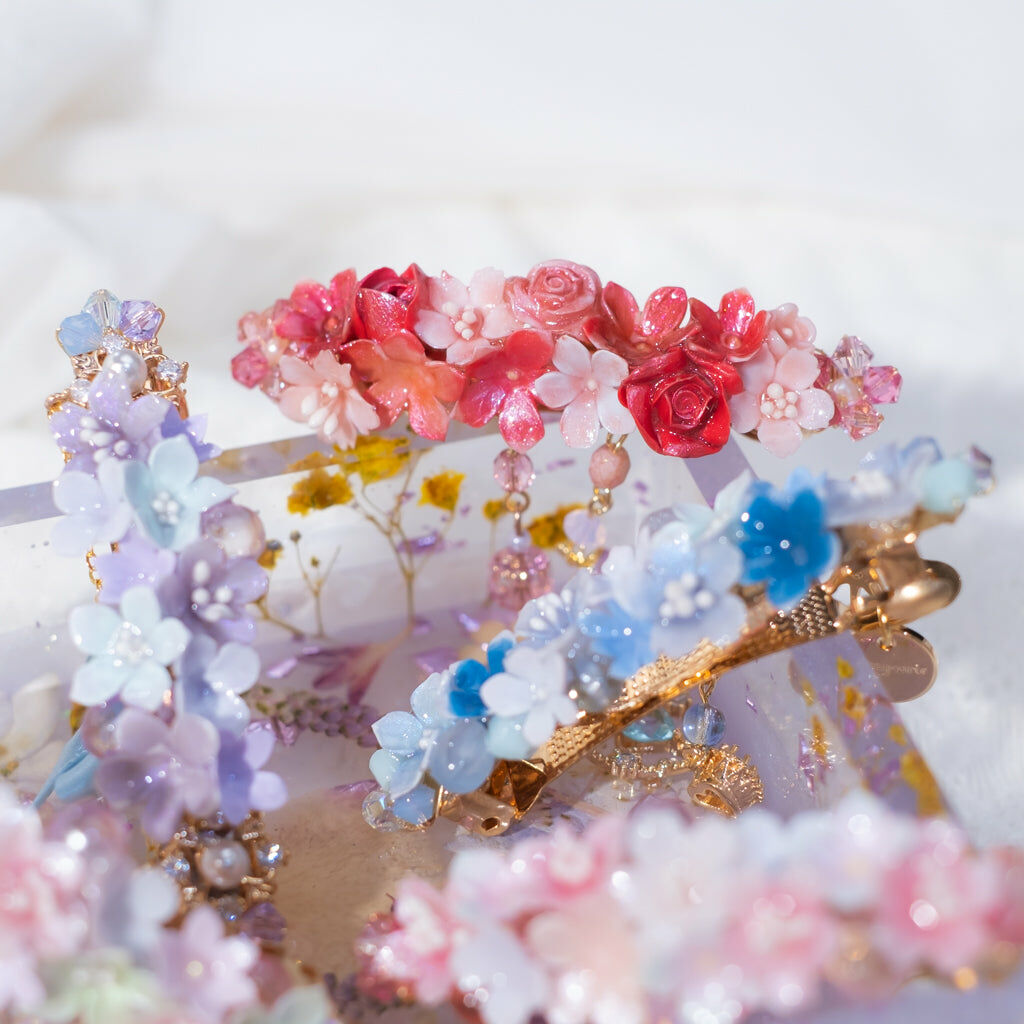 鍍金線 | 施華洛世奇水晶 | 手製樹脂黏土花 | UV膠強化保護層 | 金屬髮夾