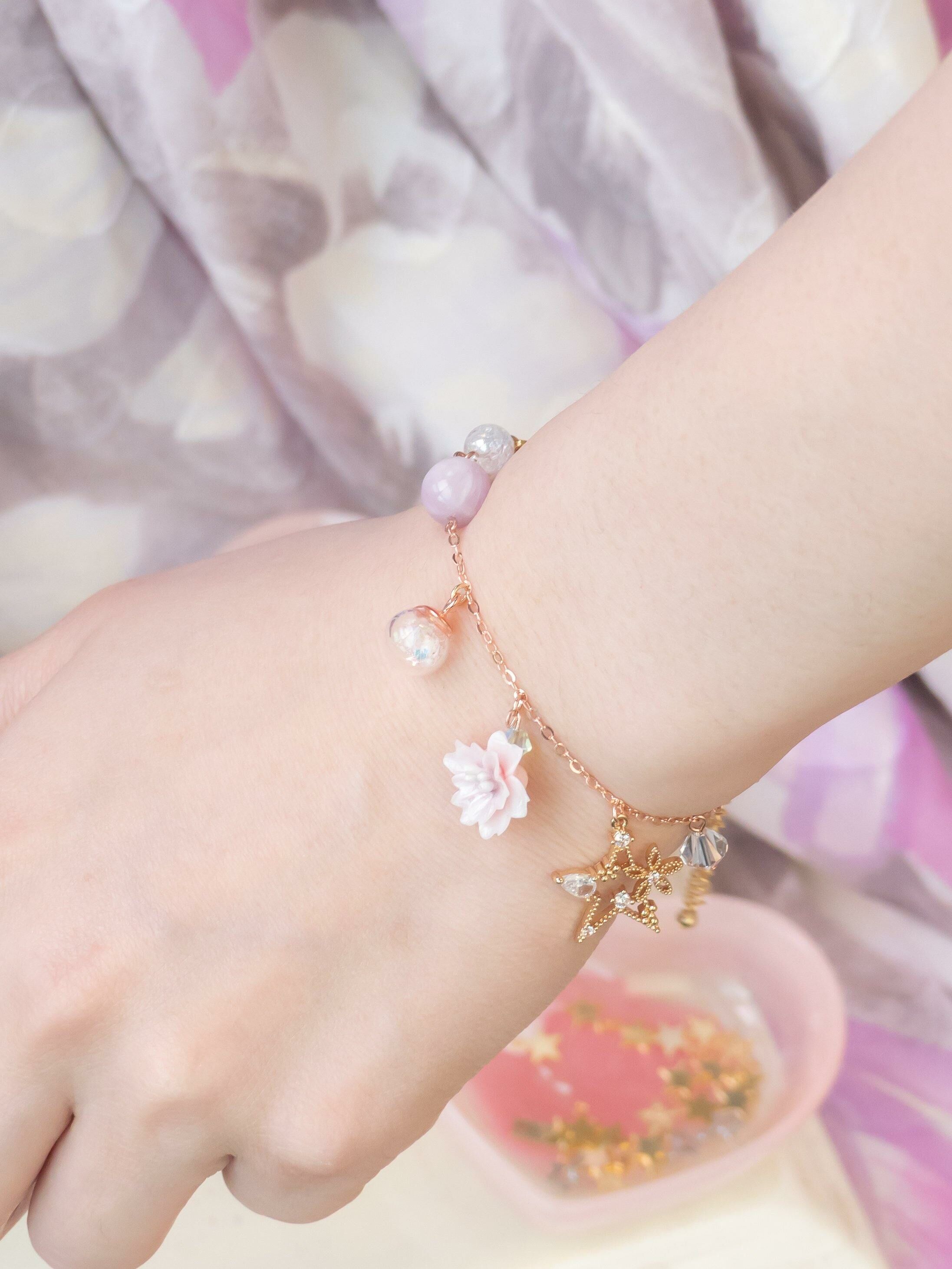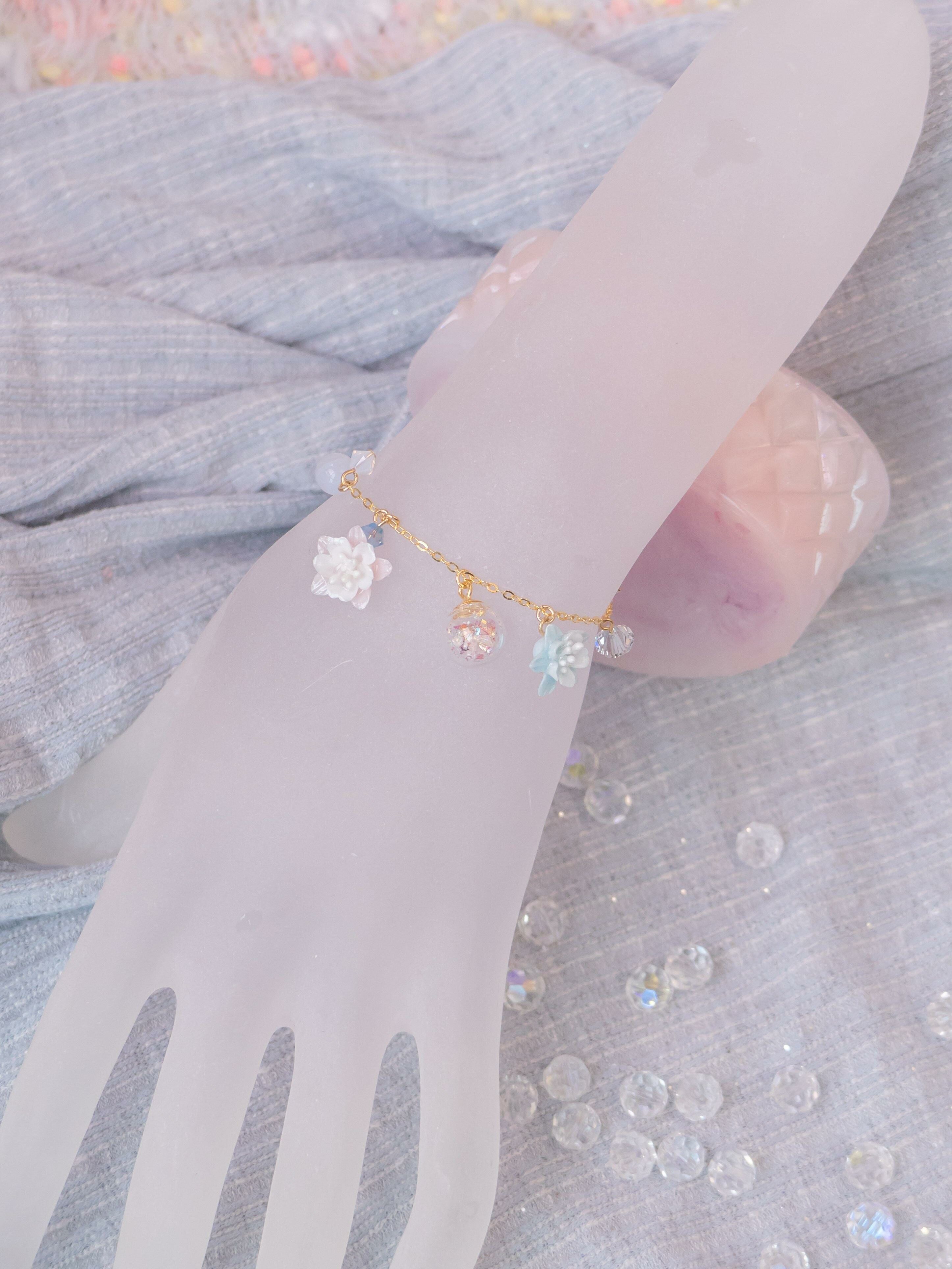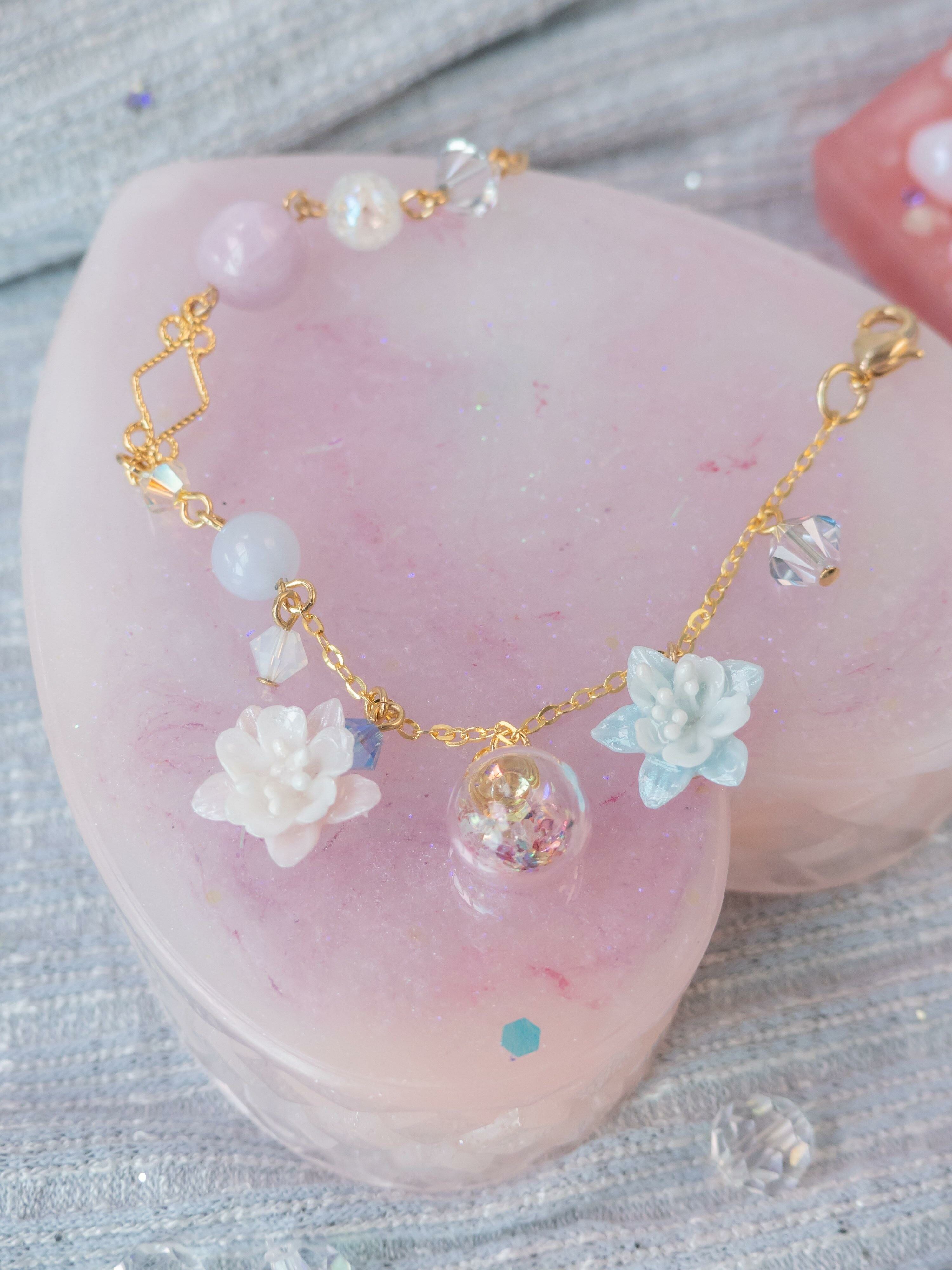 Swarovski Crystal Bead | Blue lace agate | Kunzite | Handcrafted Resin Clay Flower | 14K Gold-plated Ornaments | 14K Gold-plated 925 Silver Bracelet
