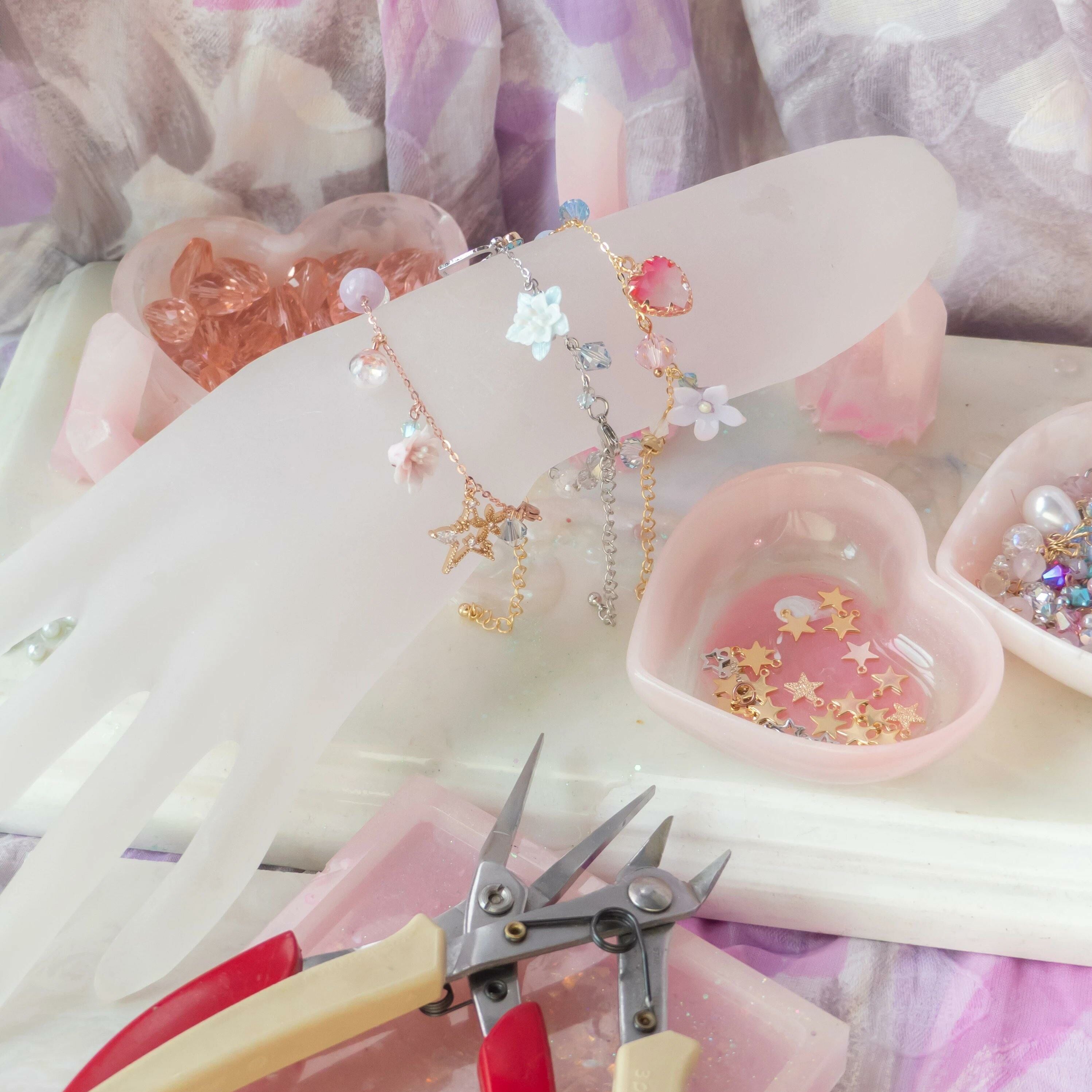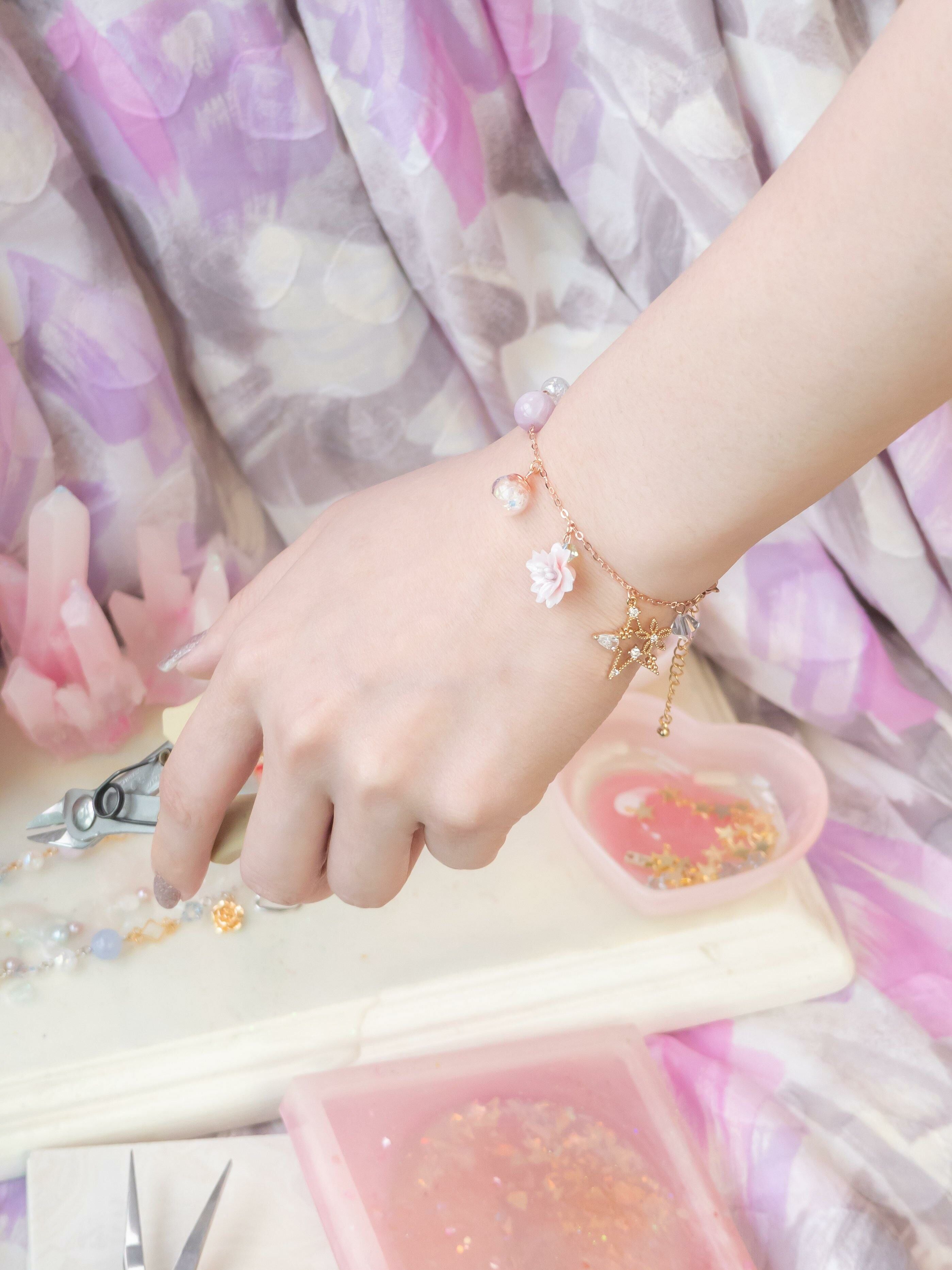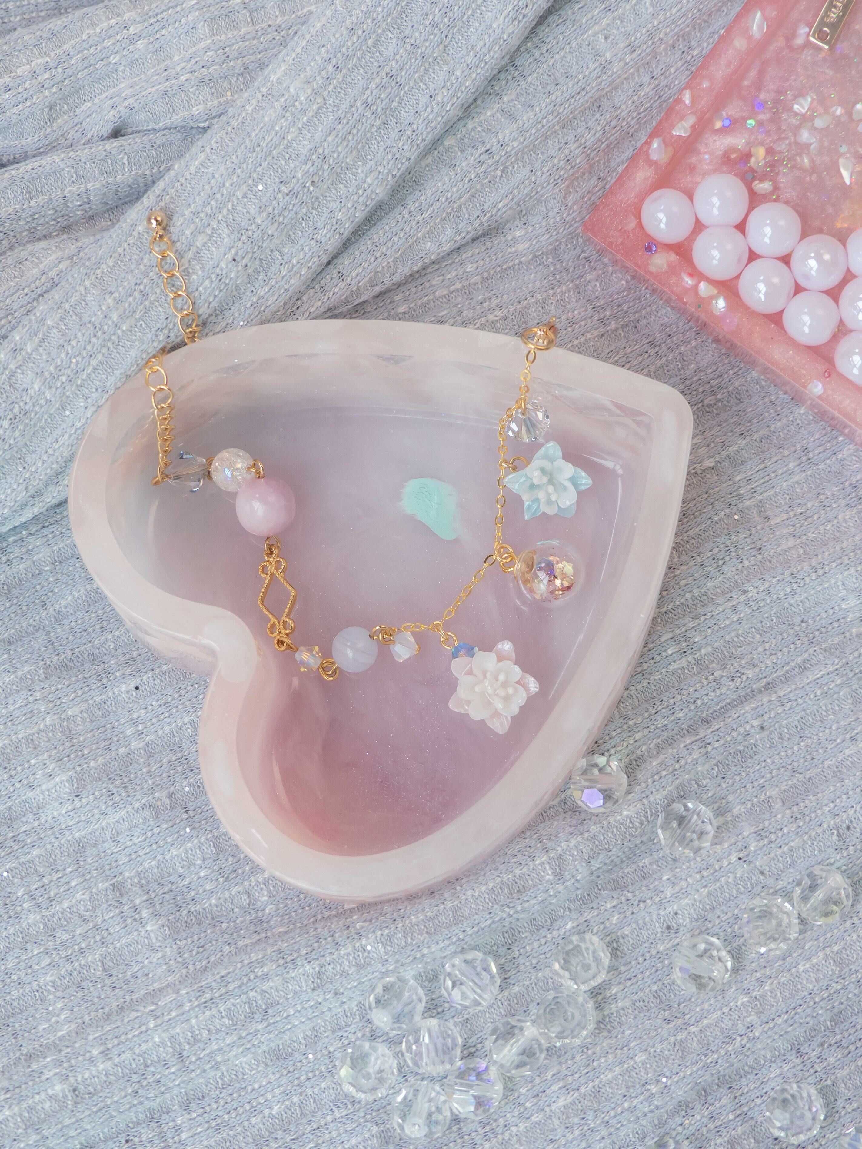 Swarovski Crystal Bead | Blue lace agate | Kunzite | Handcrafted Resin Clay Flower | 14K Gold-plated Ornaments | 14K Gold-plated 925 Silver Bracelet