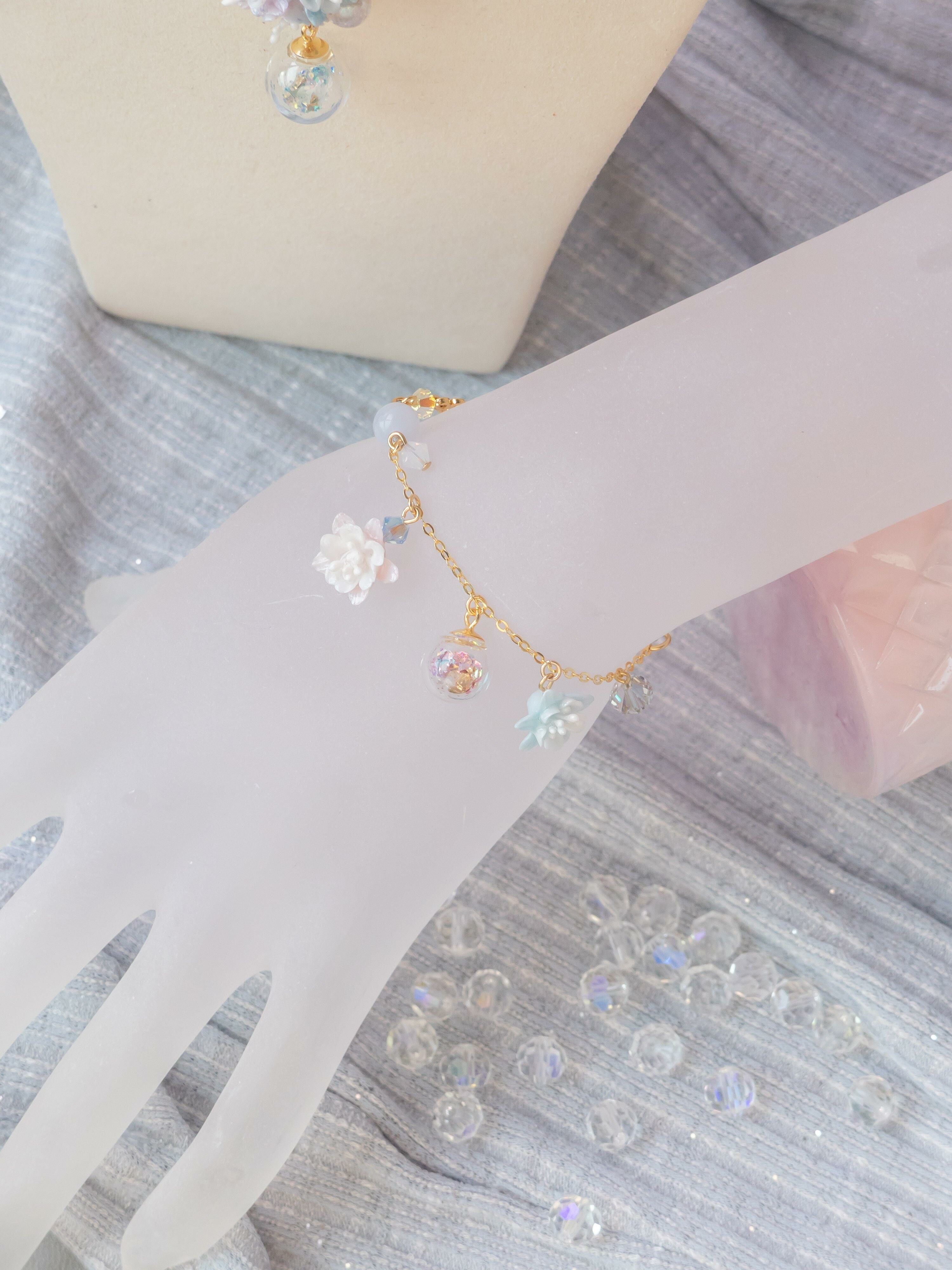 施華洛世奇水晶 | 藍紋瑪瑙 | 紫鋰輝 |手製樹脂黏土花 | 鍍14K金配件 | 925純銀手鍊