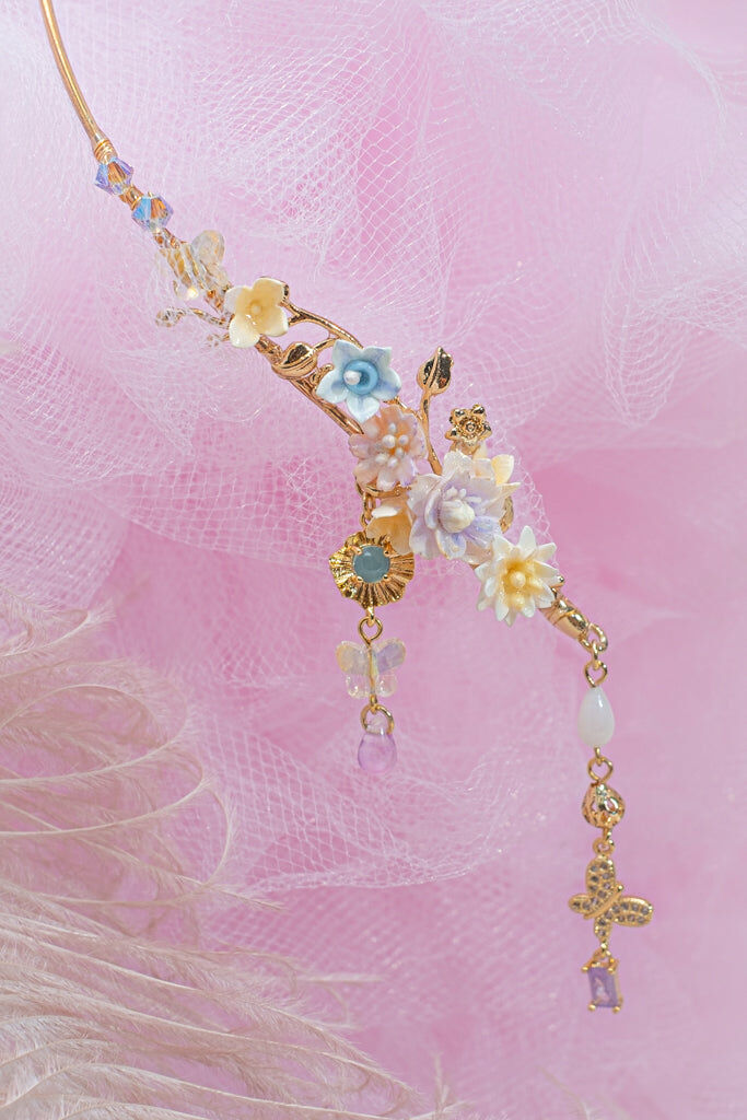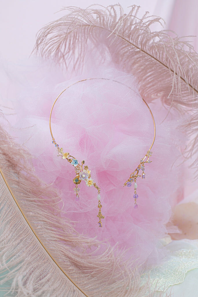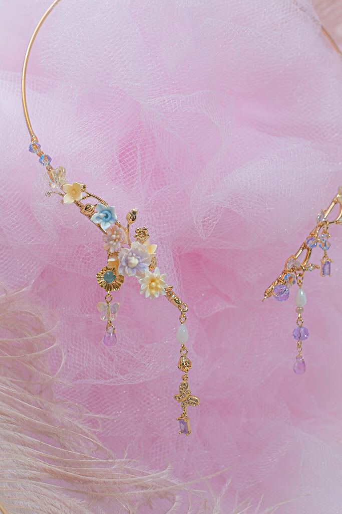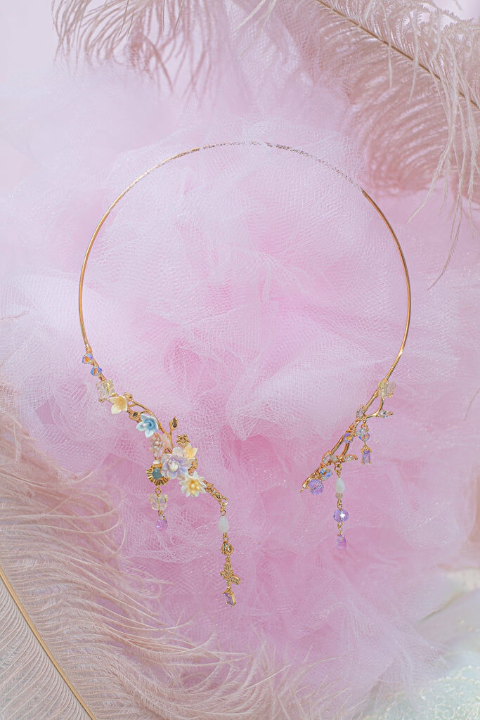 Handcrafted Cold Polymer Clay Flowers | UV hardening Protection Gel | Swarovski Crystal | 14K Gold-plated Cuff Necklace