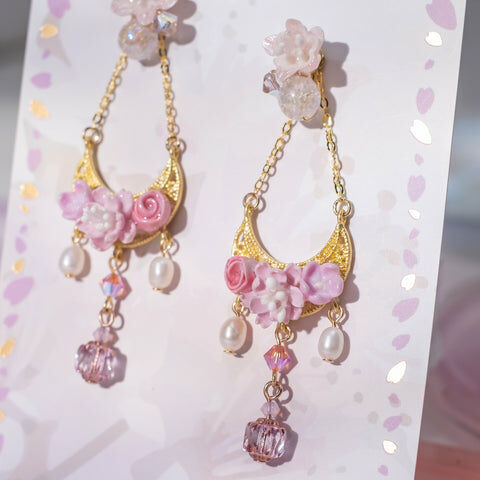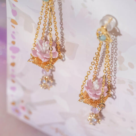 鍍金線 | 施華洛世奇水晶 | 手製樹脂黏土花 | UV膠強化保護層 | 鍍金925純銀耳釘