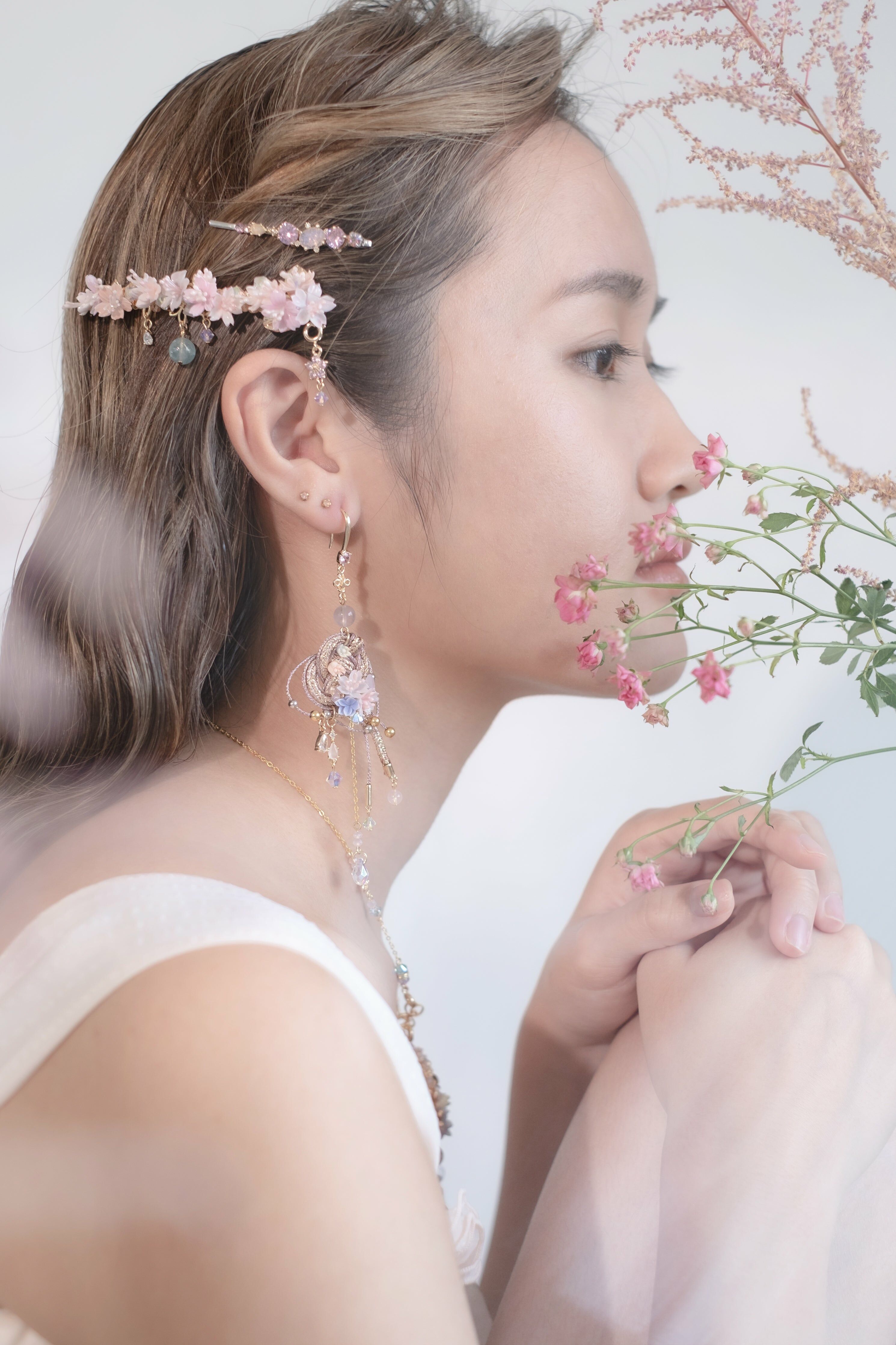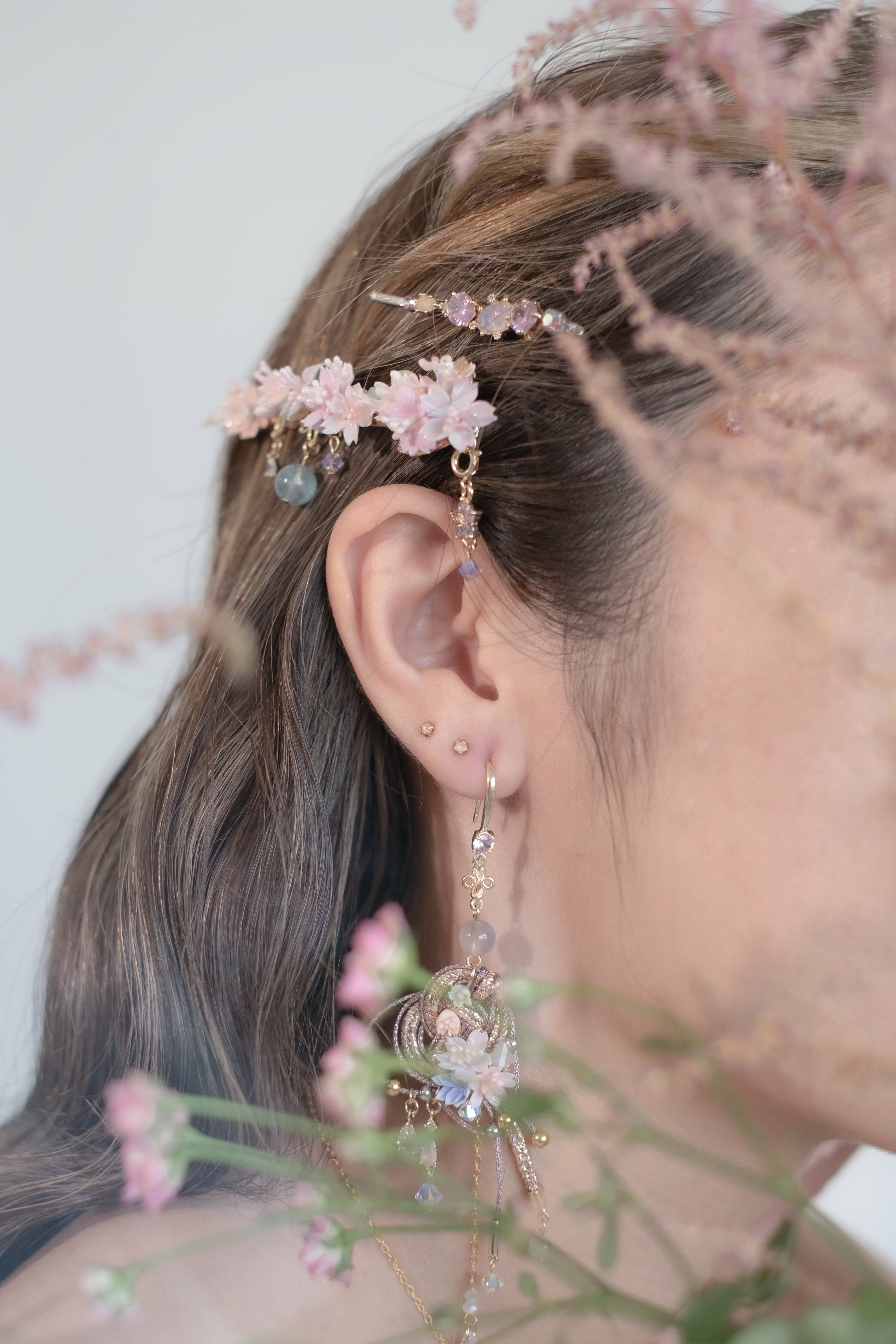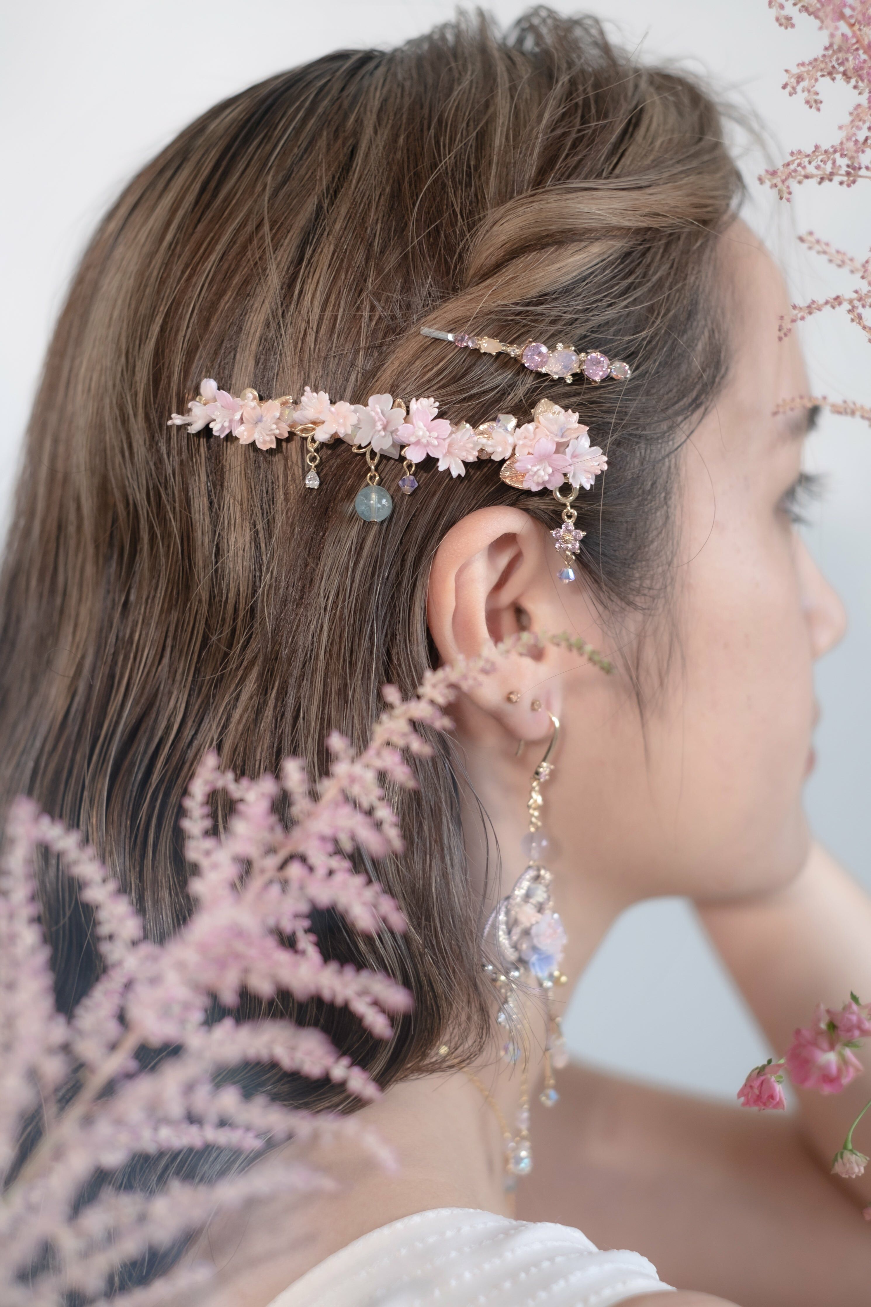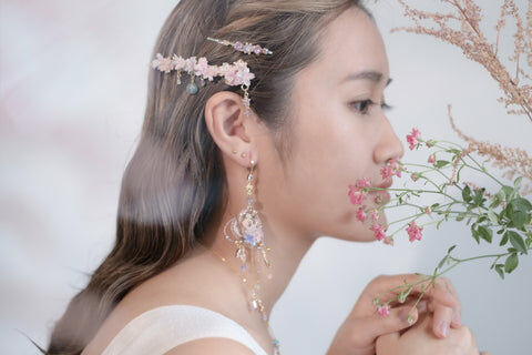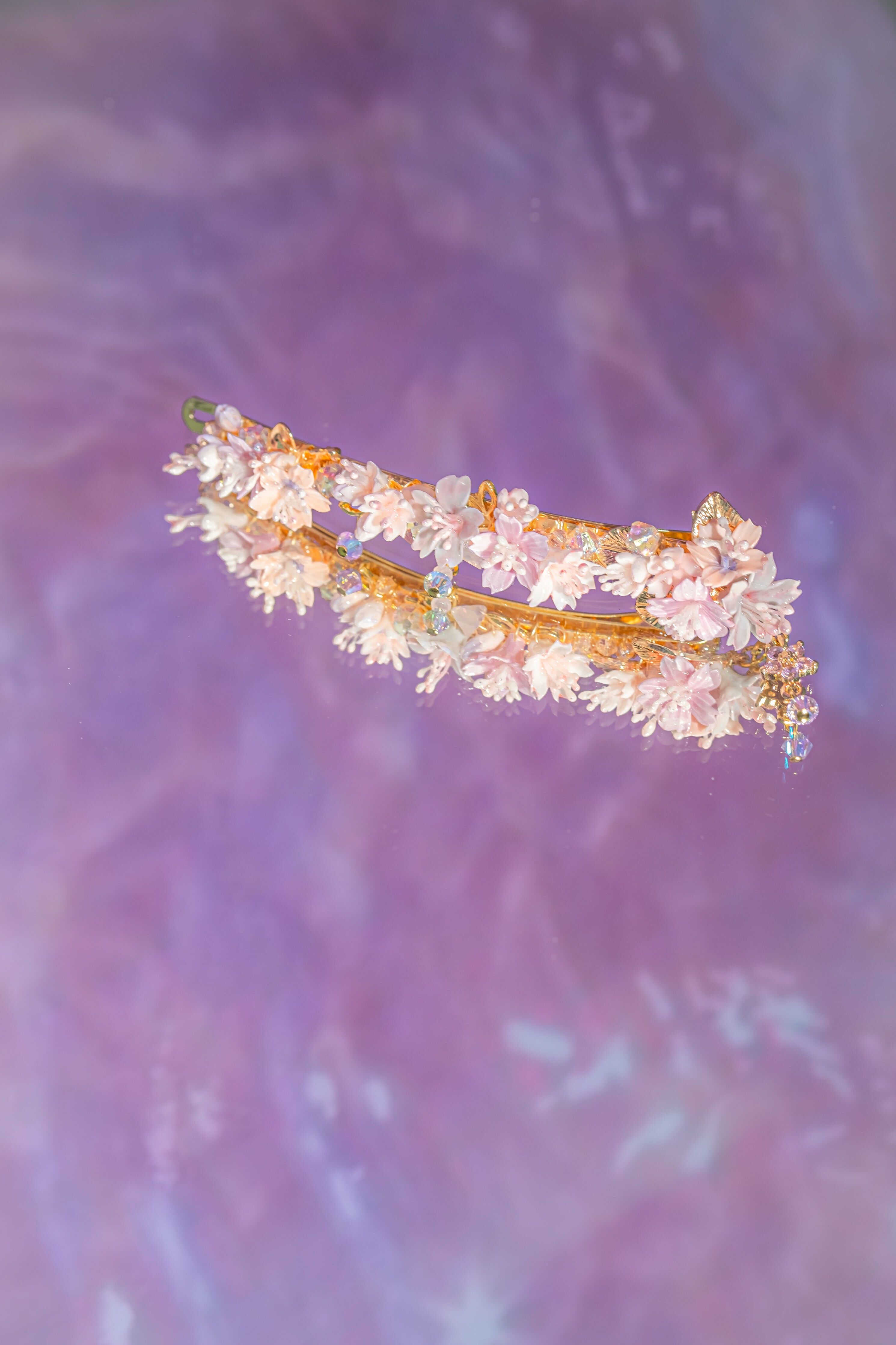 美國進口Beadsmith銀線 | 施華洛世奇水晶 | 手製樹脂黏土花| UV強化保護層 | 鍍金髮夾