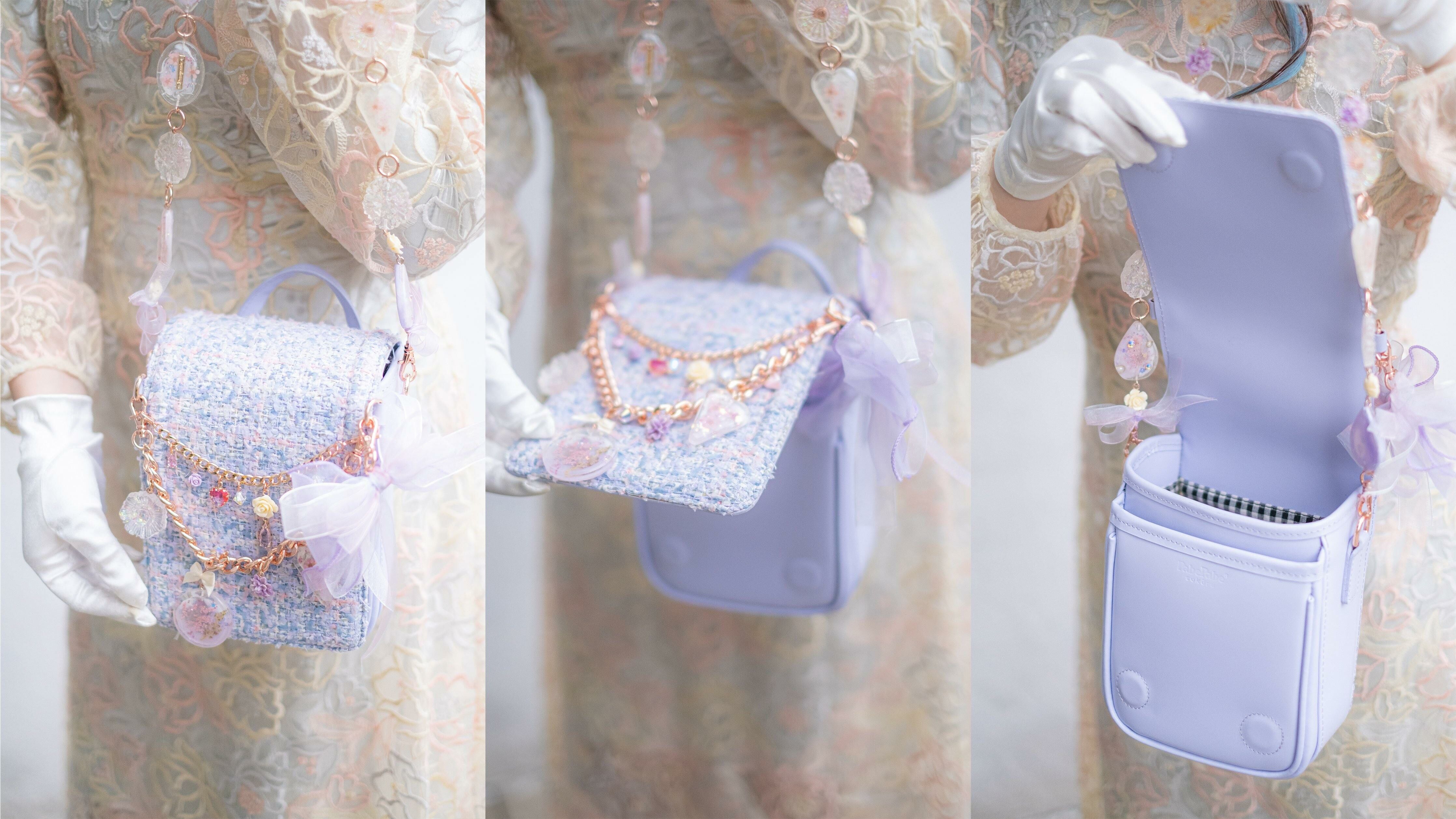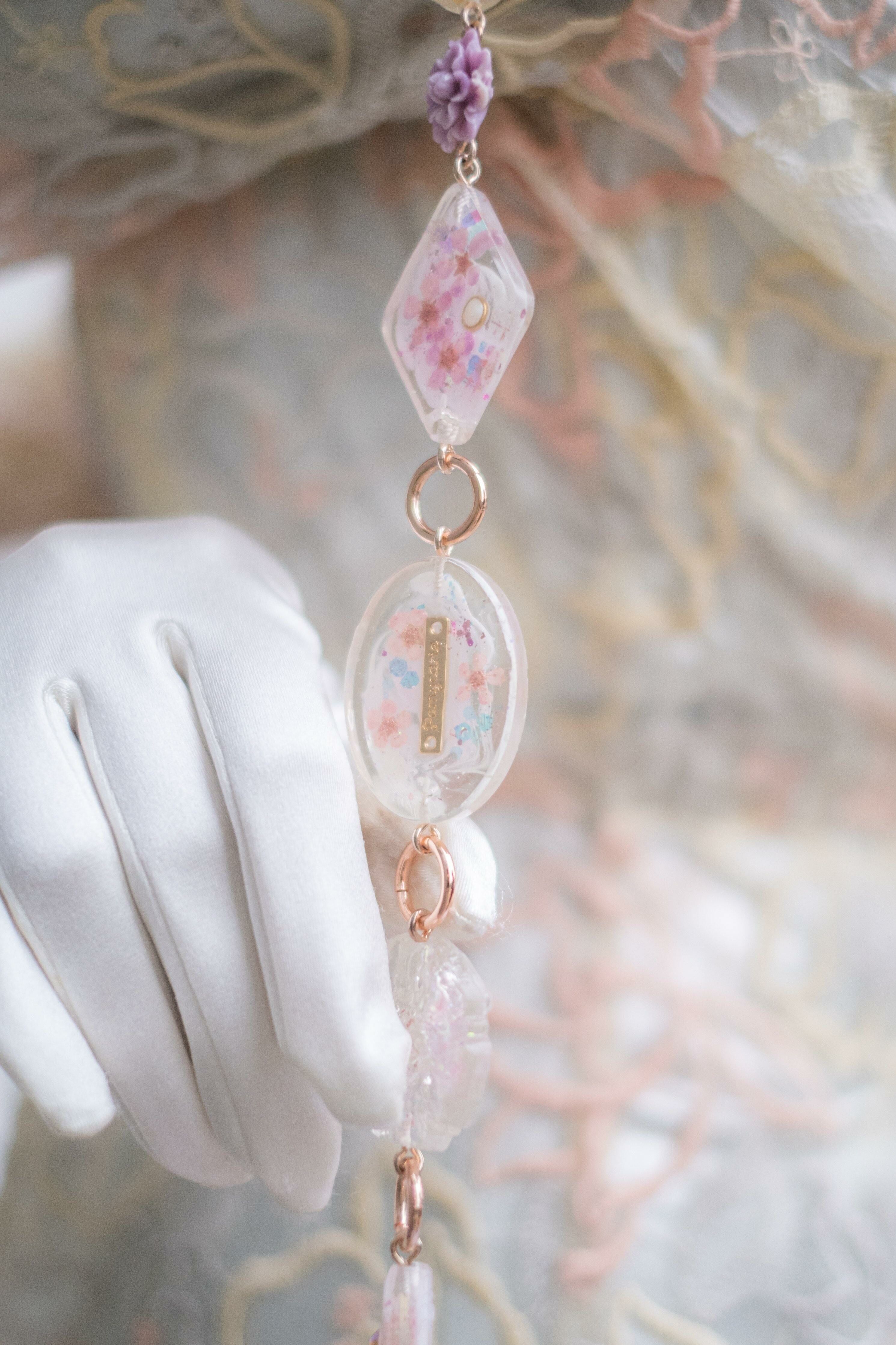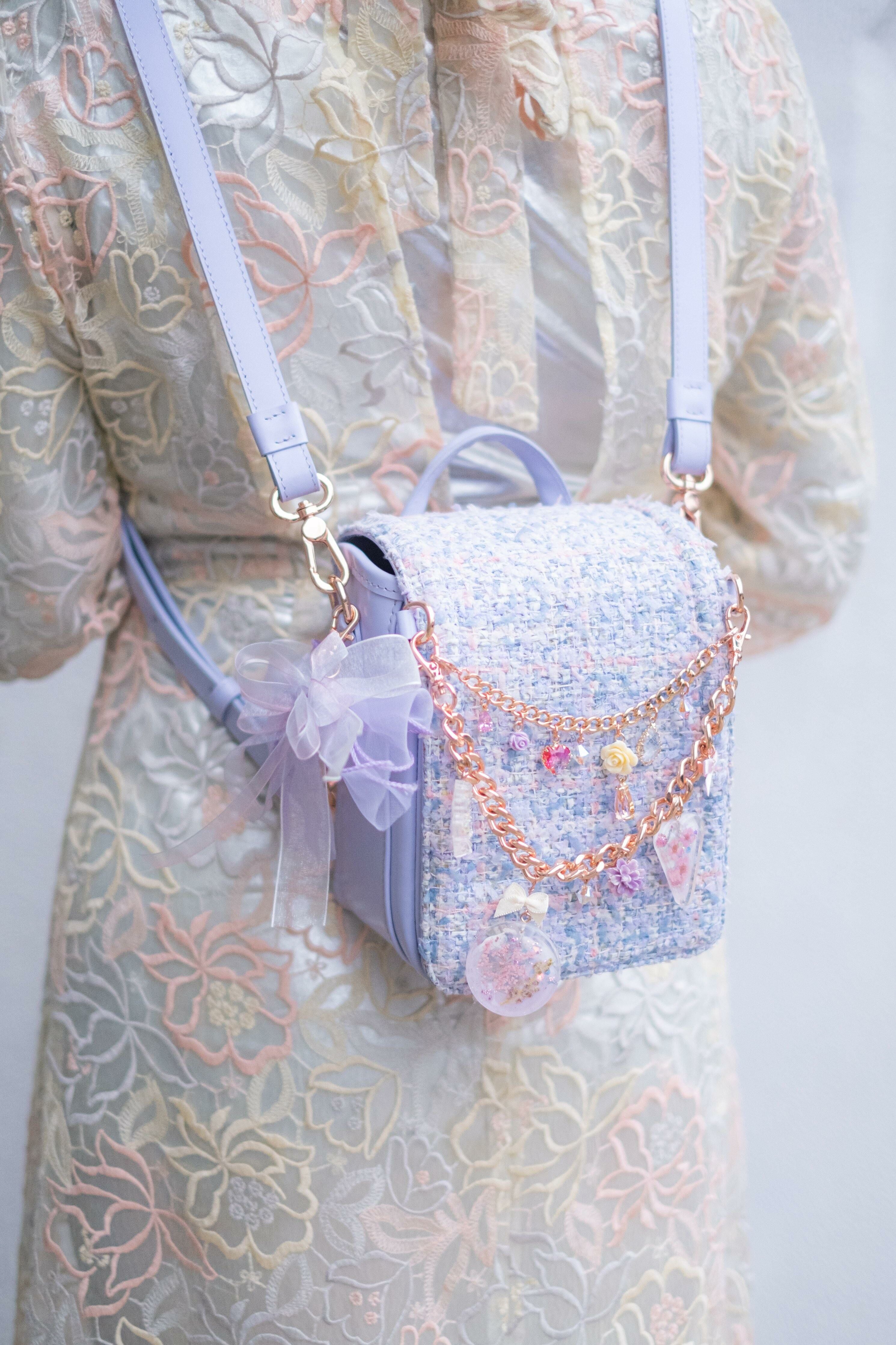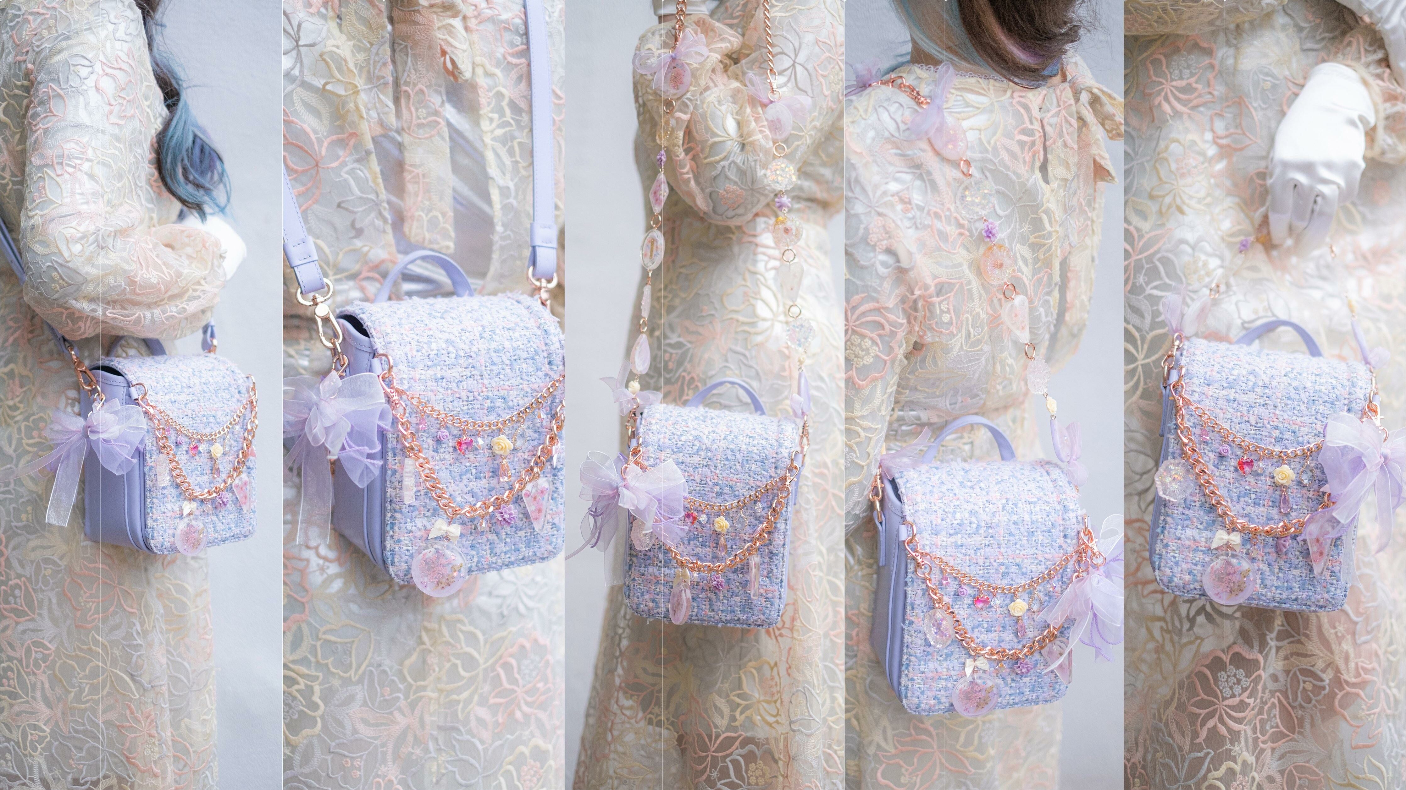 Pamycarie手製的肩帶和袋子吊飾,所使用的是我們香港手工製作的樹脂吊飾,再一顆顆組合成可拆式袋子配飾。每顆也有乾花、亮片和暈染顏料營造不同的意境,另外也加入巴洛克裝飾風格元素配件,絲帶蝴蝶結和施華洛水晶。將所有東西連接就成為閃閃發亮的復古飾帶,猶如多用途的飾物把袋子裝飾起來,令袋子成為一件藝術品。