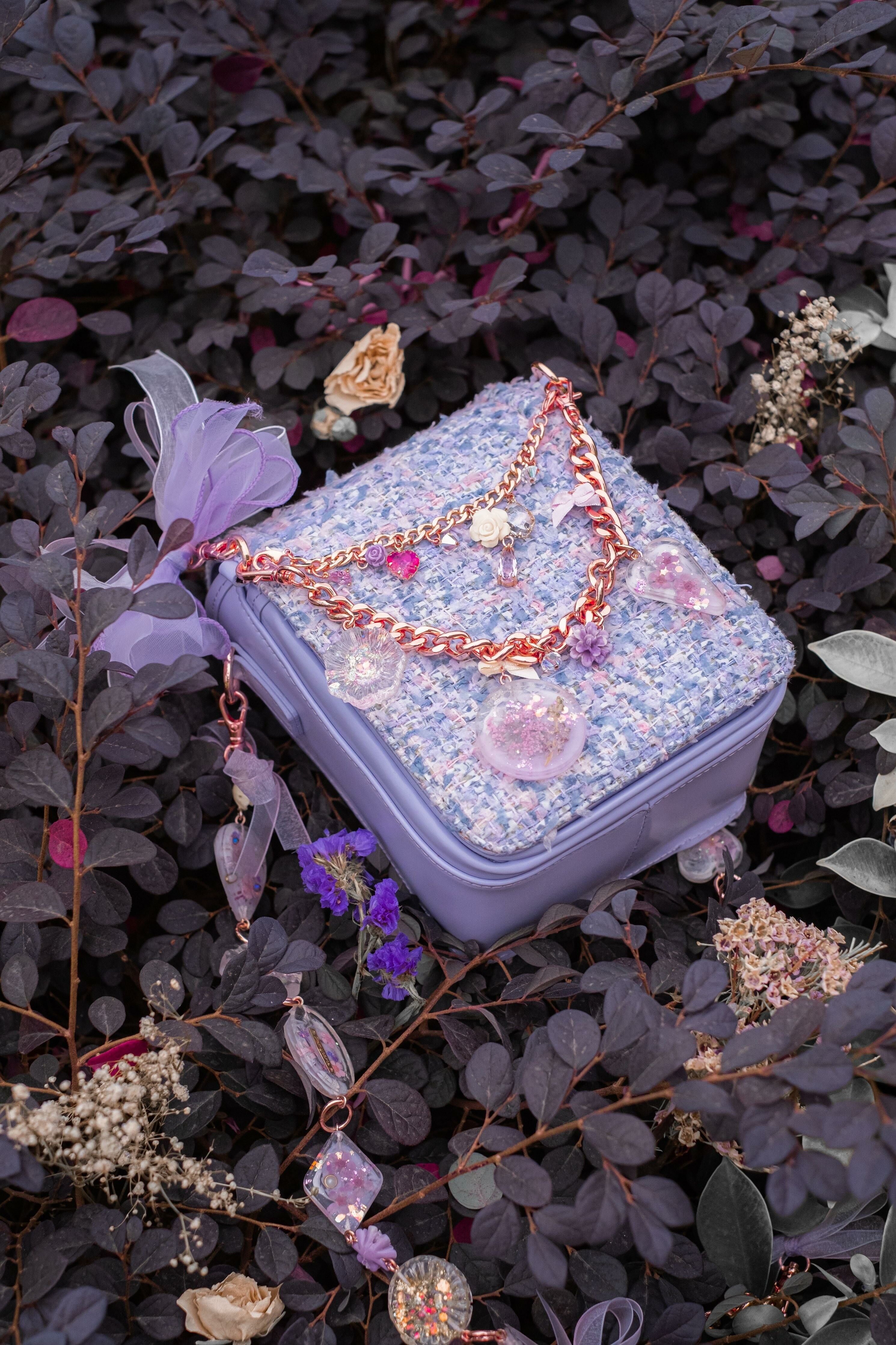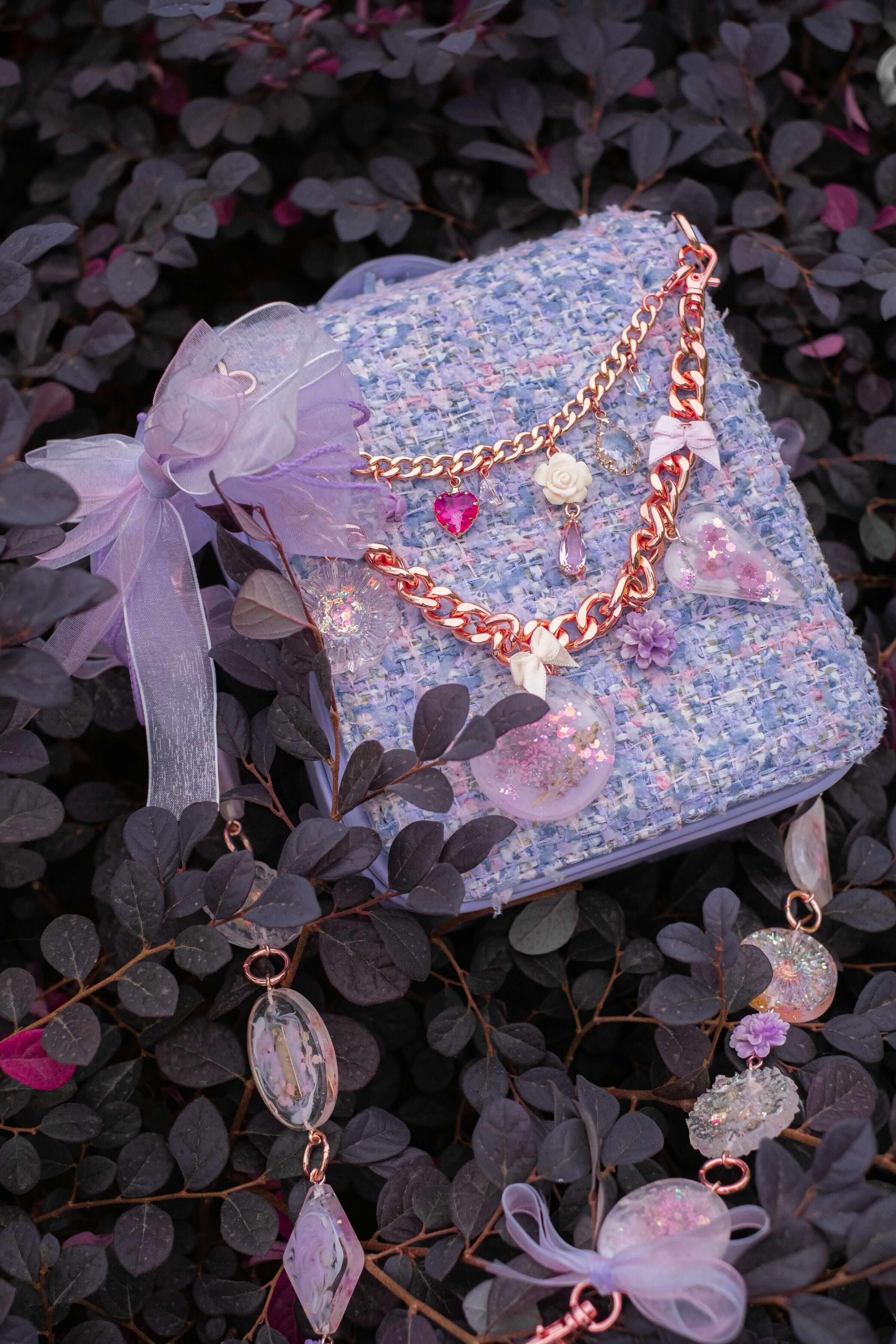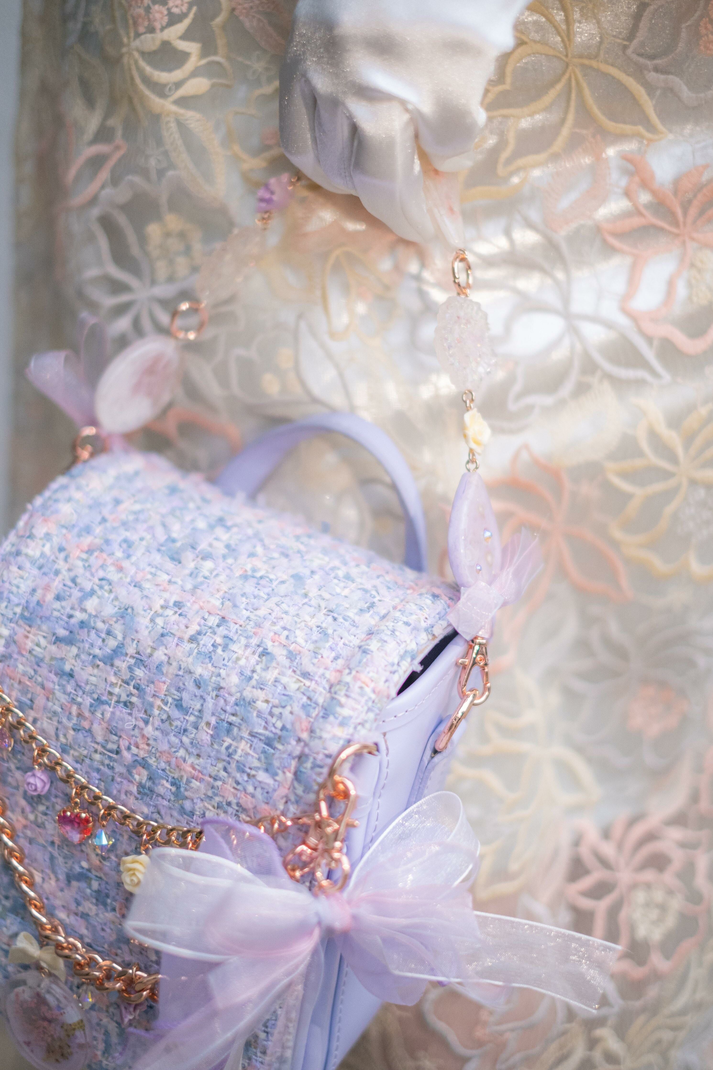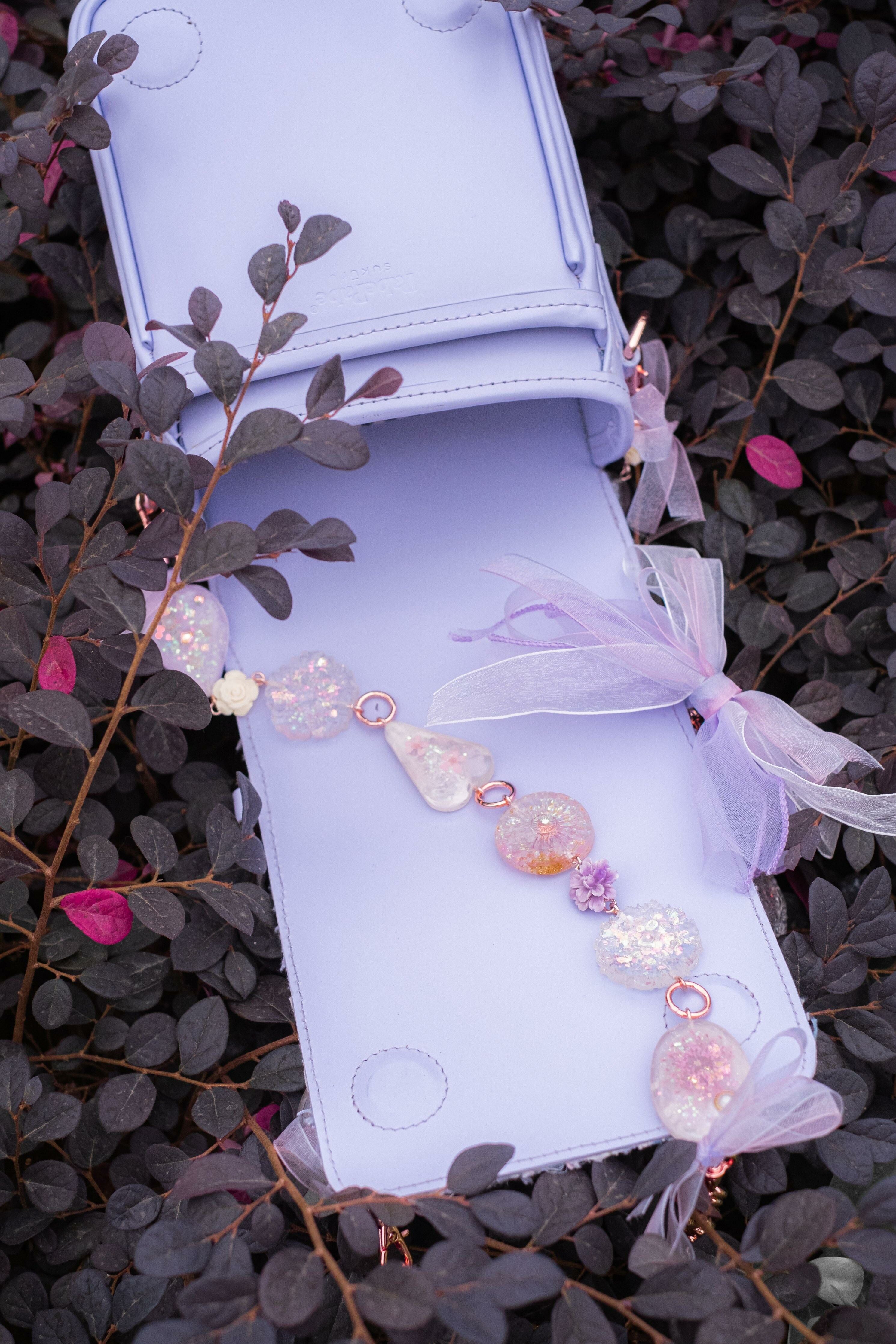 Pamycarie手製的肩帶和袋子吊飾,所使用的是我們香港手工製作的樹脂吊飾,再一顆顆組合成可拆式袋子配飾。每顆也有乾花、亮片和暈染顏料營造不同的意境,另外也加入巴洛克裝飾風格元素配件,絲帶蝴蝶結和施華洛水晶。將所有東西連接就成為閃閃發亮的復古飾帶,猶如多用途的飾物把袋子裝飾起來,令袋子成為一件藝術品。