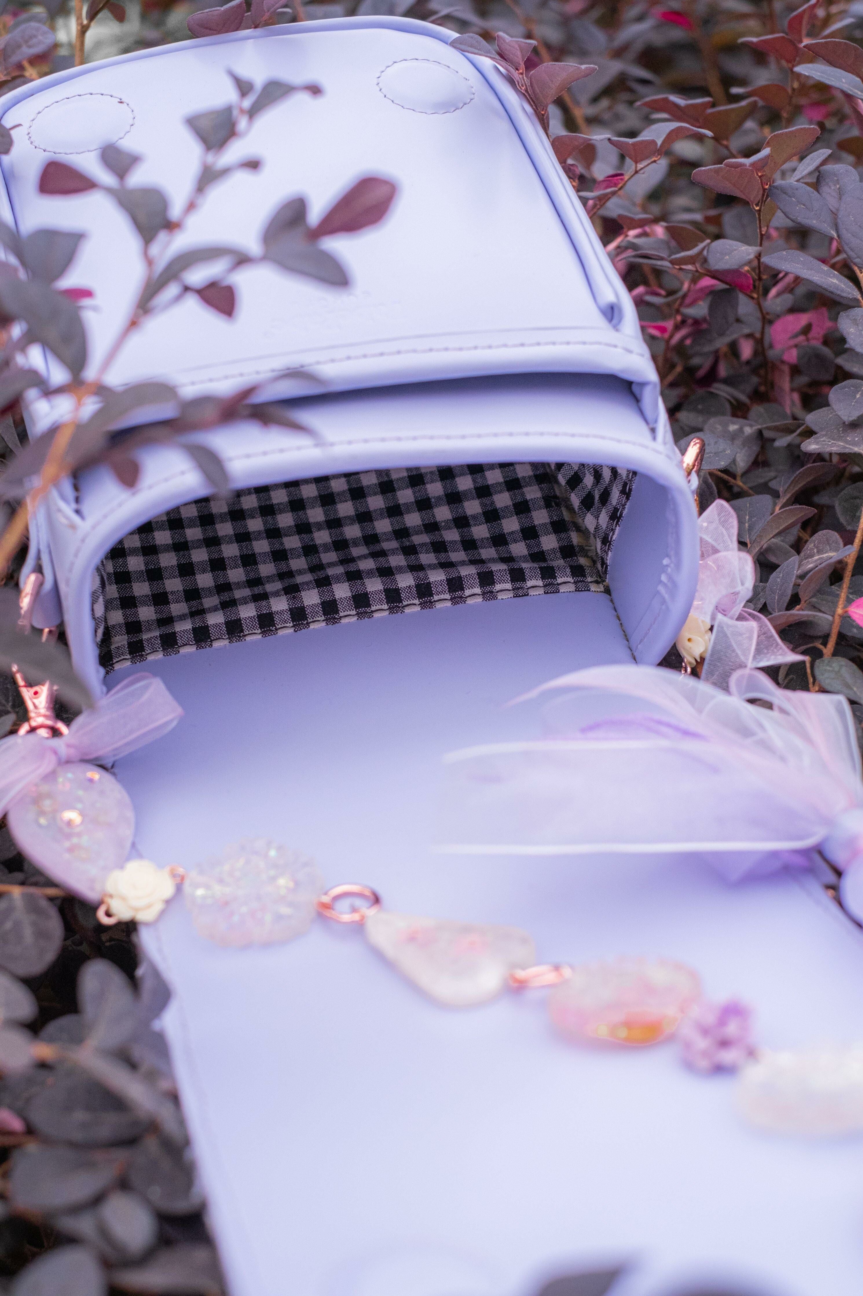 配上PabePabe的經典SUKURU Classic 小書包款式,成為現代和復古古典的浪漫結合。除了最受歡迎的粉色經典皮製款式外,今次更首次推出彩紫織紋格仔布拼上紫色牛頭層皮,再配上玫瑰金五金扣,製成一個可愛而又浪漫無比的 mix & match 款式。