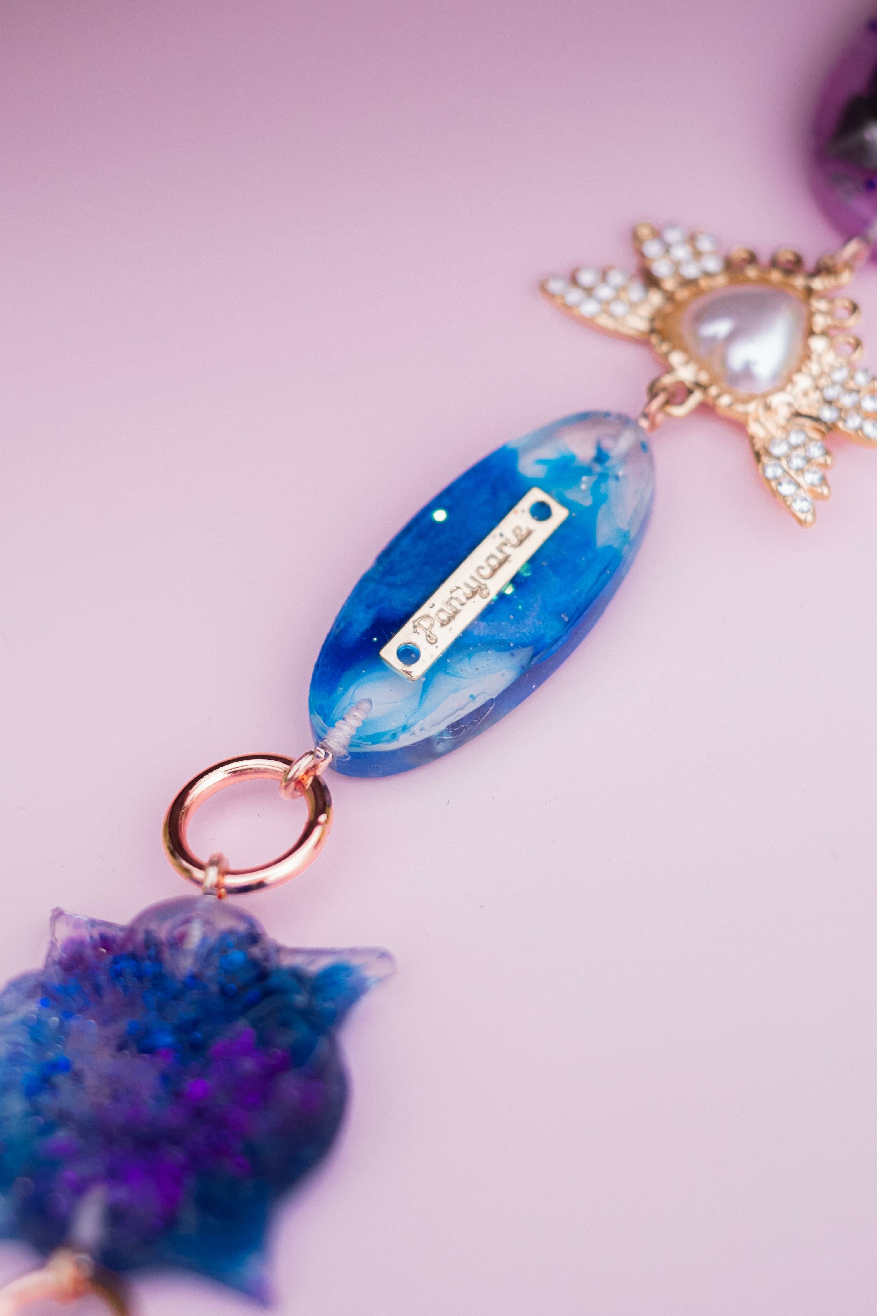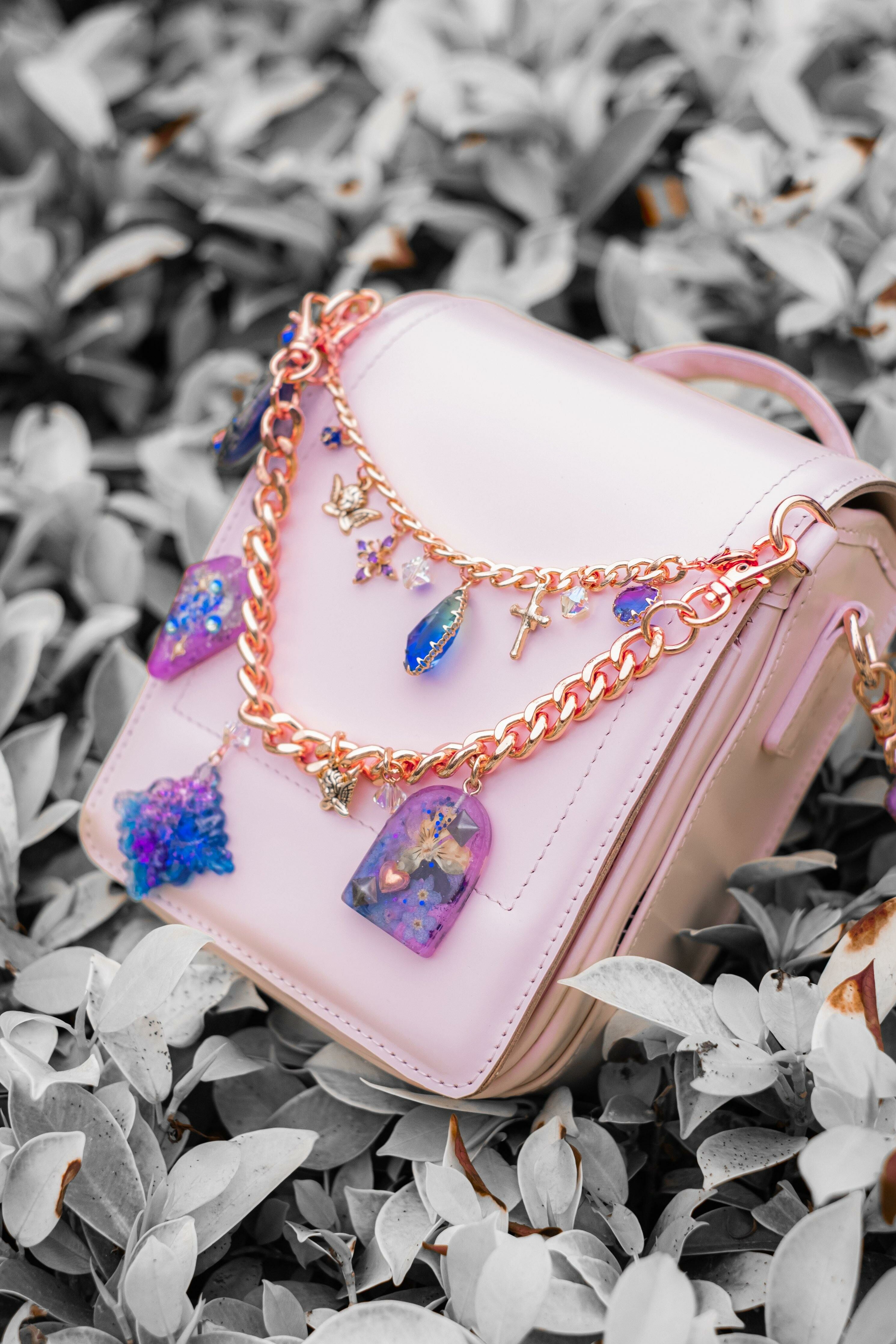 Pamycarie手製的肩帶和袋子吊飾,所使用的是我們香港手工製作的樹脂吊飾,再一顆顆組合成可拆式袋子配飾。每顆也有乾花、亮片和暈染顏料營造不同的意境,另外也加入巴洛克裝飾風格元素配件,絲帶蝴蝶結和施華洛水晶。將所有東西連接就成為閃閃發亮的復古飾帶,猶如多用途的飾物把袋子裝飾起來,令袋子成為一件藝術品。