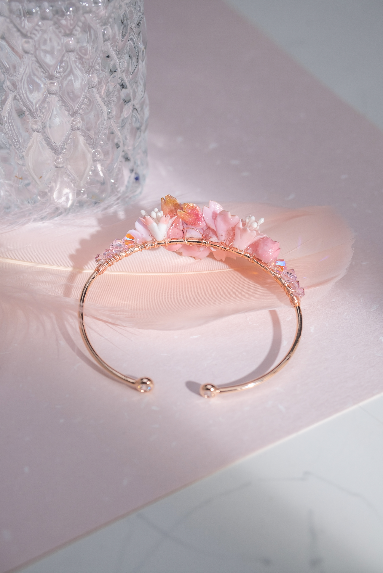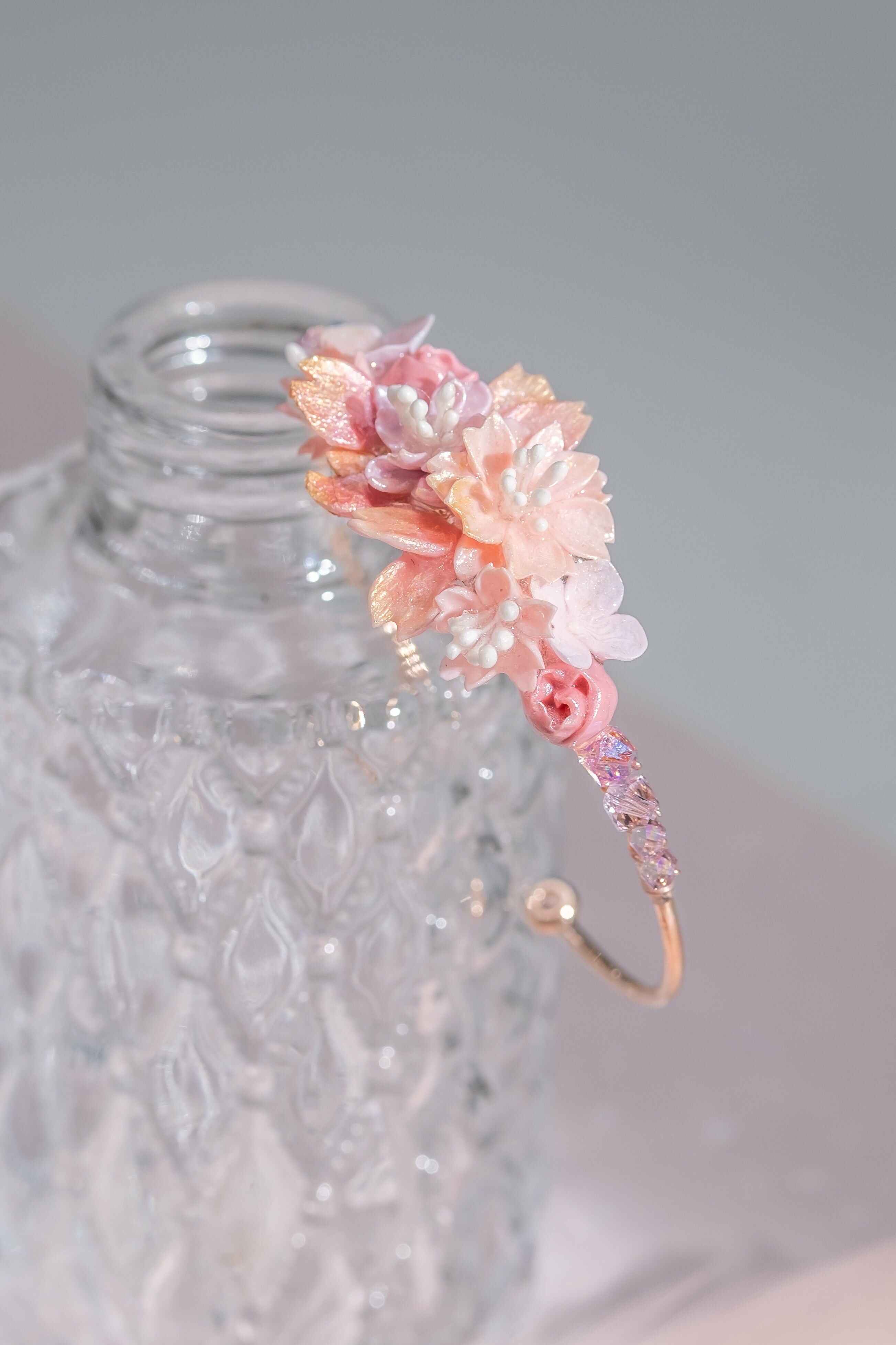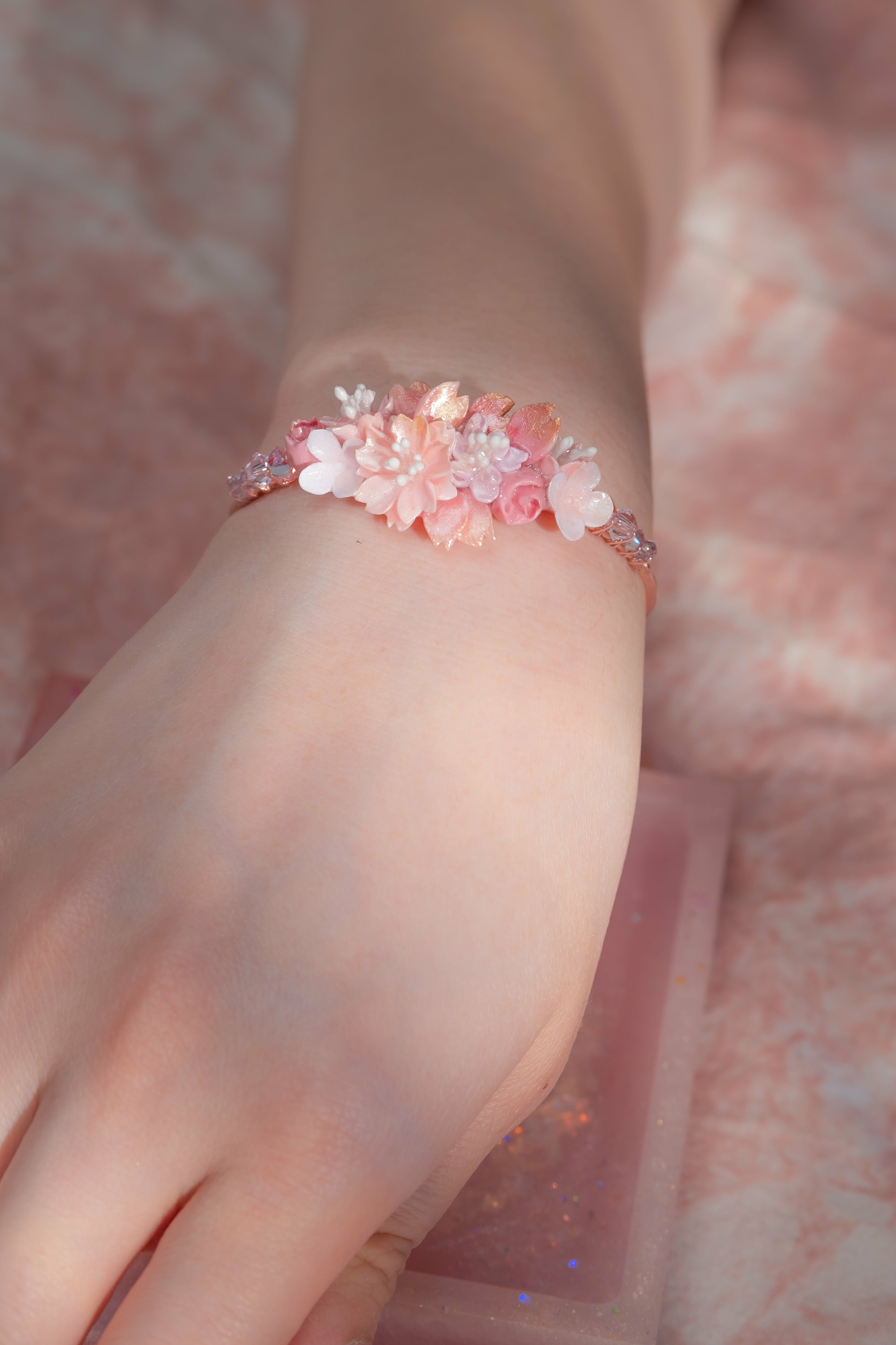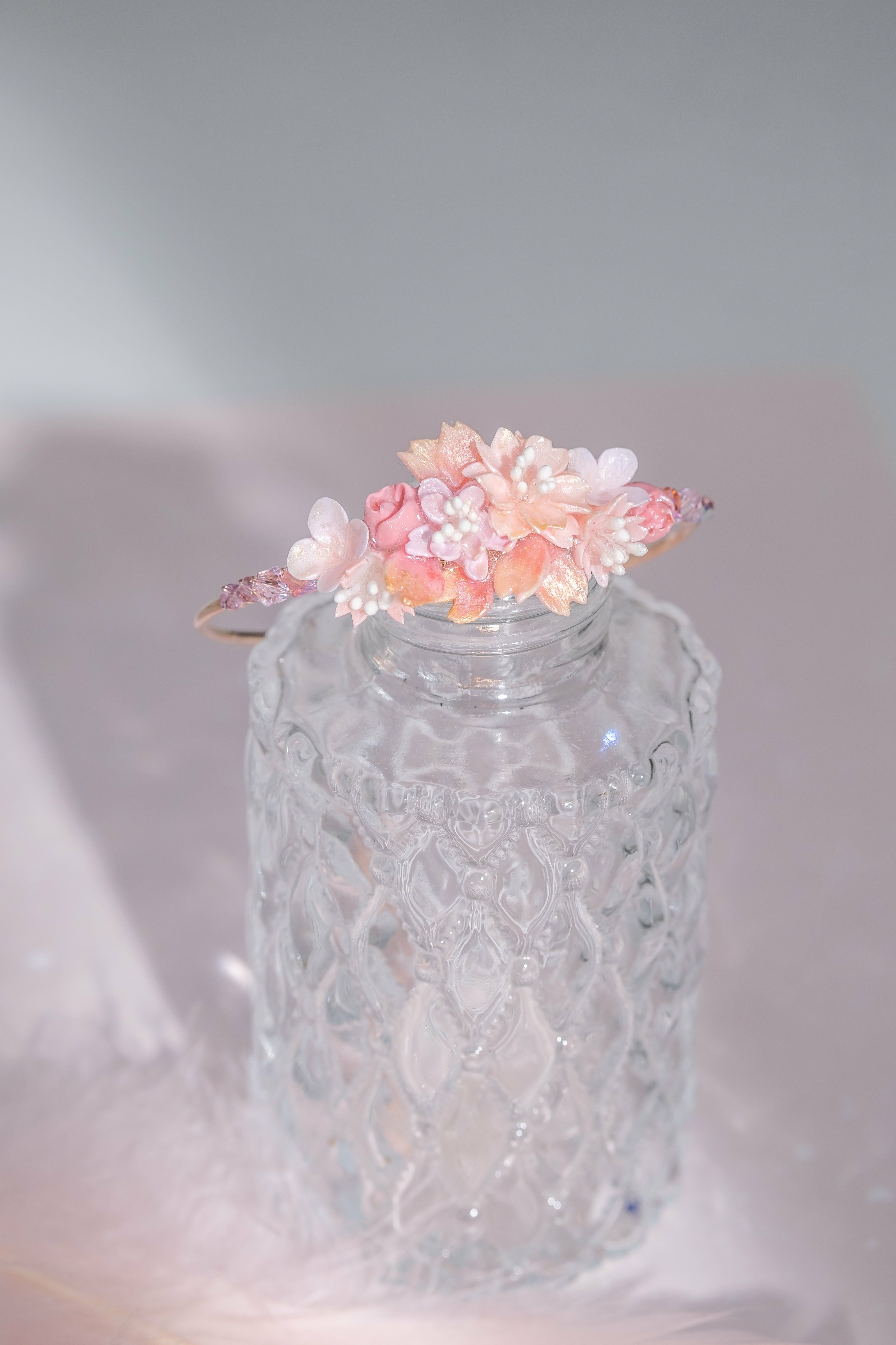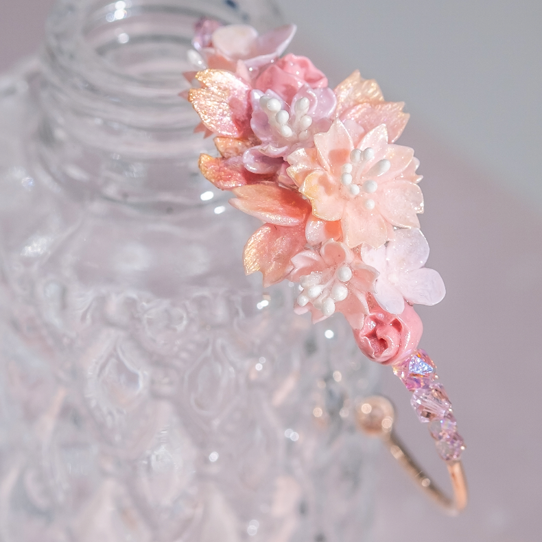 美國進口Beadsmith純銀線 | 施華洛世奇水晶 | 粉紅鋯石 | 手製樹脂黏土花 | UV強化保護層 | 鍍金手鐲