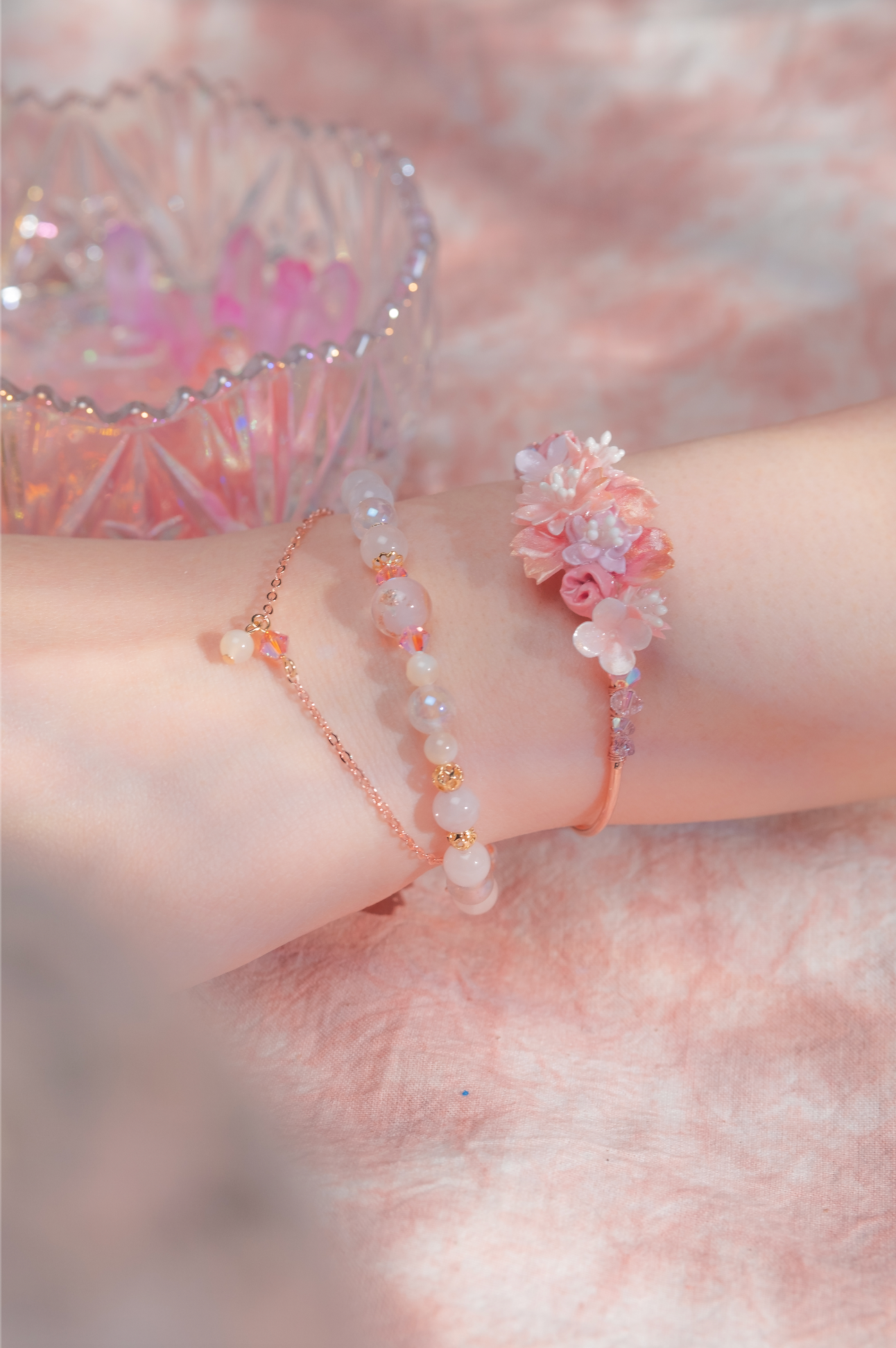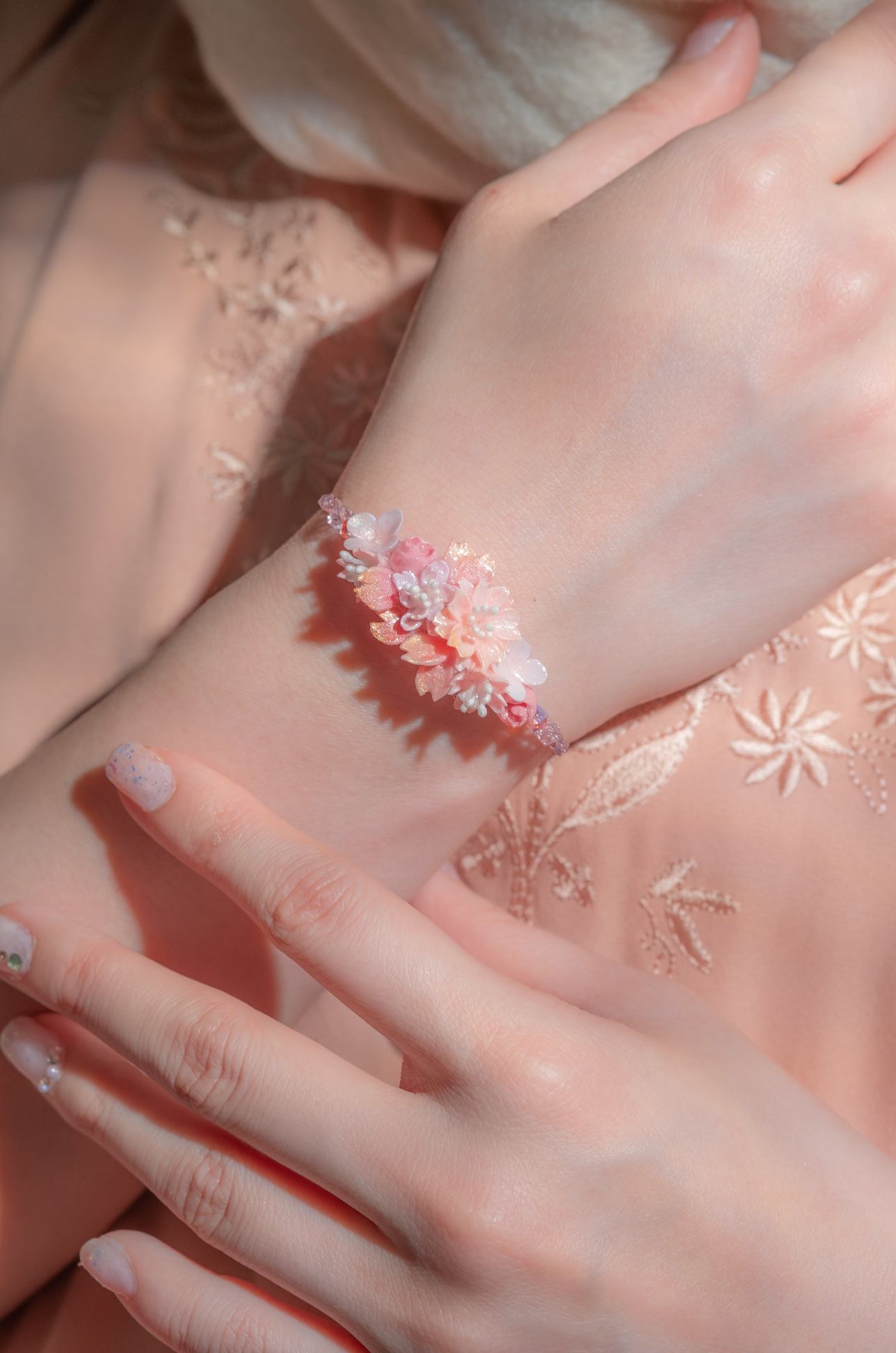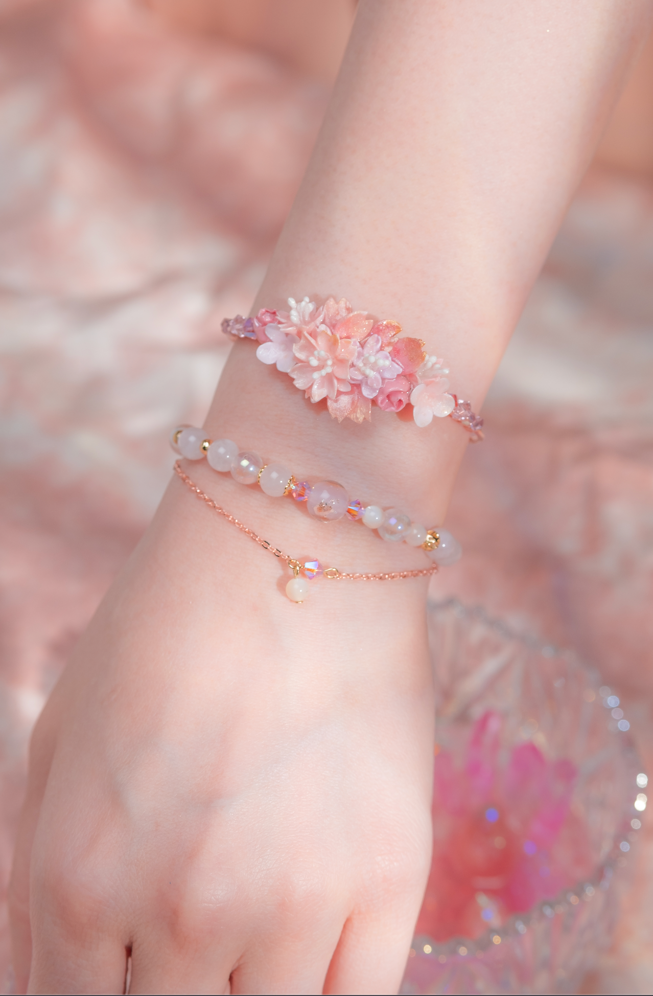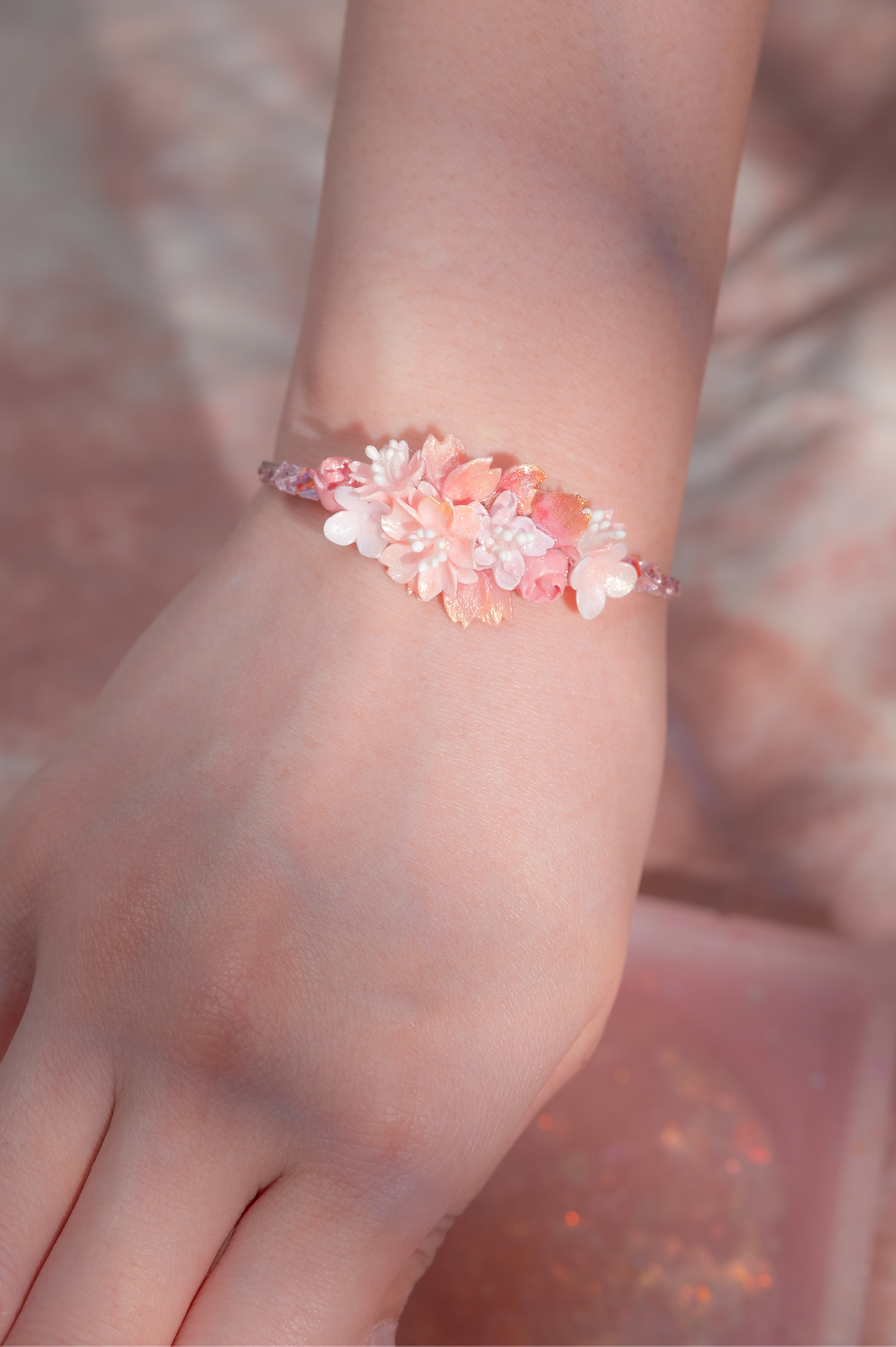 美國進口Beadsmith純銀線 | 施華洛世奇水晶 | 粉紅鋯石 | 手製樹脂黏土花 | UV強化保護層 | 鍍金手鐲