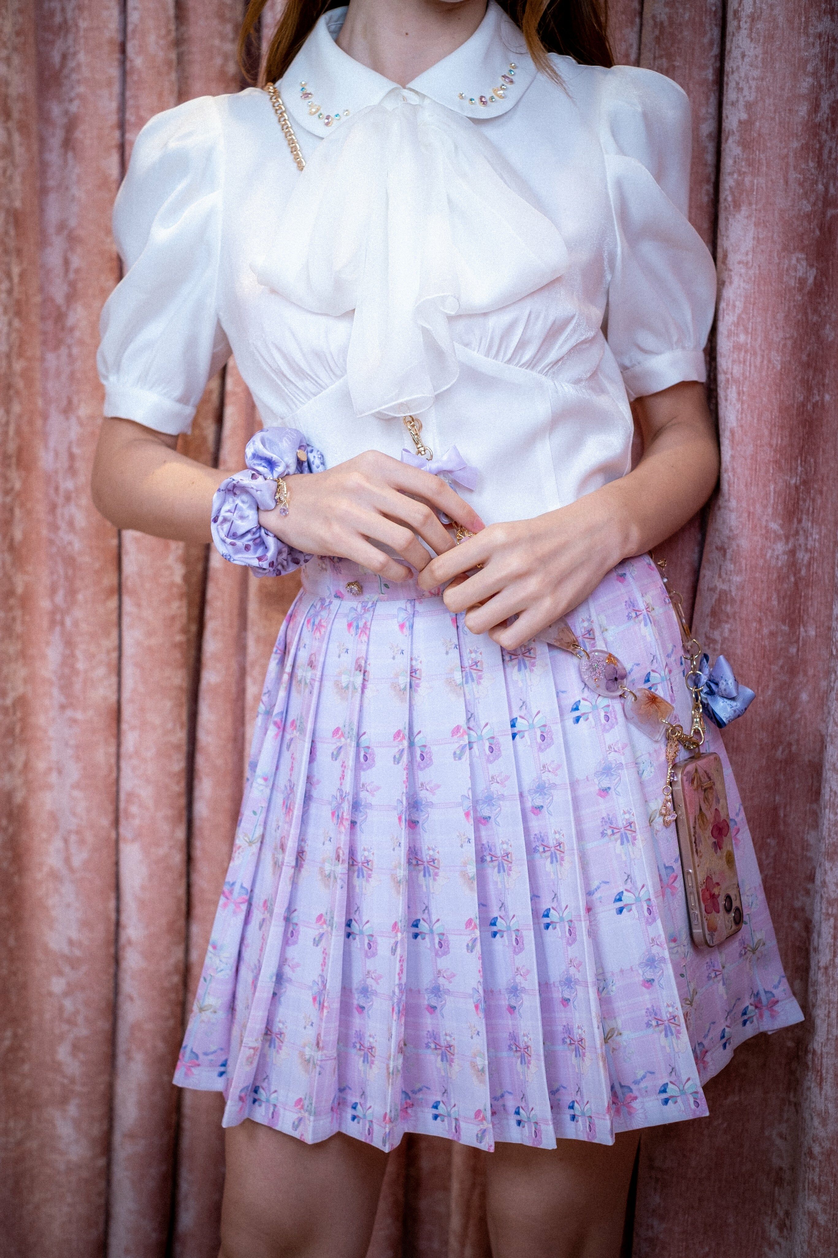 Pleated Skirt with Detachable Pendant (Pattern/Dusty Pink/Black)