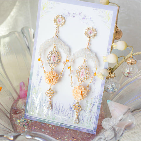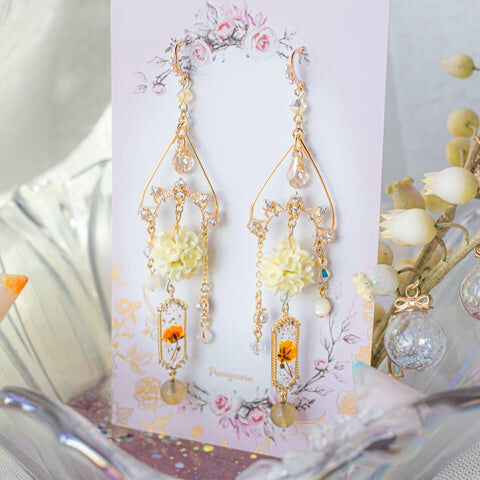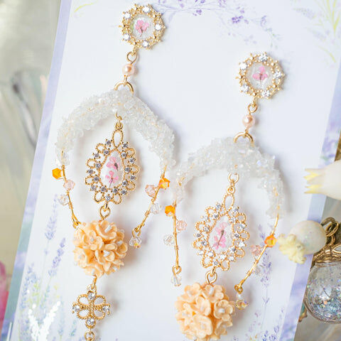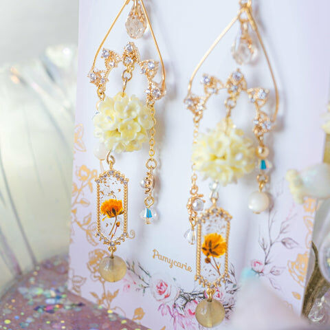 鍍金線 | 施華洛世奇水晶 | 手製樹脂黏土花 | UV膠強化保護層 | 鍍金925純銀耳釘