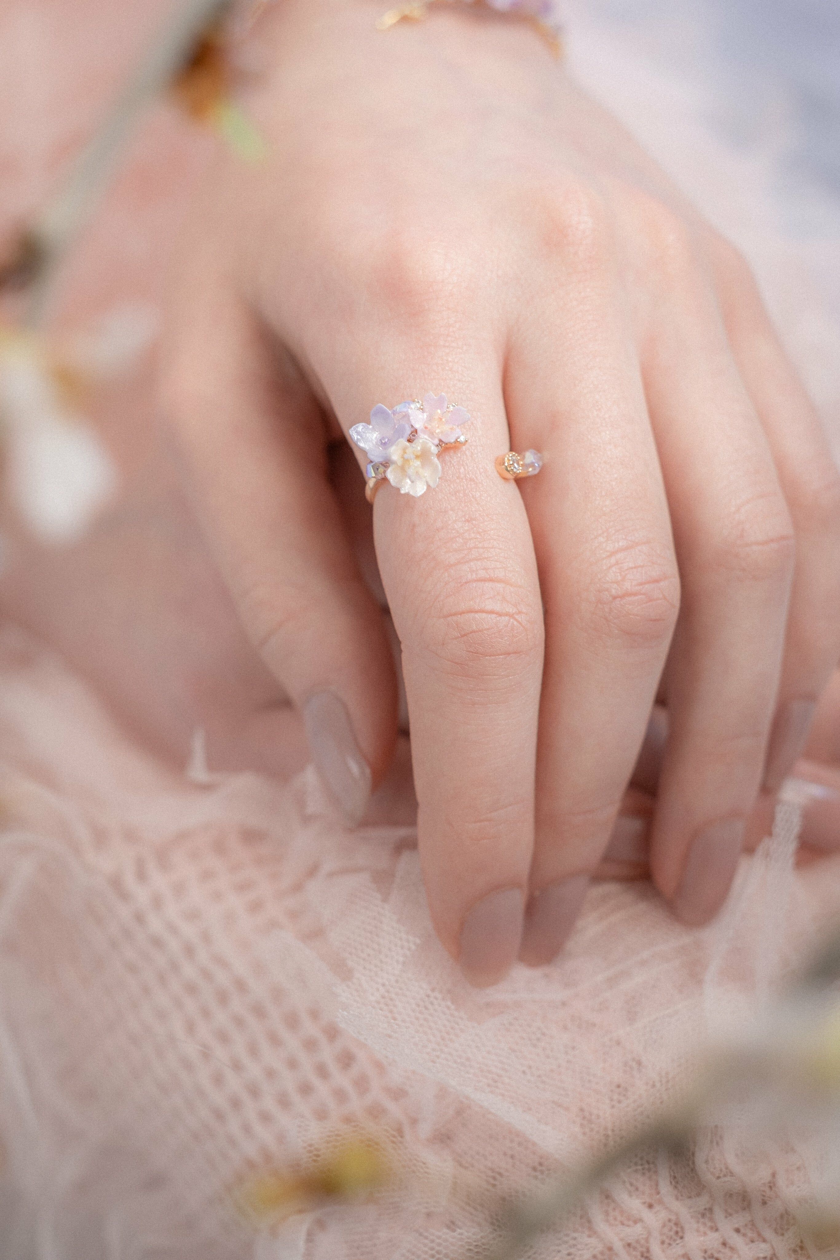 讓生命悄悄綻放於妳的指尖,時刻於將美好收於心頭。從半開到滿開櫻花,這款戒指將生命進程濃縮成美好風光,由你一人獨賞。開口式戒指適合大部份指圍,可因應配戴的位置作出調整。