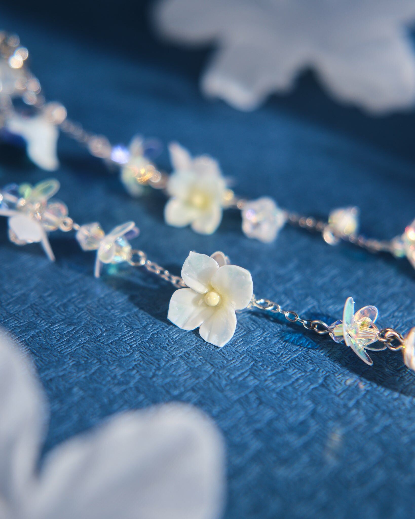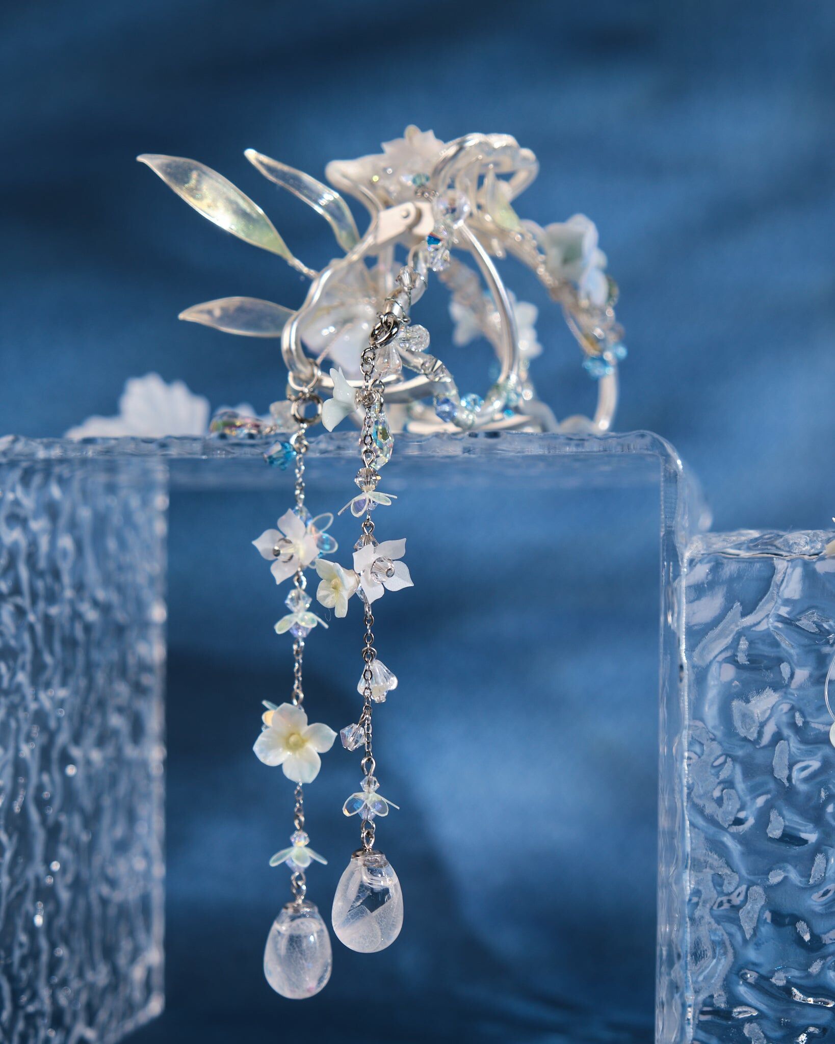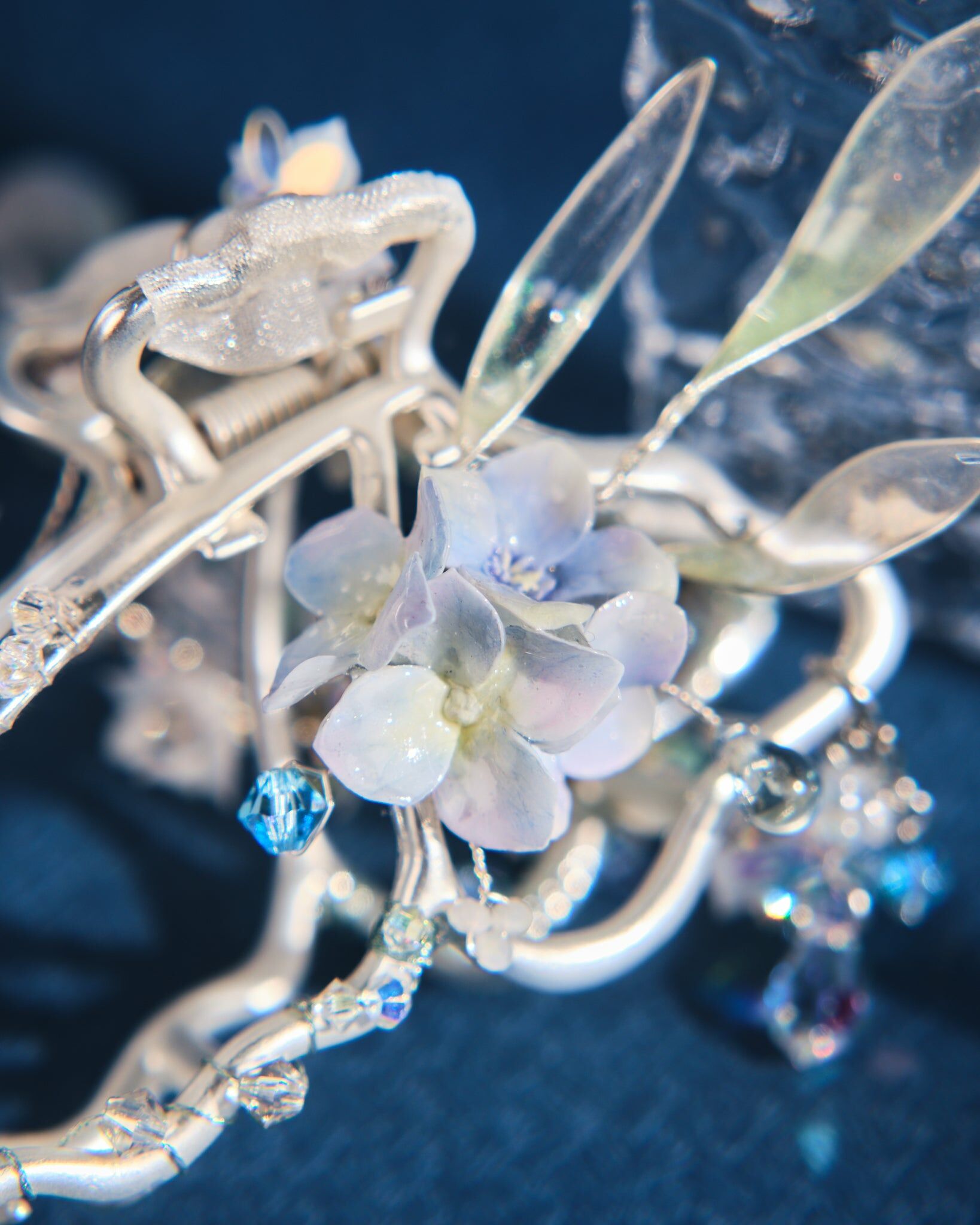 The Hydrangea is tough and fragile at the same time. The heart of a fair lady exactly shares such contradictory and complex nature Pamycarie presents the refreshing summer collection featuring the Hydrangea. The bloomy flowers in the garden and woods cools people off with a touch of blue. As miraculous as it is, the Hydrangea is a mirror of the soil and water. Its colours vary depending on the acidity of the soil. Water is also crucial to all species, not to mention the Hydrangea. The flower soon withers once it is away from water. Still, if it is hydrated promptly, it rejuvenates and shows its true colours.. The Hydrangea owns the exquisite beauty of its dreamy gradient colours. The production team studied the form and characteristics of the Hydrangea thoroughly. Displaying the rawest gradient, the artisans adopted the mixed-colour resin clay despite the time-consuming procedure. Filigree along with the embellished hand-painted globule highlight the filminess of the designs. The soil is indispensable to the flowers, which genuinely showcase the attributes of it.