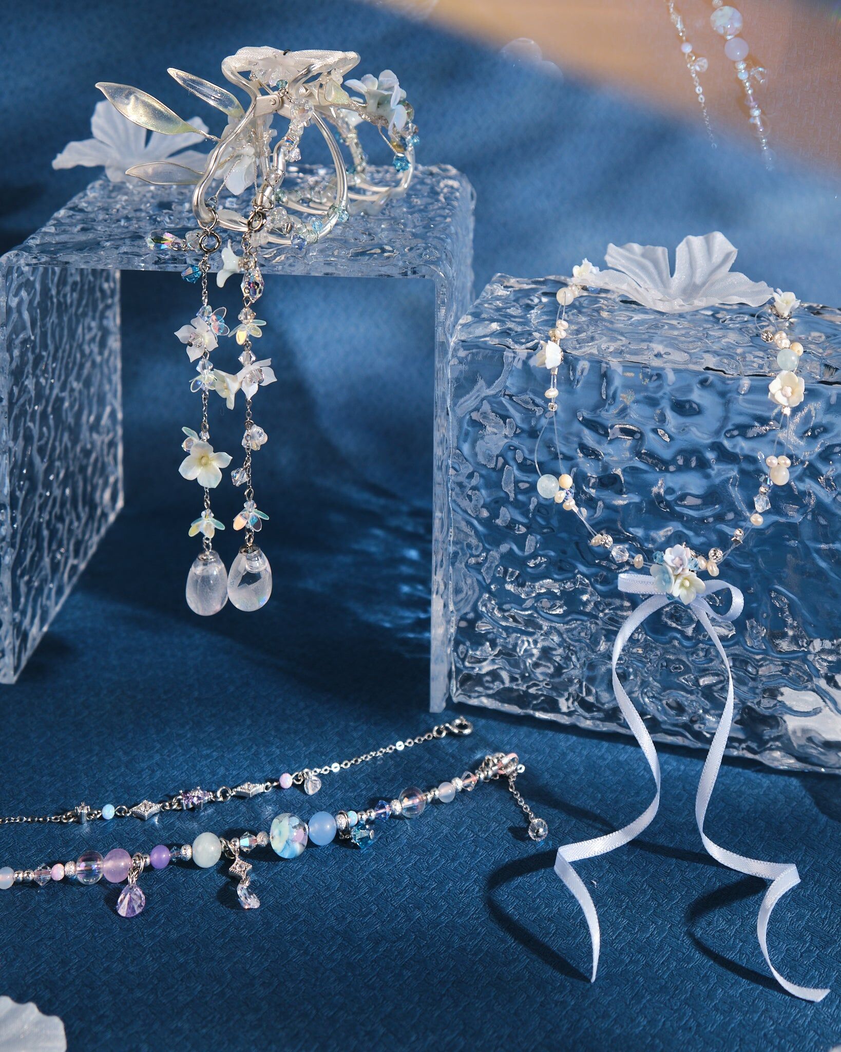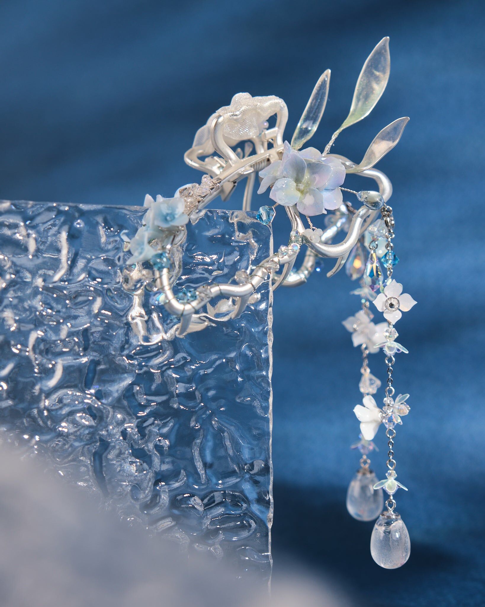 圓潤的雲朵形狀鯊魚夾為作品增添了可愛感覺,它也是鯊魚夾家族向來少有的銀色成員,清秀的銀色配搭粉藍色繡球花,本來就已經十分好看了,重點更是垂下的兩組飾鍊,簡單一夾已經帶出脫俗的感覺!就像活生生的仙子從童話書內走出來一樣。