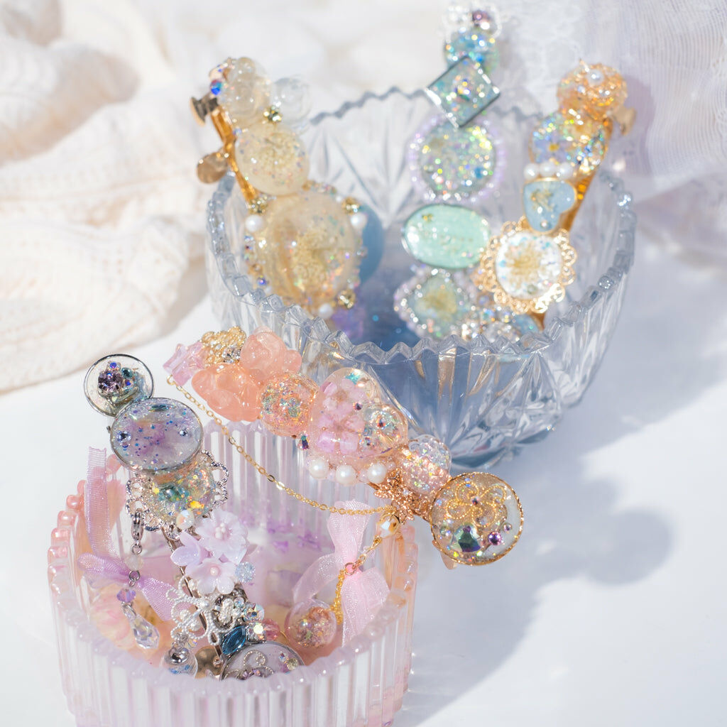 鍍金線 | 施華洛世奇水晶 | 手製樹脂黏土花 | UV膠強化保護層 | 金屬髮夾